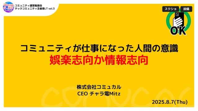 Java ・ JavaScript ・ Python など • IoTやブロックチェーン関連の開発経験 • 年間200以上コミュニティイベントに参加 • 登壇経験 200回以上 ファシリテート 600回以上 • コミュニティイベント運営 700回以上 • エンジニア経験&コミュニティ活動きっかけで起業 数百名から数千名のコミュニティがメイン 多いものでは1万人以上のコミュニティを推進・サポート 2B、2C、趣味コミュ、社内コミュなど多数運営中 コミュニティ運営勉強会・コミュマネラボ 主催 CMX Connect TOKYO 運営メンバー CLS高知 運営メンバー コミュワン 運営メンバー コミュ学 主催 などなど 元エンジニア、テックコミュニティ運営が きっかけで起業に至った人間です!