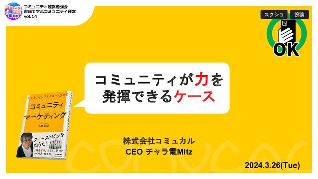 Java ・ JavaScript ・ Python など • IoTやブロックチェーン関連の開発経験 • 年間200以上コミュニティイベントに参加 • 登壇経験 200回以上 ファシリテート 500回以上 • コミュニティイベント運営 600回以上 • エンジニア経験&コミュニティ活動きっかけで起業 数百名から数千名のコミュニティがメイン 多いものでは1万人以上のコミュニティを推進・サポート中 2B、2C、趣味コミュ、社内コミュなど多数運営中 コミュニティ運営勉強会 主催 CMX Connect TOKYO 運営メンバー CLS高知 運営メンバー などなど コミュニティのプロやってます!