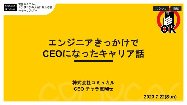 エンジニアきっかけで CEOになったキャリア話 株式会社コミュカル CEO チャラ電Mitz 2023.7.22(Sun) 言語カクテルと エンジニアの人生に触れる夜 〜キャリアLT〜 x