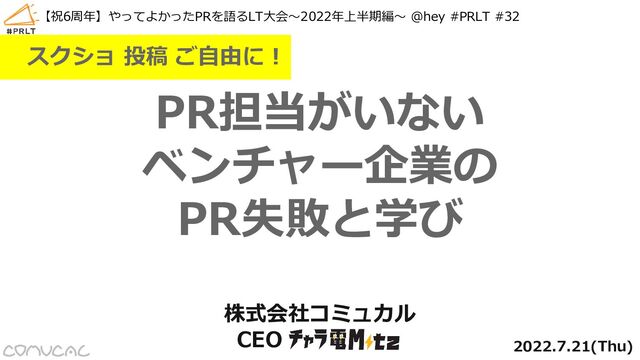 PR担当がいない ベンチャー企業の PR失敗と学び 2022.7.21(Thu) 株式会社コミュカル スクショ 投稿 ご自由に! CEO 【祝6周年】やってよかったPRを語るLT大会~2022年上半期編~