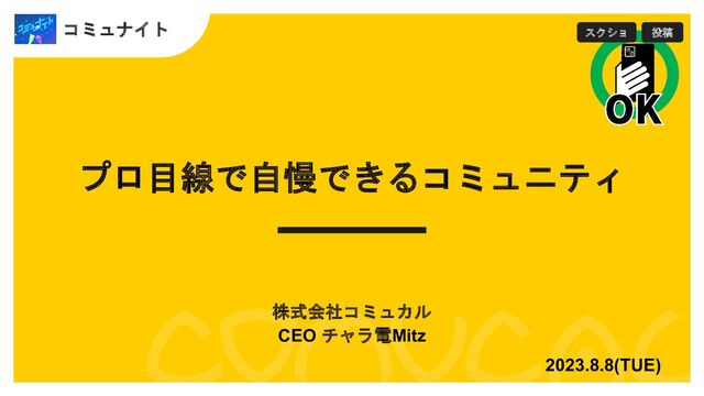 プロ目線で自慢できるコミュニティ 株式会社コミュカル CEO チャラ電Mitz 2023.8.8(TUE) コミュナイト x スクショ 投稿