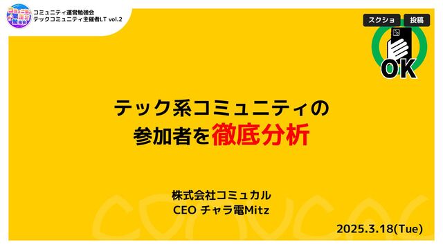 Java ・ JavaScript ・ Python など • IoTやブロックチェーン関連の開発経験 • 年間200以上コミュニティイベントに参加 • 登壇経験 200回以上 ファシリテート 600回以上 • コミュニティイベント運営 700回以上 • エンジニア経験&コミュニティ活動きっかけで起業 数百名から数千名のコミュニティがメイン 多いものでは1万人以上のコミュニティを推進・サポート 2B、2C、趣味コミュ、社内コミュなど多数運営中 コミュニティ運営勉強会・コミュマネラボ 主催 CMX Connect TOKYO 運営メンバー CLS高知 運営メンバー コミュワン 運営メンバー コミュ学 主催 などなど 元エンジニア、テックコミュニティ運営が きっかけで起業に至った人間です!