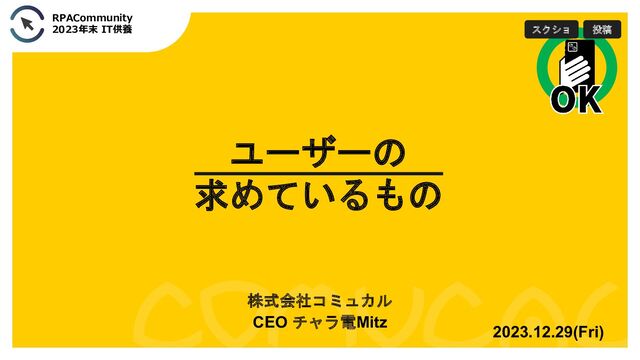 ユーザーの 求めているもの 株式会社コミュカル CEO チャラ電Mitz 2023.12.29(Fri) RPACommunity 2023年末 IT供養 x