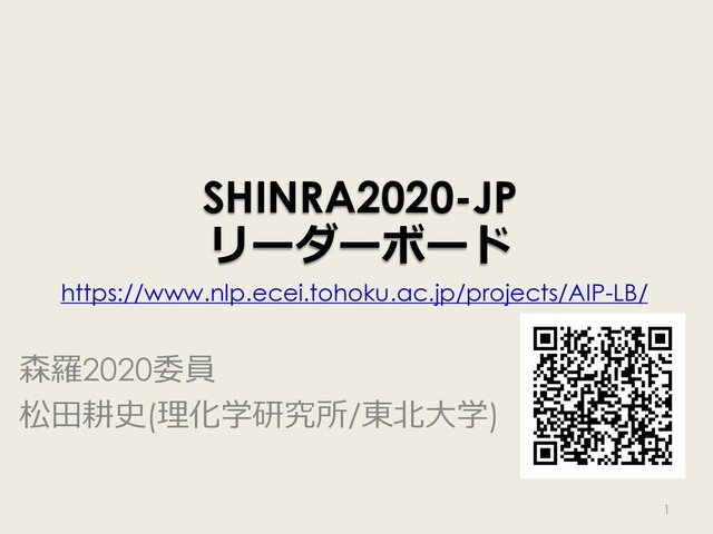SHINRA2020-JP リーダーボード 森羅2020委員 松⽥耕史(理化学研究所/東北⼤学) https://www.nlp.ecei.tohoku.ac.jp/projects/AIP-LB/ 1