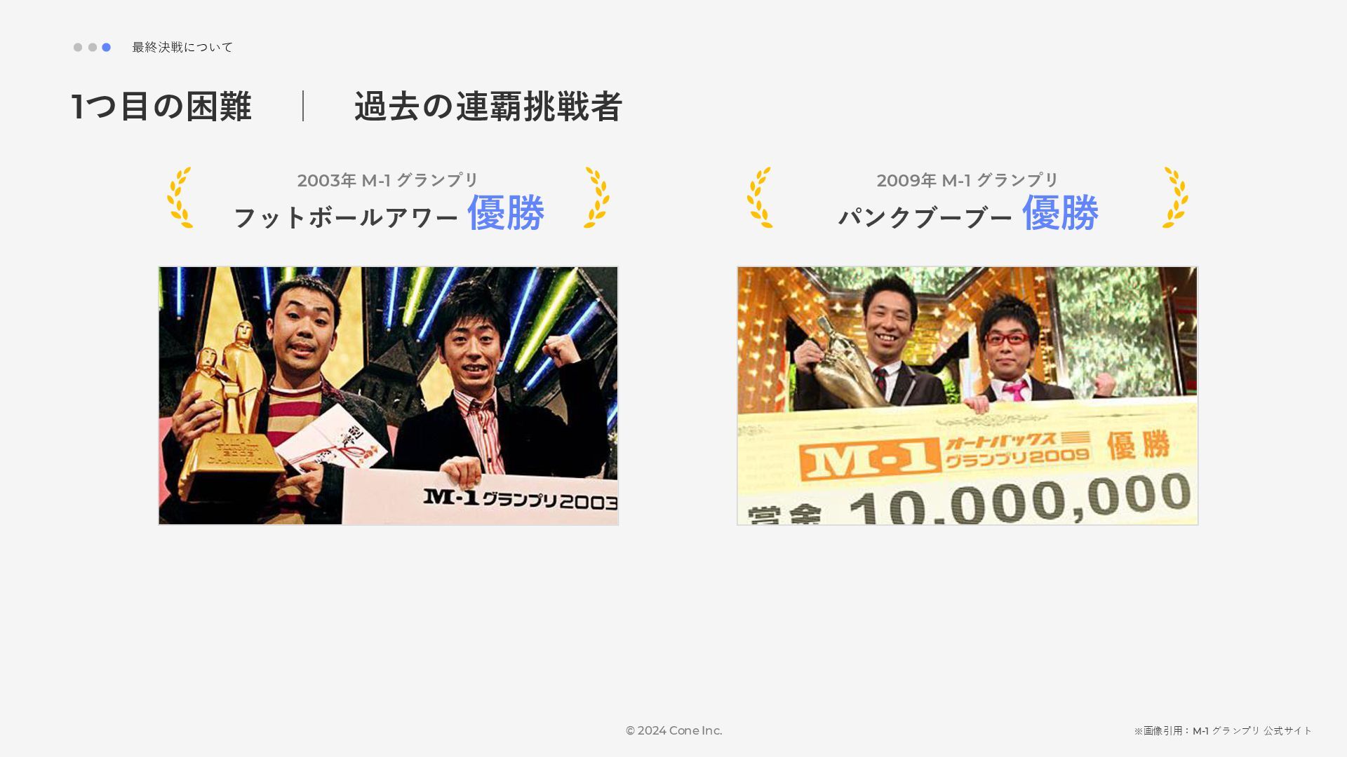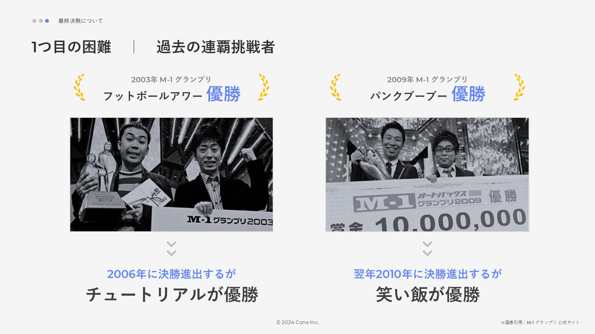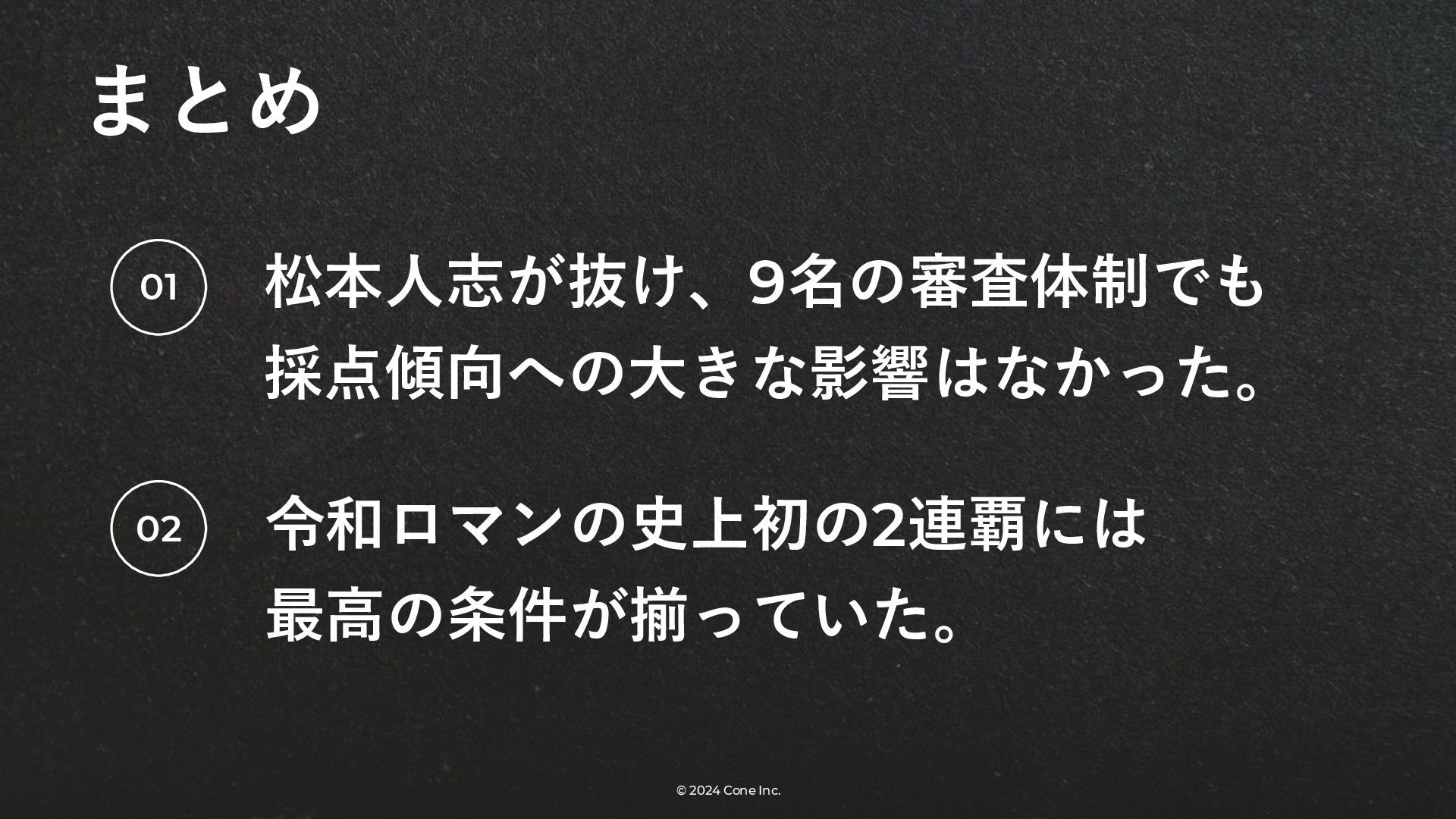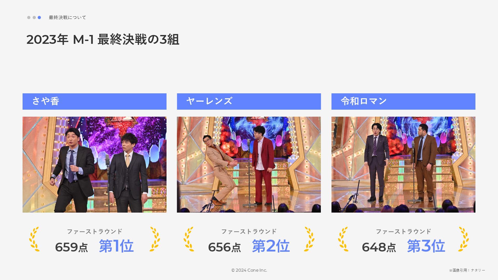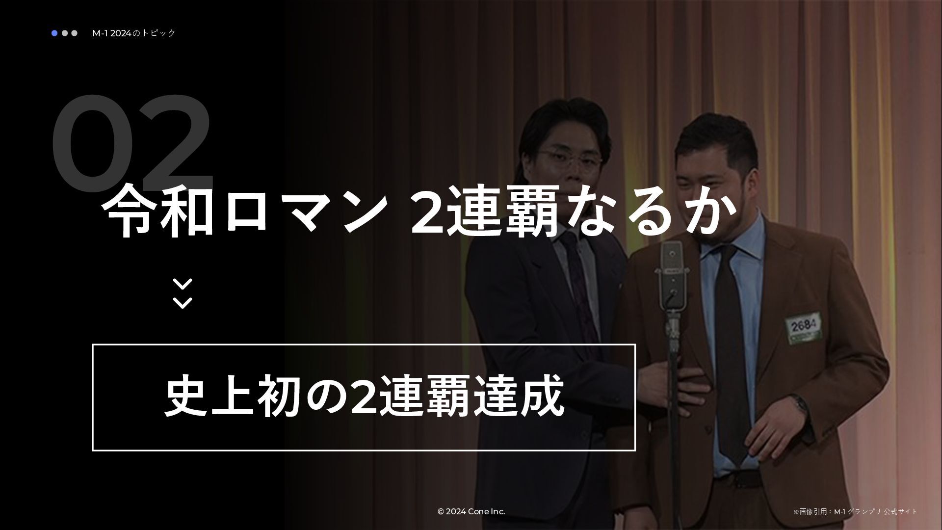 BtoBのコンテンツ制作支援を行う株式会社Coneが、得意の資料作成で今年のM-1を振り返りました。 「9名での審査体制は正解だったのか」「令和ロマンはなぜ2連覇を達成できたのか」について独自の視点で考察しています。
