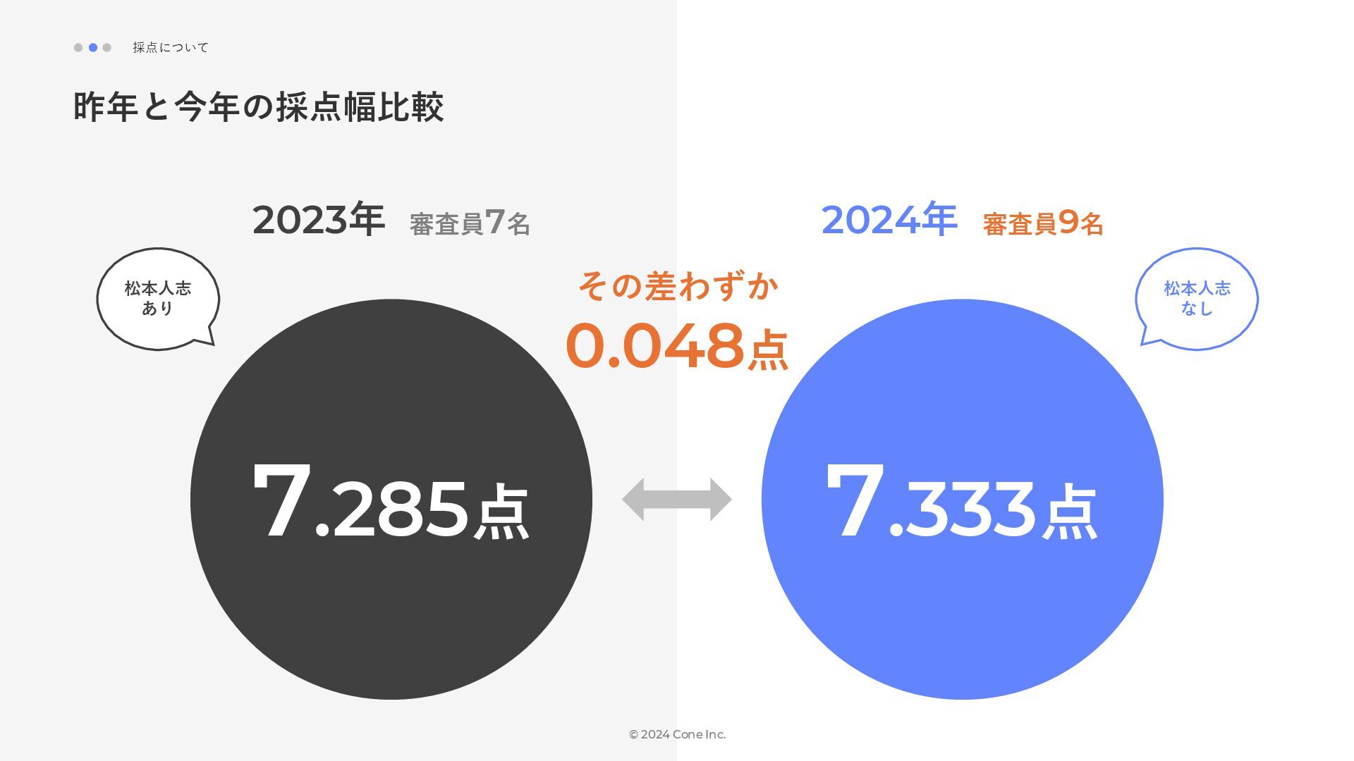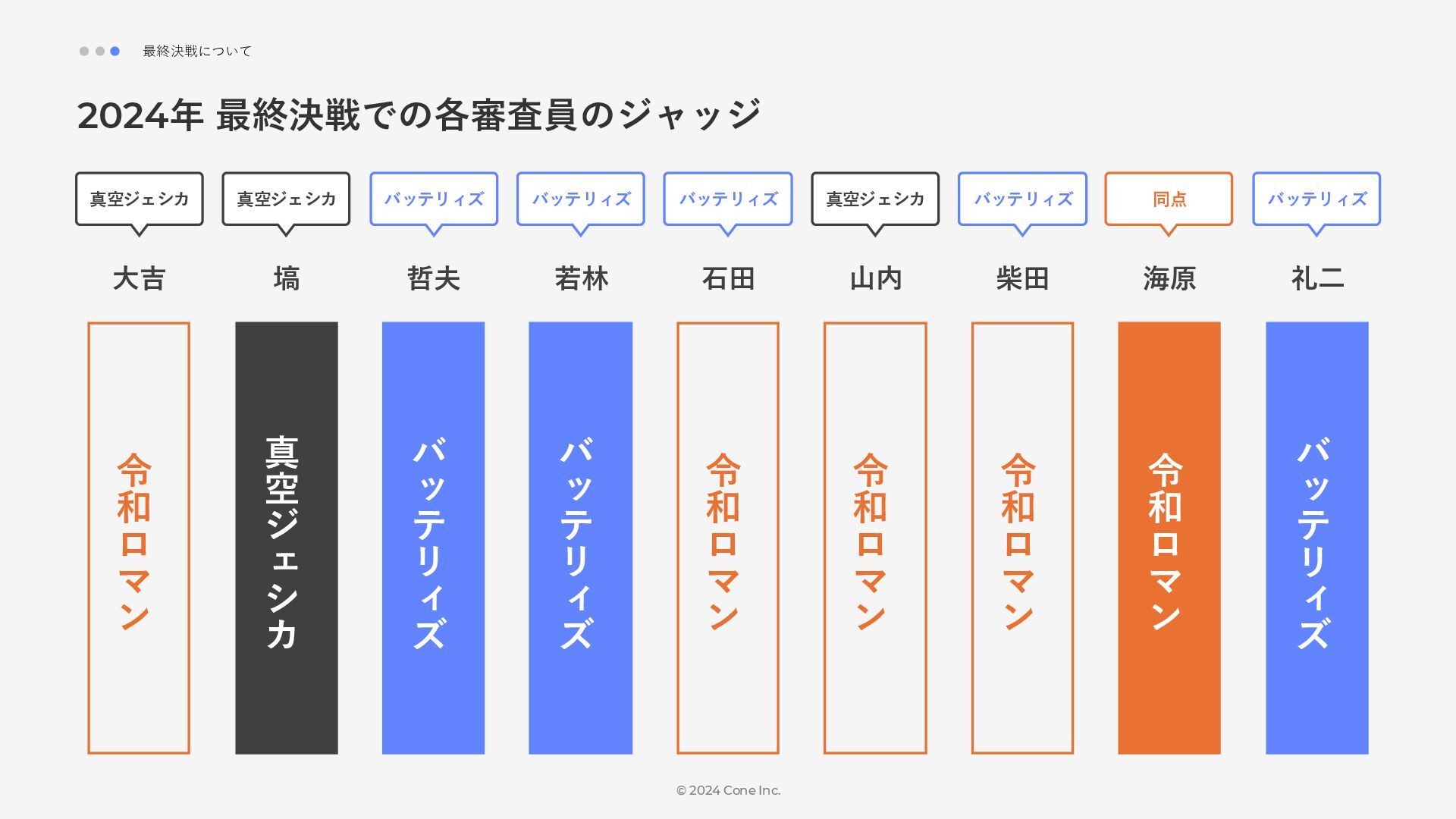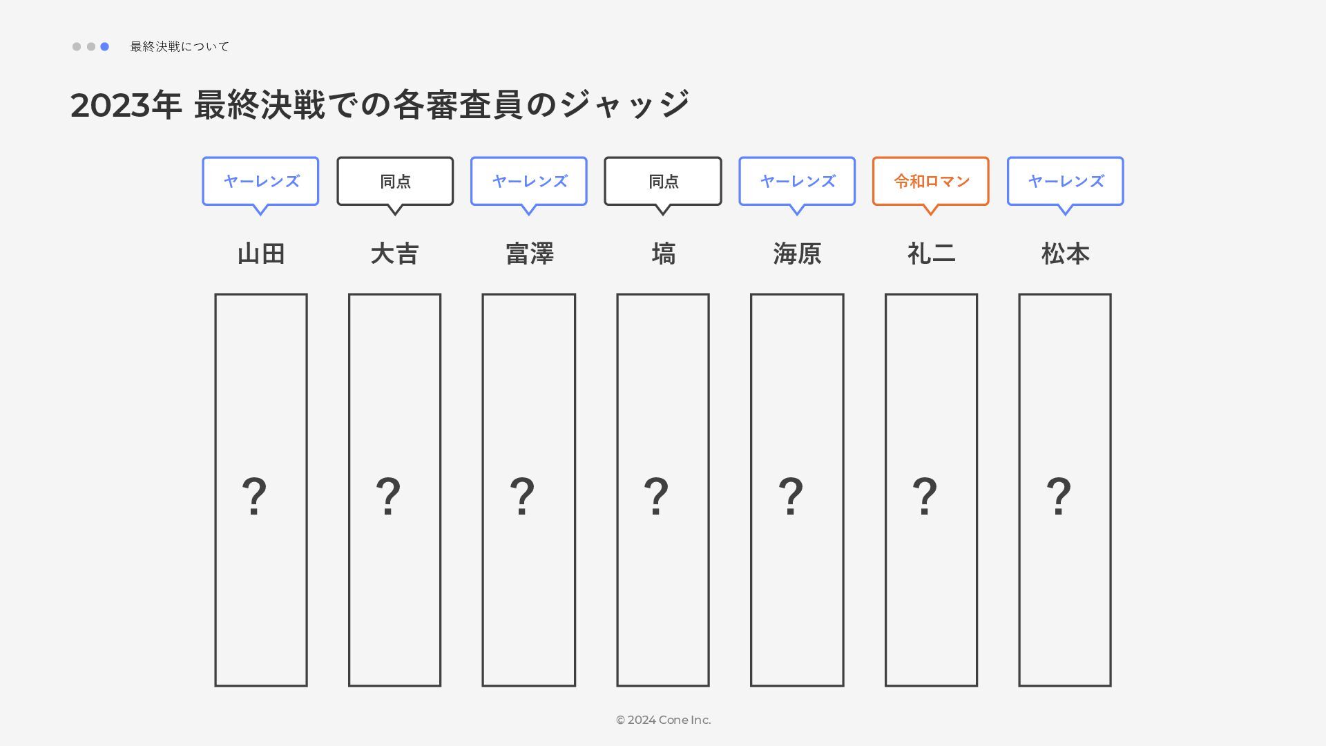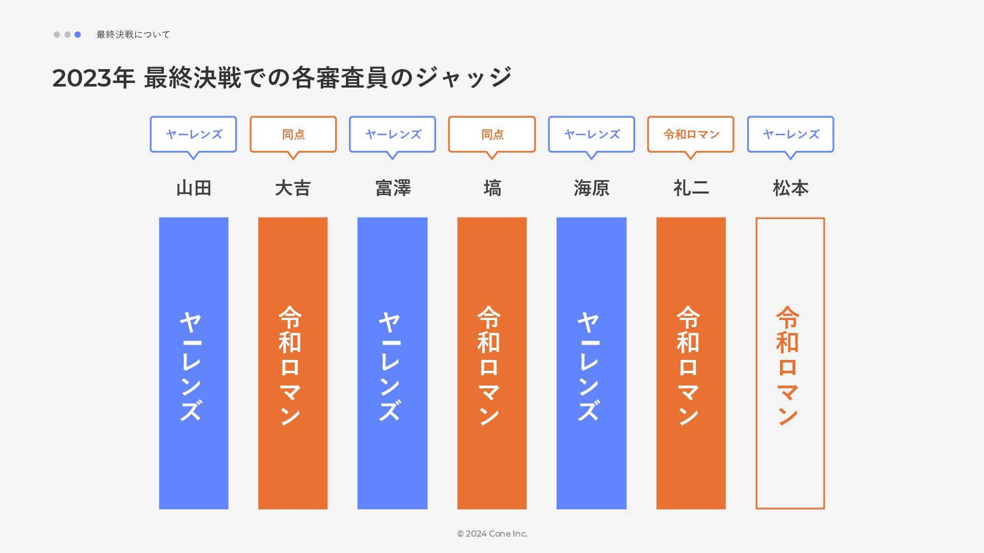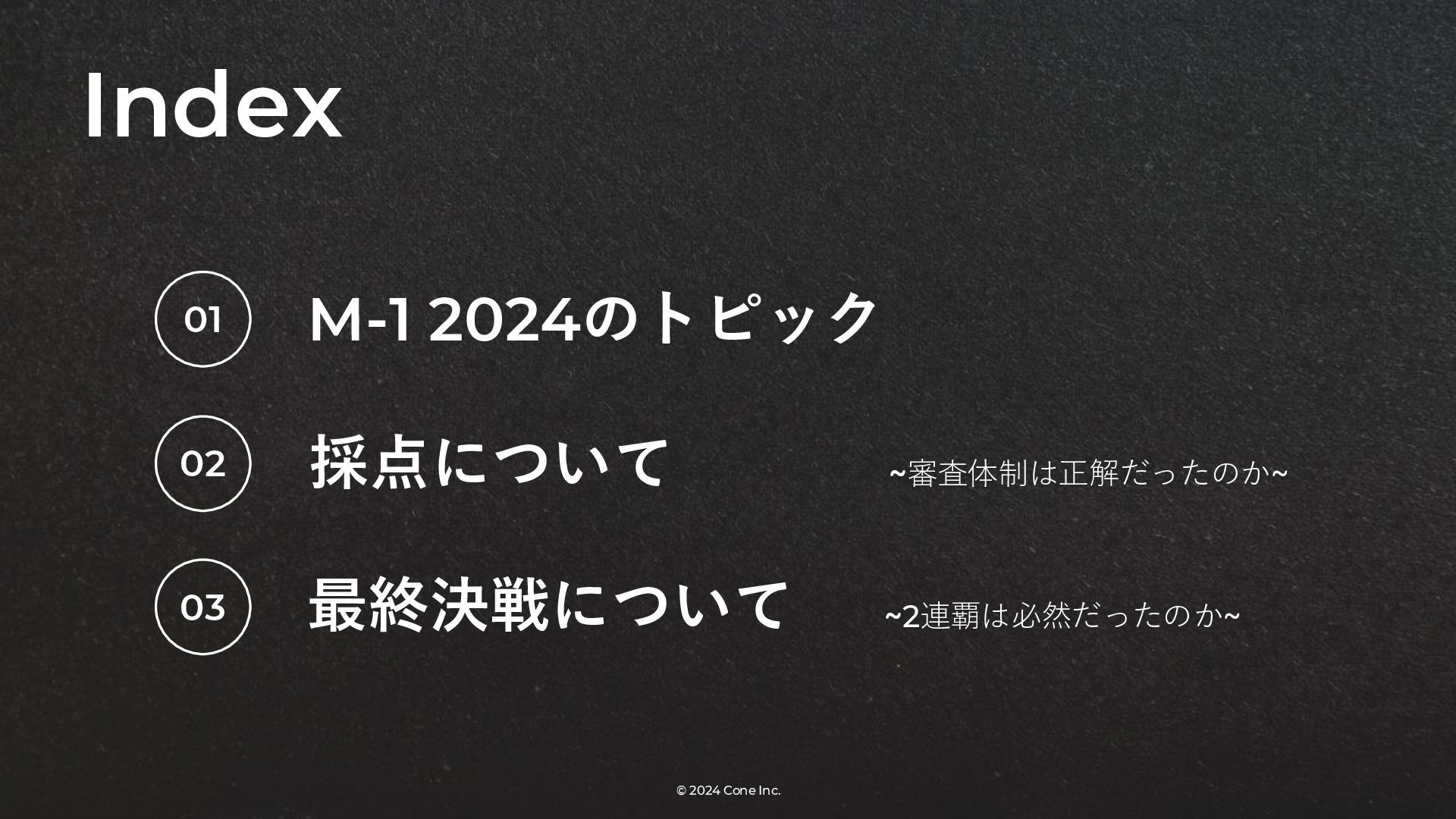 BtoBのコンテンツ制作支援を行う株式会社Coneが、得意の資料作成で今年のM-1を振り返りました。 「9名での審査体制は正解だったのか」「令和ロマンはなぜ2連覇を達成できたのか」について独自の視点で考察しています。