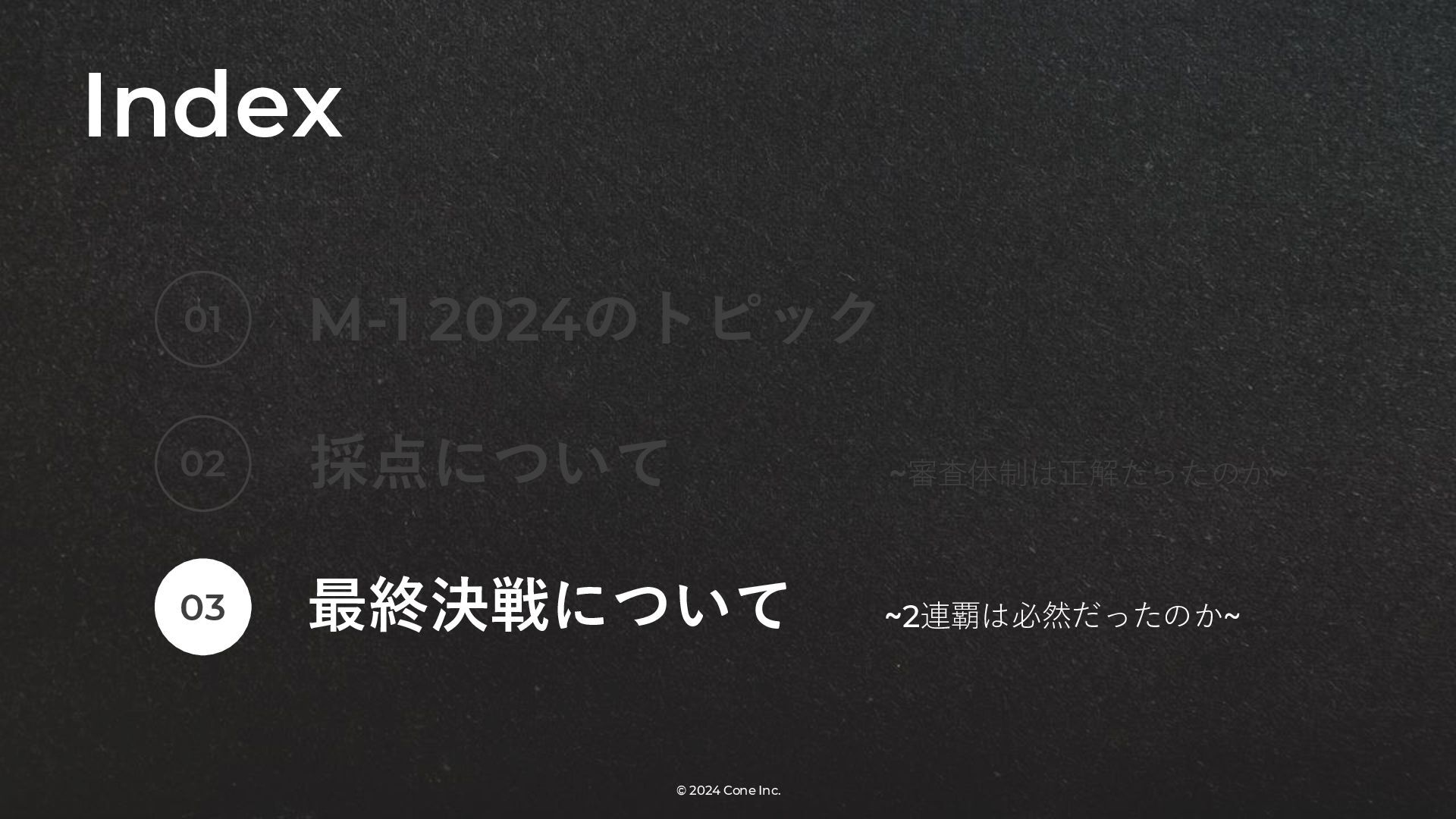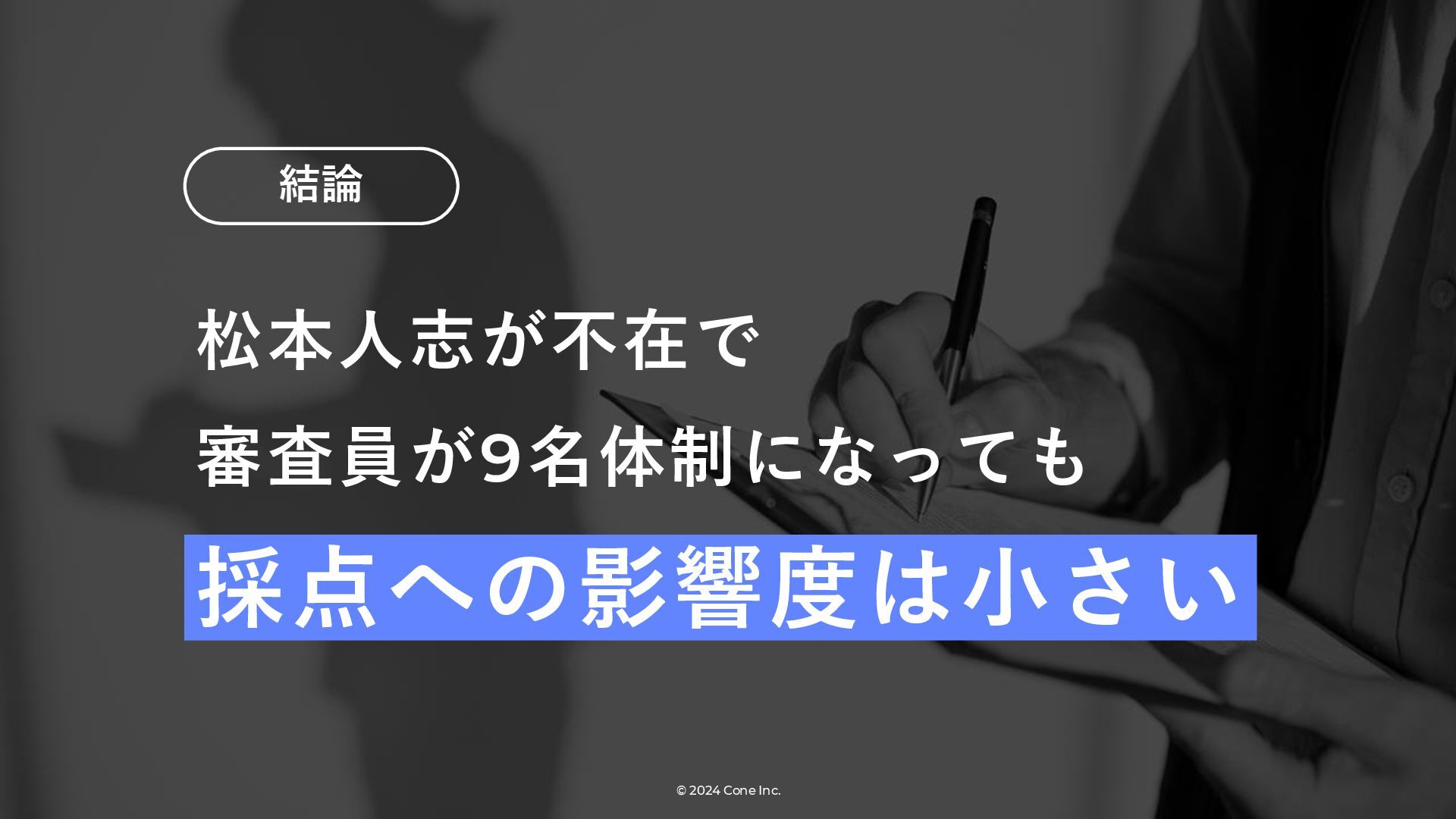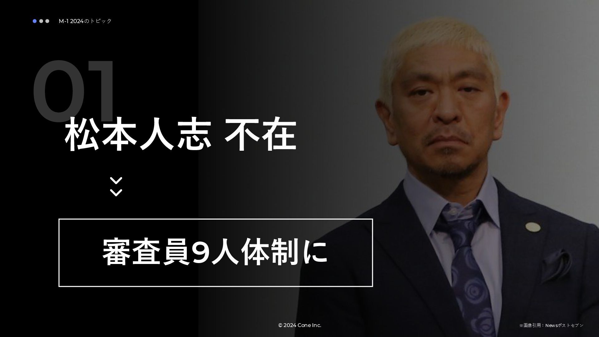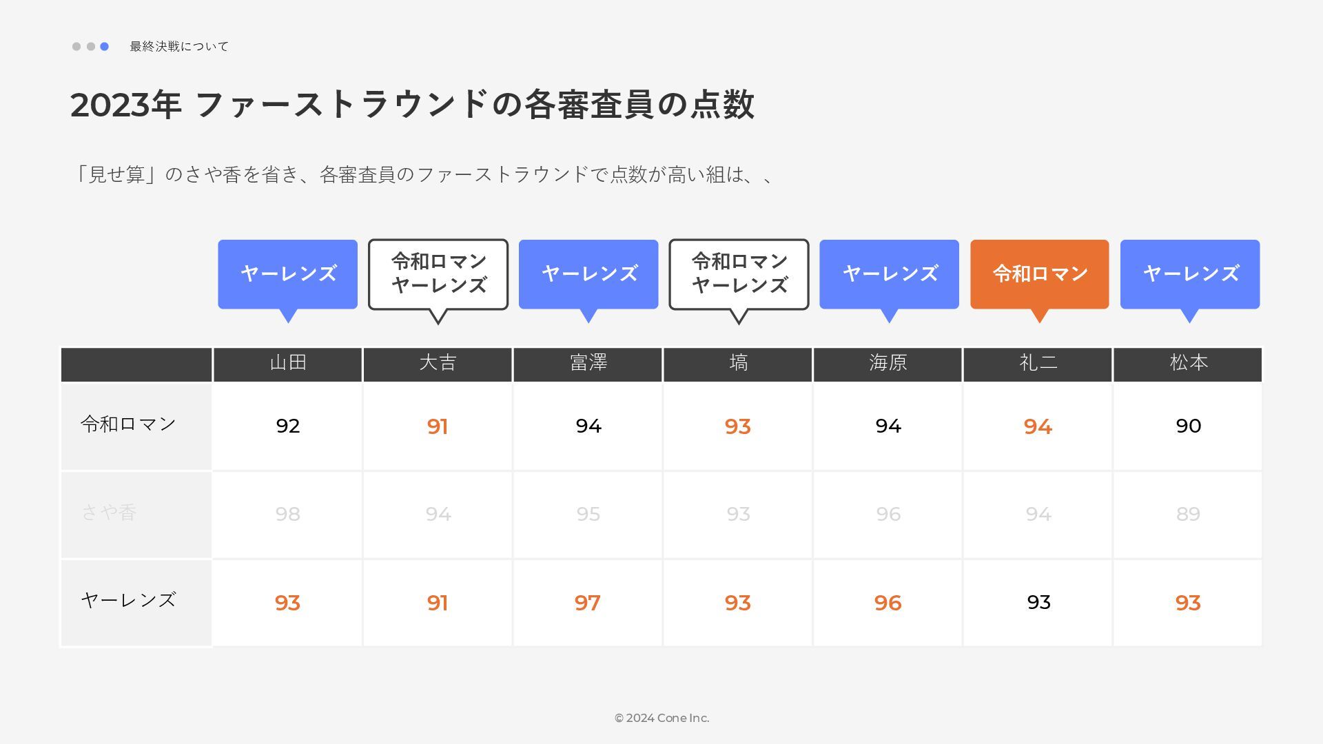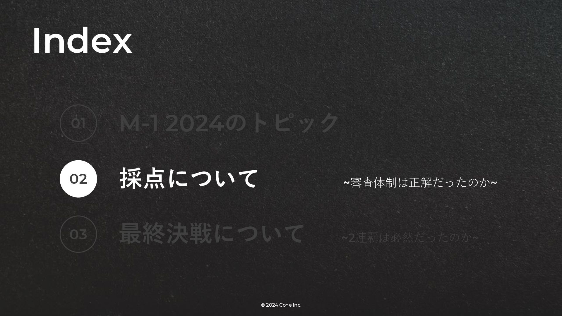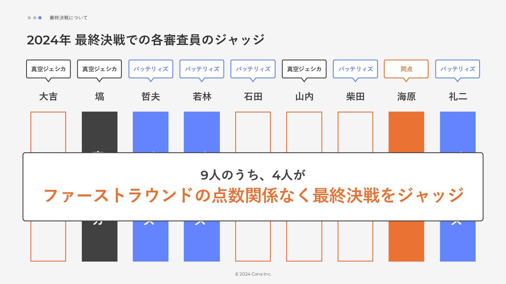 BtoBのコンテンツ制作支援を行う株式会社Coneが、得意の資料作成で今年のM-1を振り返りました。 「9名での審査体制は正解だったのか」「令和ロマンはなぜ2連覇を達成できたのか」について独自の視点で考察しています。