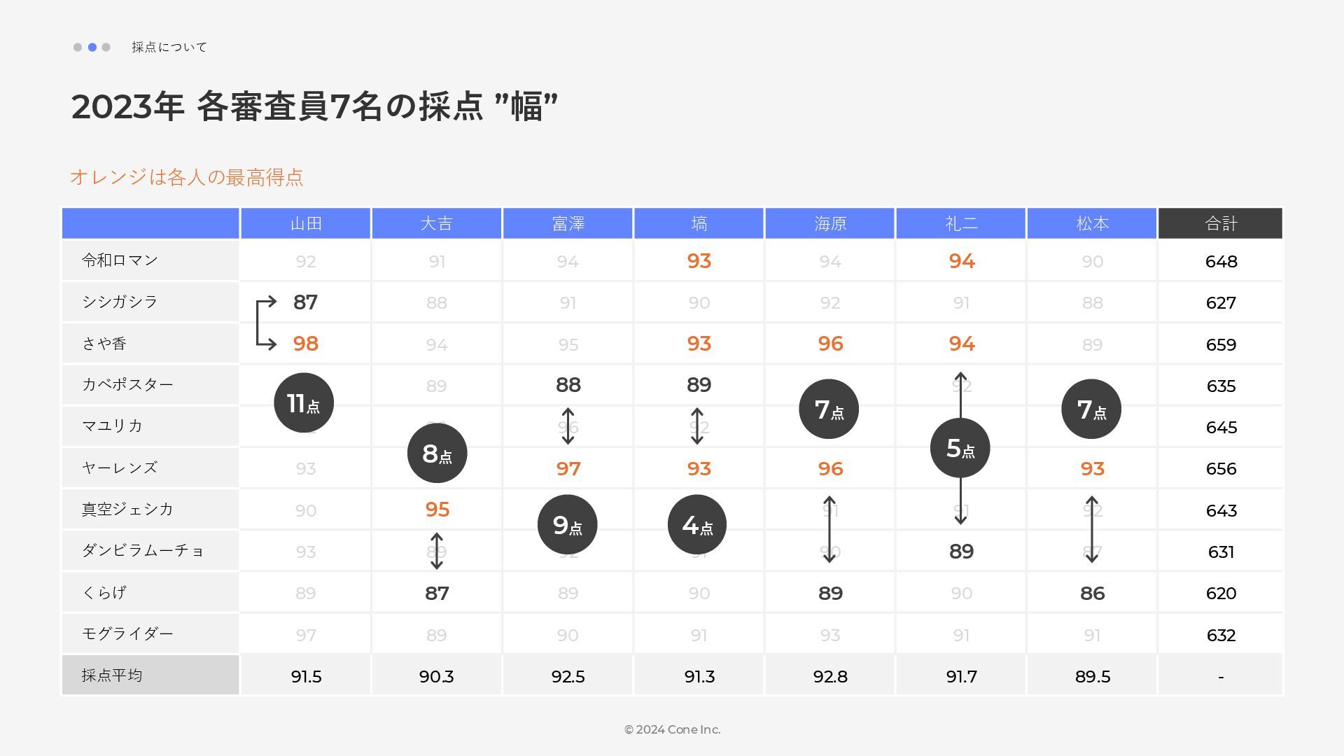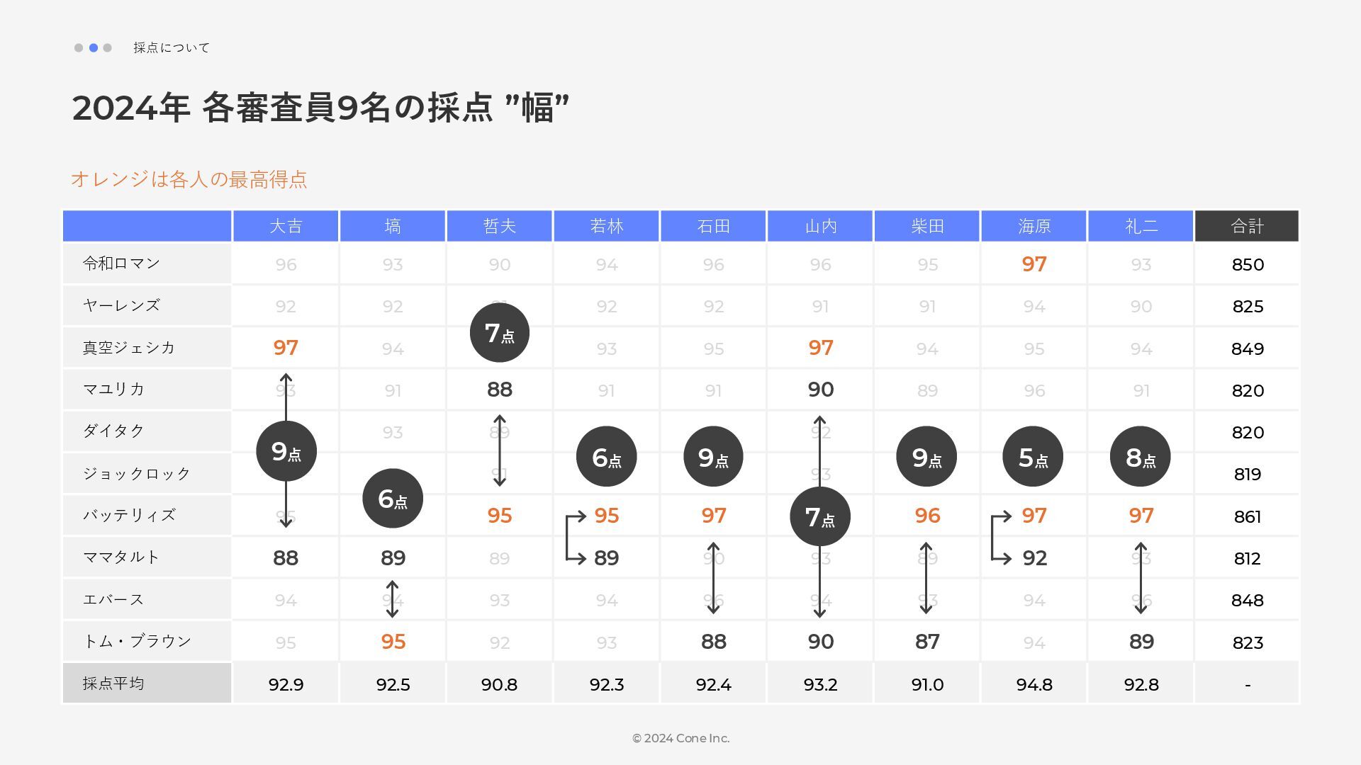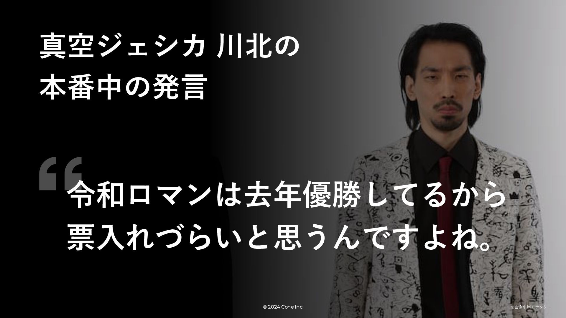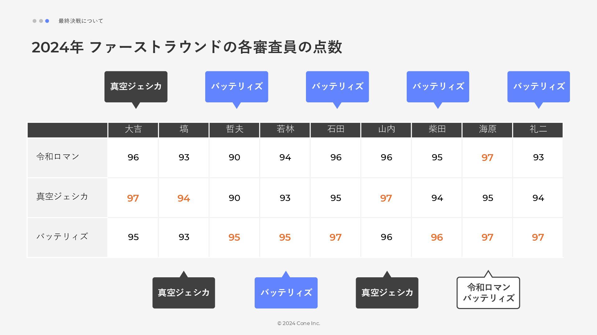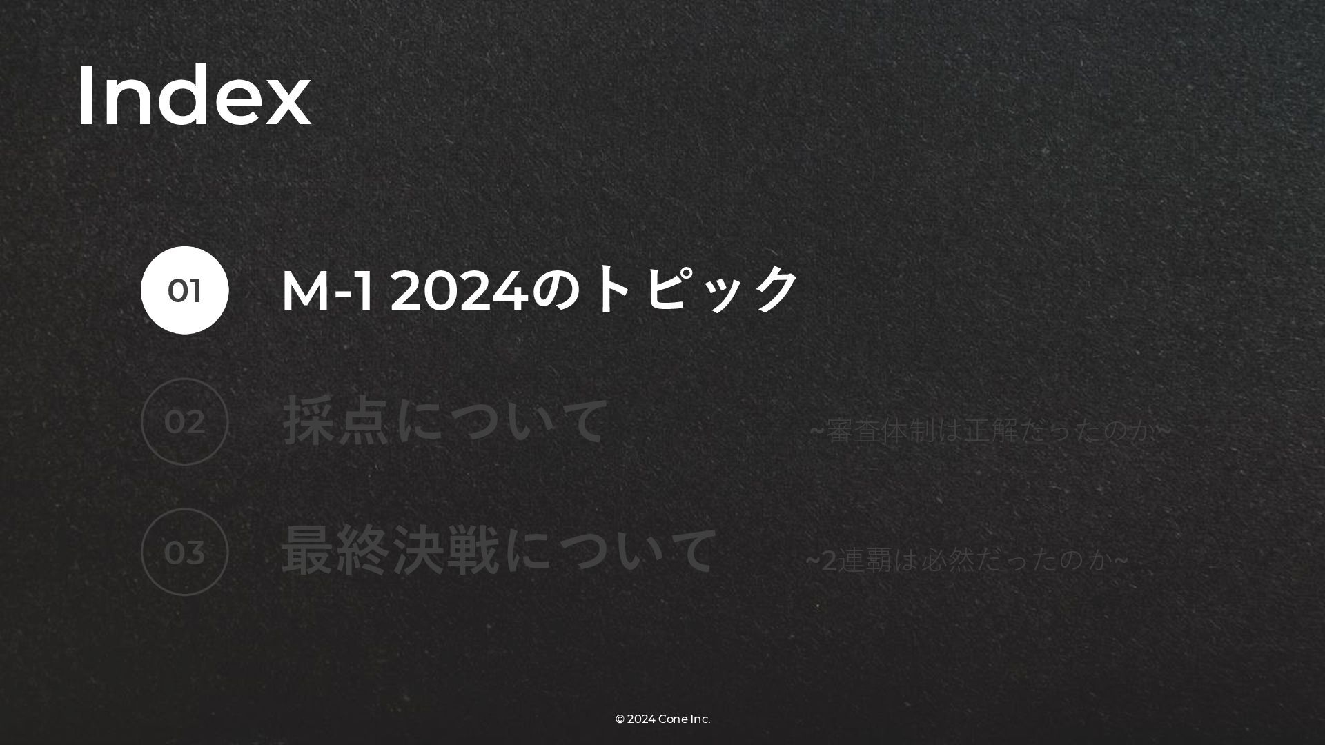 BtoBのコンテンツ制作支援を行う株式会社Coneが、得意の資料作成で今年のM-1を振り返りました。 「9名での審査体制は正解だったのか」「令和ロマンはなぜ2連覇を達成できたのか」について独自の視点で考察しています。