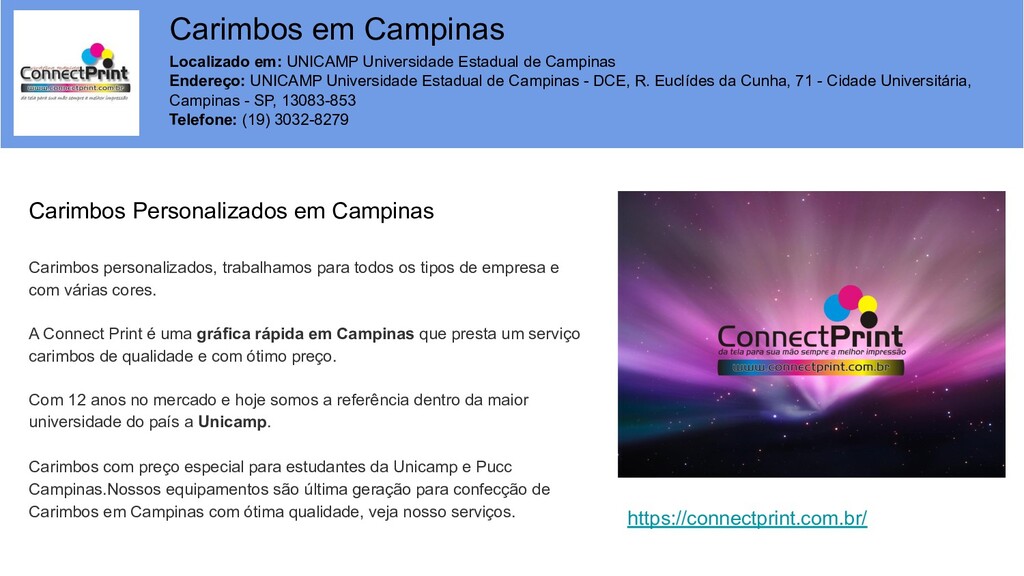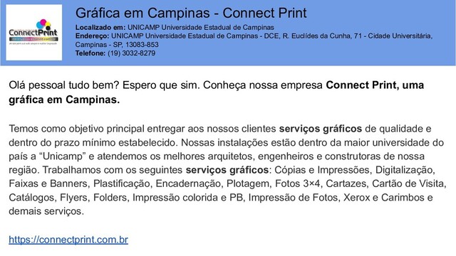 Somos a gráfica Connect Print, uma gráfica rápida em Campinas e temos como objetivo principal entregar aos nossos clientes serviços gráficos de qualidade e dentro do prazo mínimo estabelecido. Nossas instalações estão dentro da maior universidade do pais a “Unicamp” e atendemos os melhores arquitetos, engenheiros e construtoras de nossa região. Trabalhamos com os seguintes serviços gráficos: Cópias e Impressões, Digitalização, Faixas e Banners, Plastificação, Encadernação, Plotagem, Fotos 3×4, Cartazes, Cartão de Visita, Catálogos, Flyers, Folders, Impressão colorida e PB, Impressão de Fotos, Xerox e Carimbos e demais serviços.
