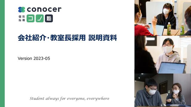 未経験の方 ▪ 学習塾(集団/個別問わず)で 教室長/校舎長の経験がある方 ▪ デジタル教材と人の力を活用した 新しい教育モデル作りに興味が ある方 ▪ 生徒に本質的に向き合う時間と 質を今よりも高めたい方 ▪ 「教える」だけでなく「コーチング」に も関心がある方 ▪ 学習塾(集団/個別問わず) や公教育での教員経験がある方 ▪ 塾や公教育の現場でICT活用 の経験があり、よりうまいやり方が ないか模索されている方 ▪ 生徒の目標達成により深く関わ り、伴走することに興味がある方 ▪ 教師中心ではなく生徒中心の教 育に関心がある方 ▪ 今は別の業界/職種だが、教育 に興味がある方 ▪ 学生時代は教育系の学部で、 教員業界に元々興味があった方 ▪ 急成長スタートアップでご自身を 成長させたい方 ▪ 将来的に起業やマネジメントに 興味のある方 いずれの方々もコノセルで教室長として活躍しています