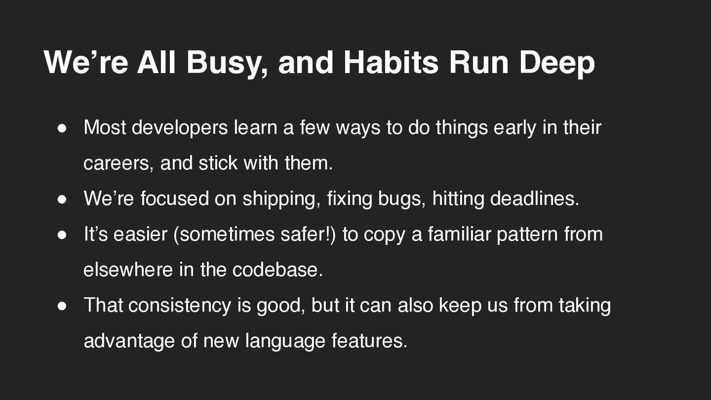 Expect before/after code, real-world scenarios, and the occasional “wait, you can do that now?” moment. Whether you're modernising a legacy app or just looking to write less code that does more, this session will leave you with a better understanding of how these features combine to make your code safer, more expressive, and easier to maintain.