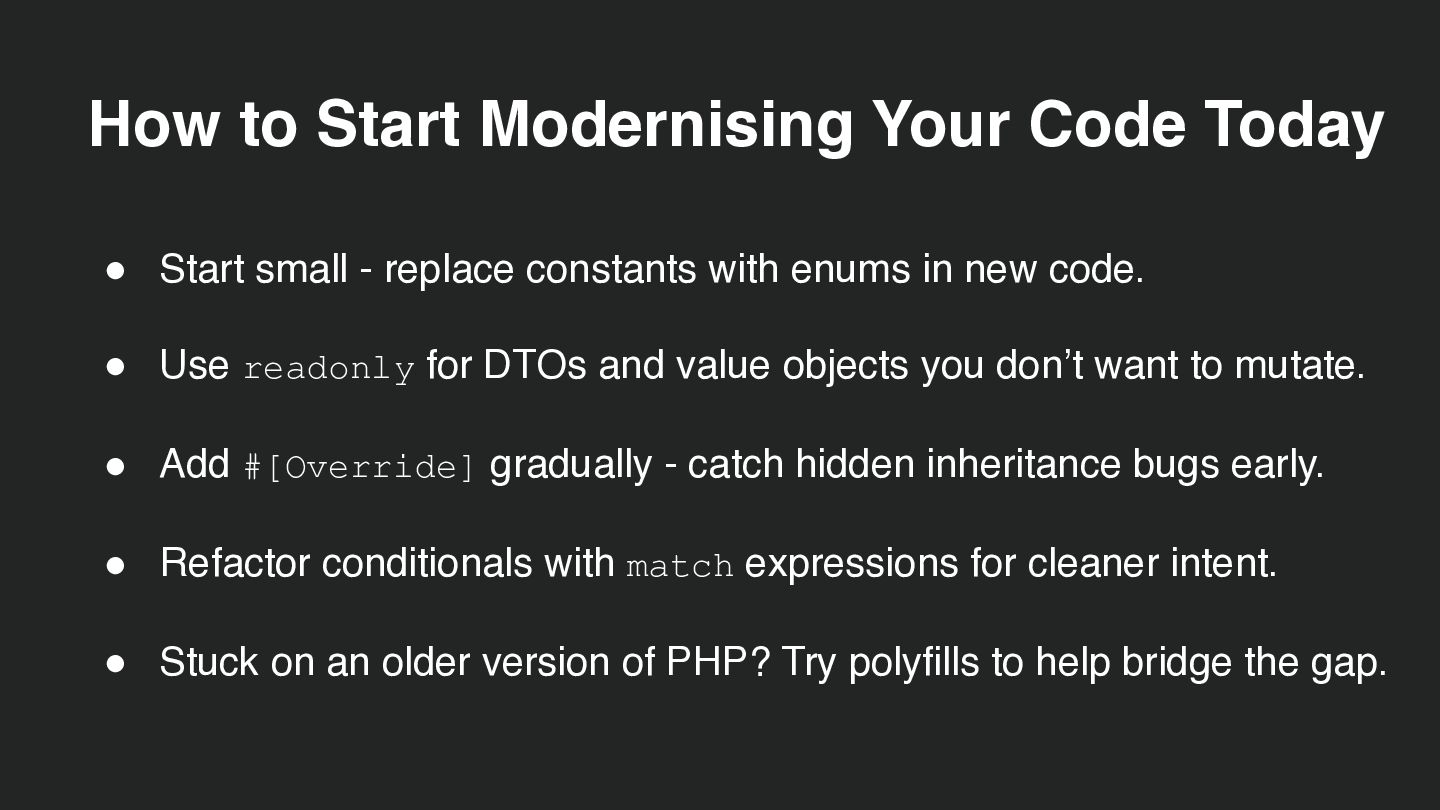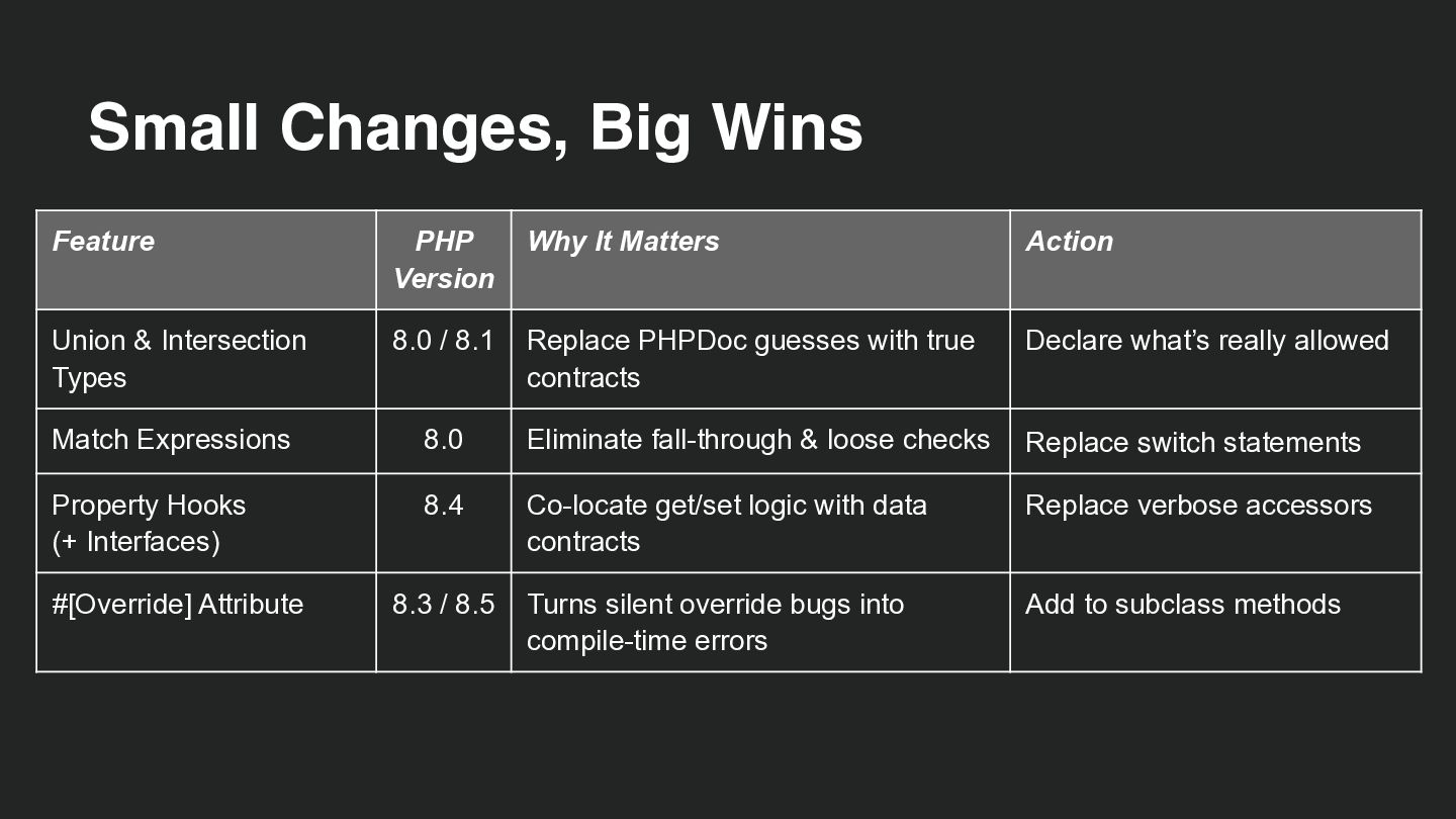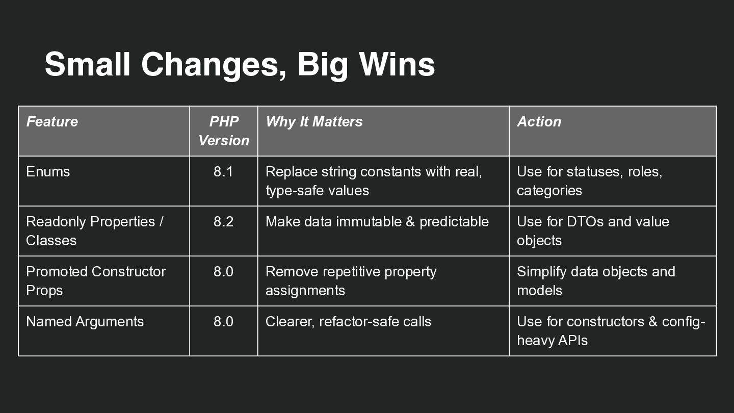 You’ve read the release notes. You’ve seen the blog posts. But how many of PHP’s modern features have actually made it into your day-to-day code? Sure, you’ve heard about enums. You might’ve even dabbled with match expressions or readonly properties. But chances are, you might still be writing modern PHP with a very 7.x mindset.