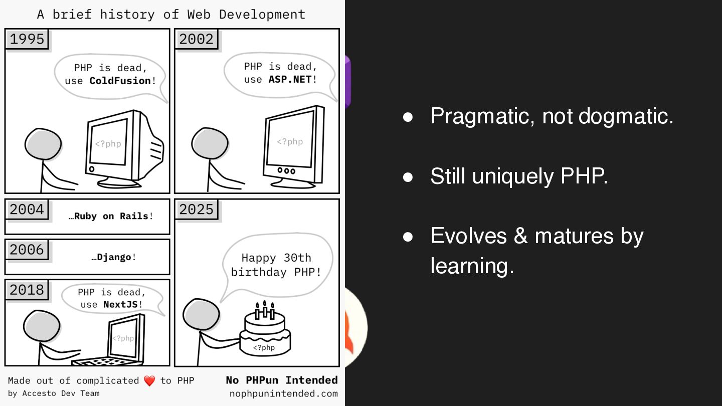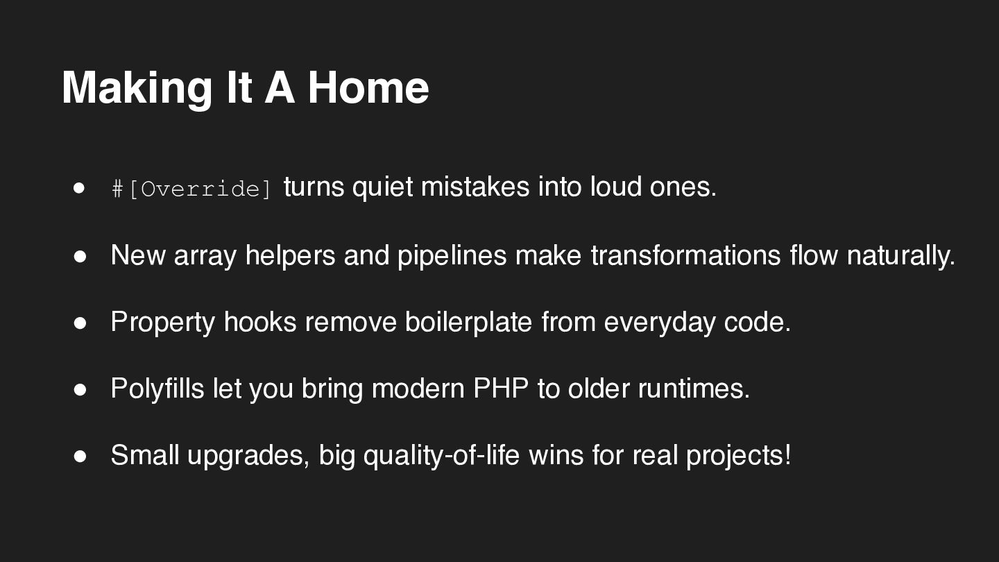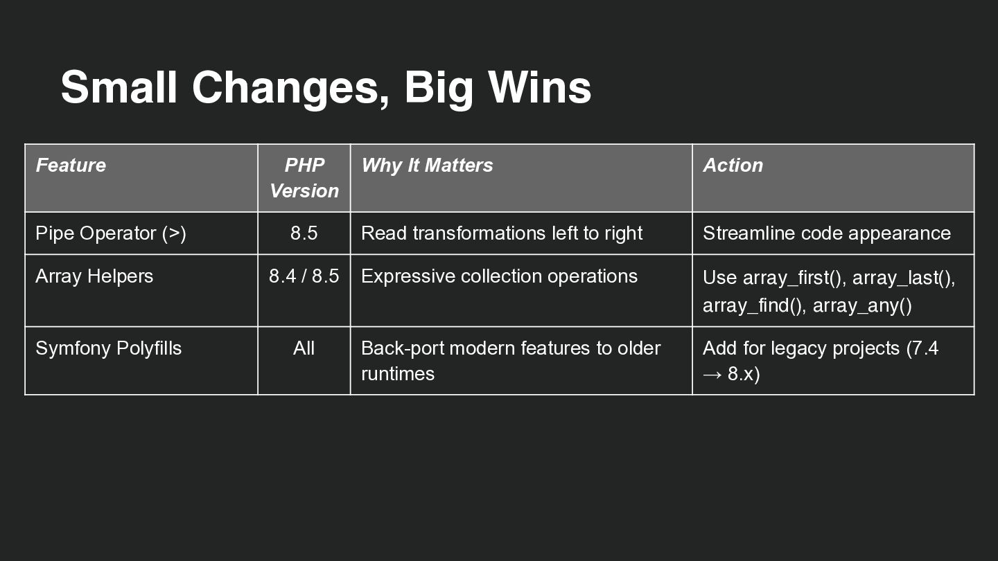 You’ve read the release notes. You’ve seen the blog posts. But how many of PHP’s modern features have actually made it into your day-to-day code? Sure, you’ve heard about enums. You might’ve even dabbled with match expressions or readonly properties. But chances are, you might still be writing modern PHP with a very 7.x mindset.