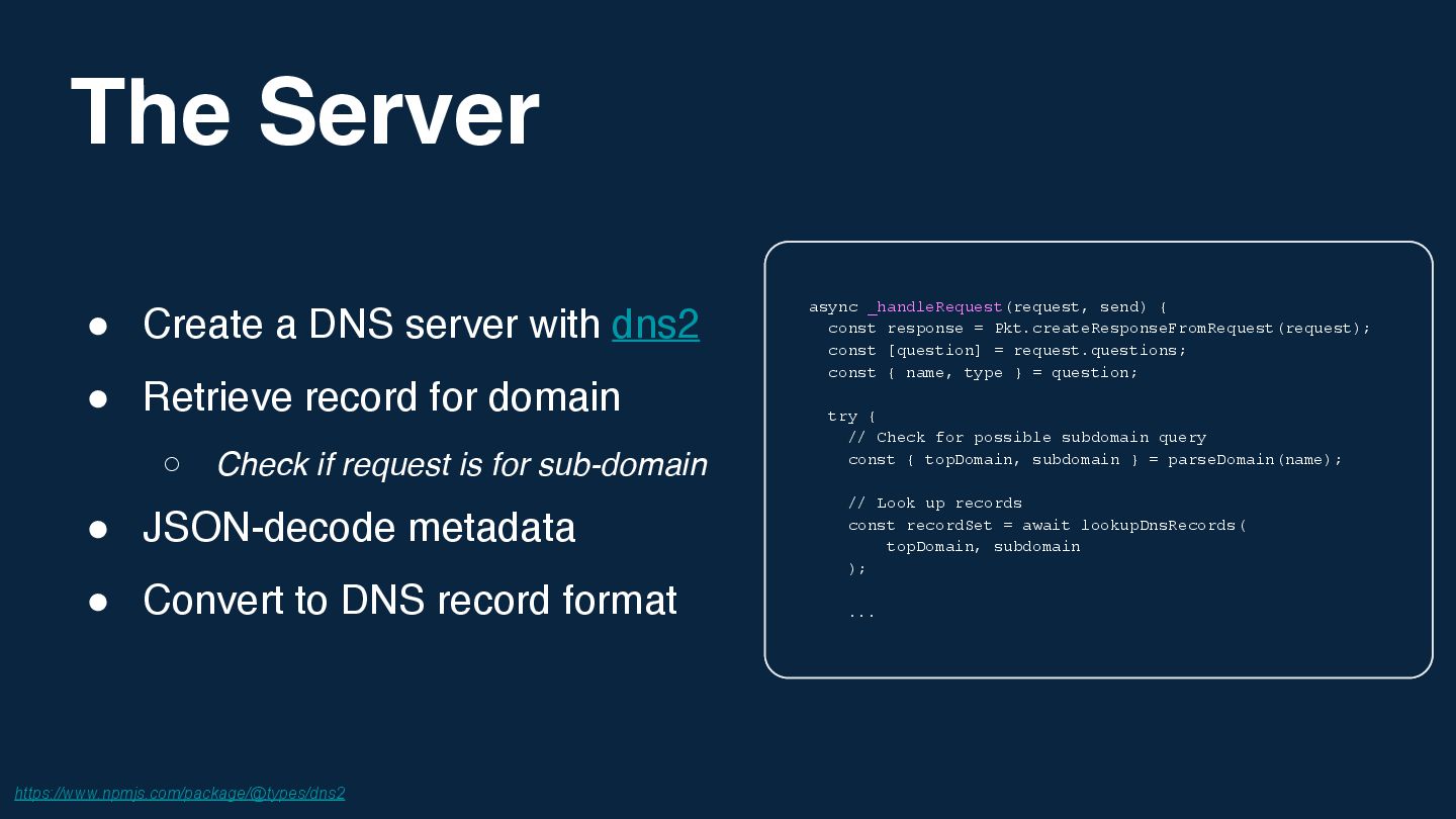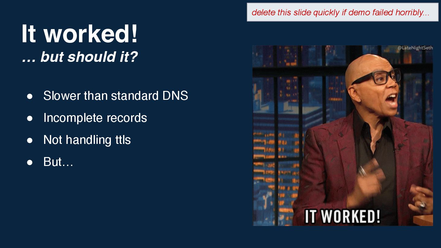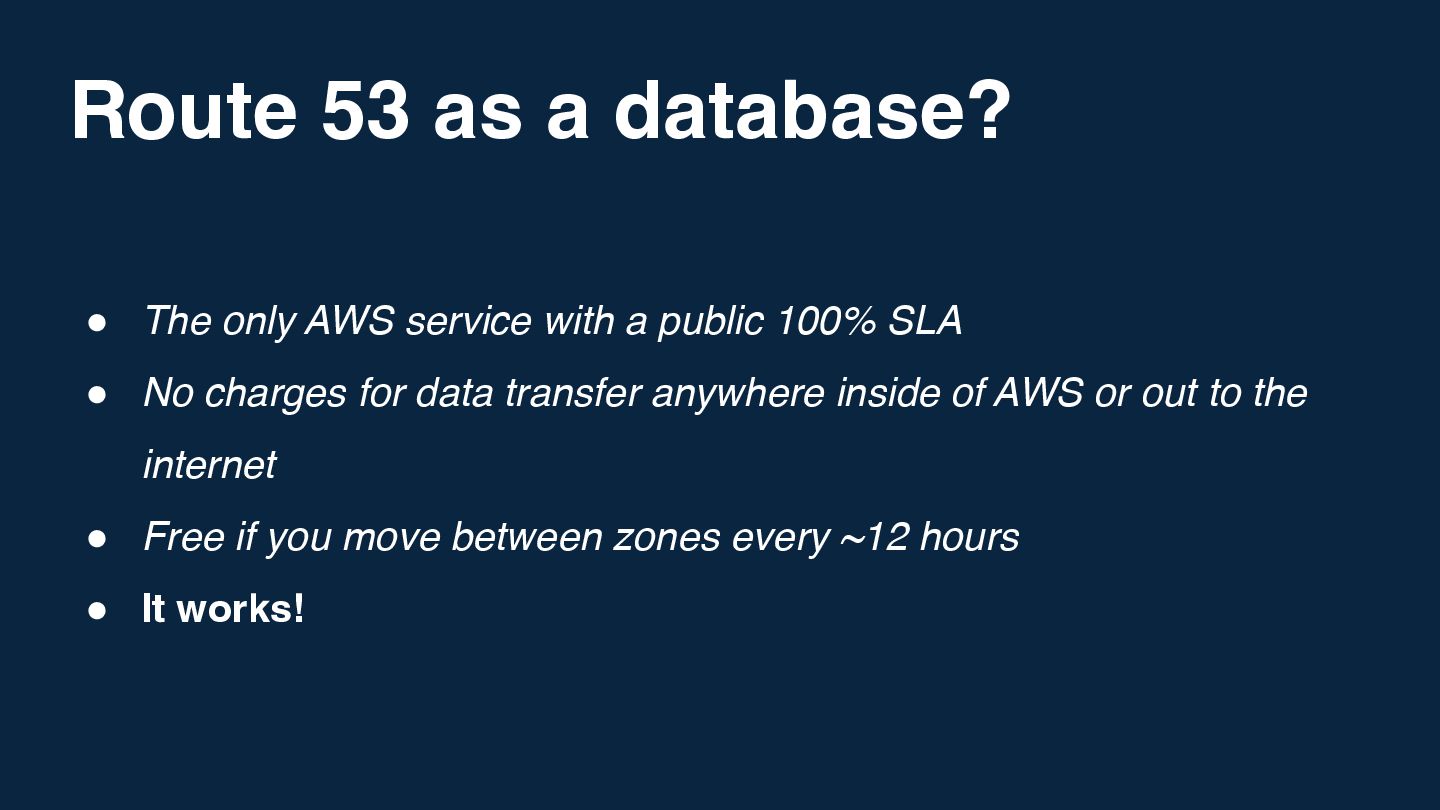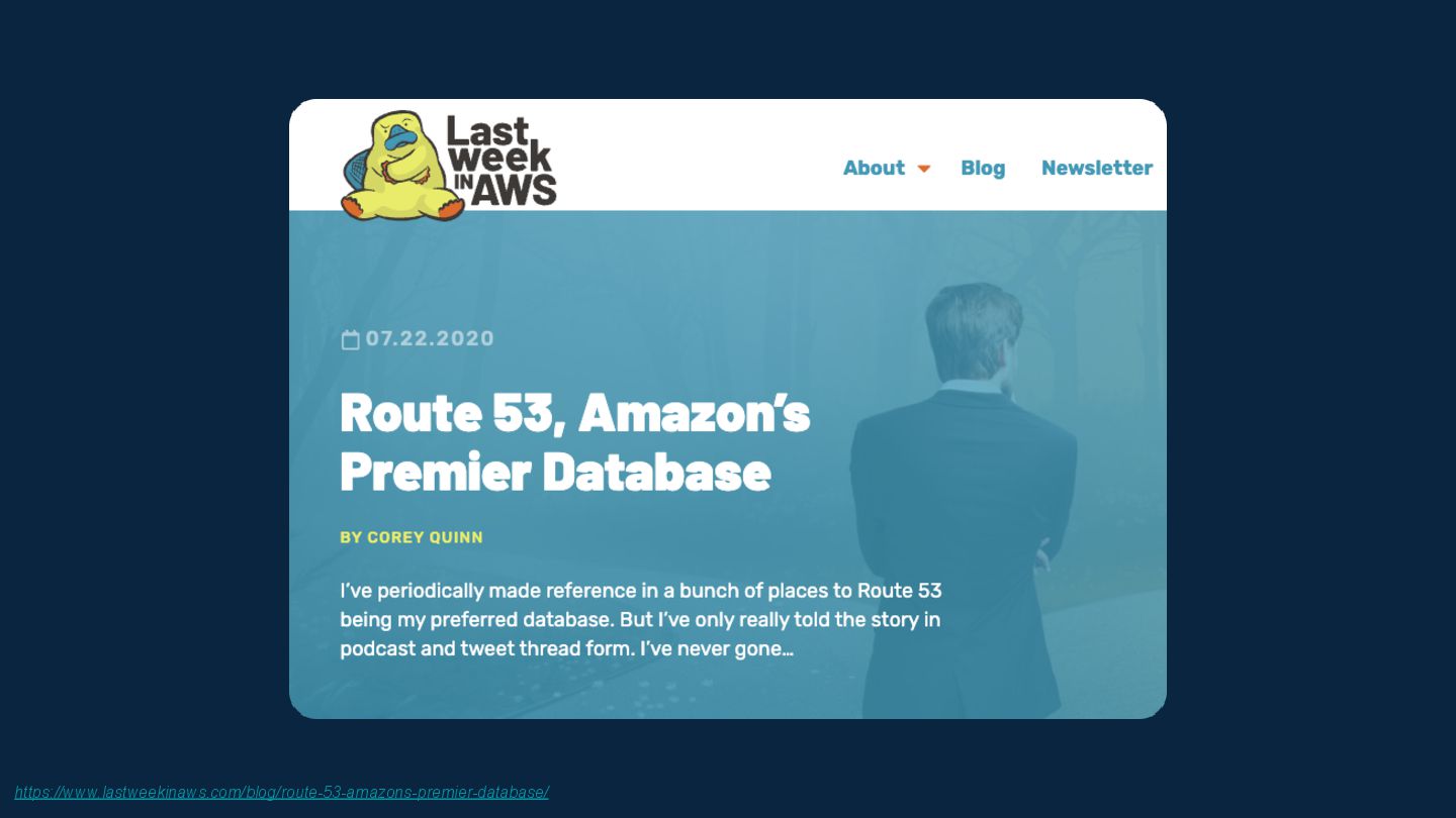 I've always believed the best way to really understand a technology is to push it in stupid, impractical directions and see what breaks. Inspired by Corey Quinn's claim that Amazon Route 53 is actually a database, I wondered: what's the opposite of that? If DNS can be used as a database, what's the most absurd way to implement a DNS server?