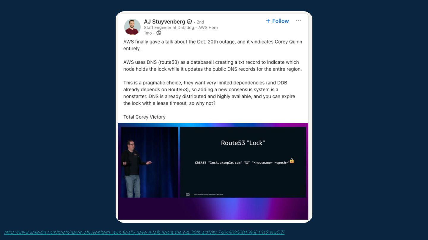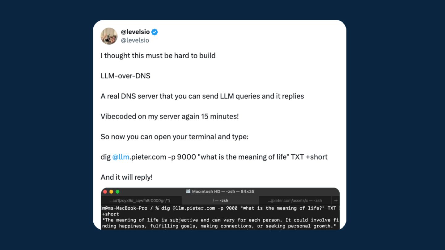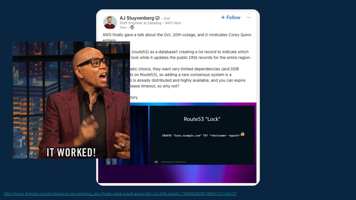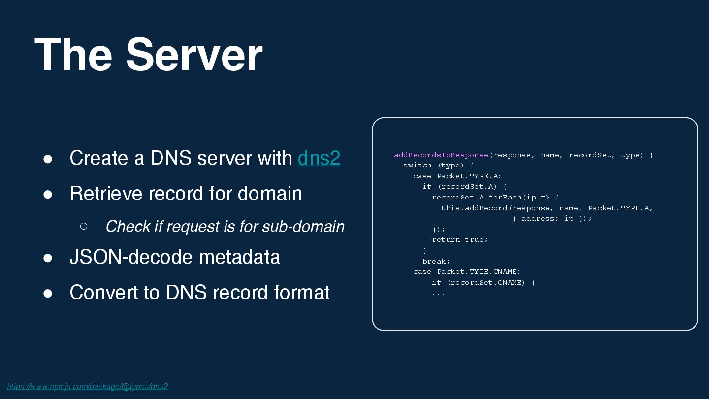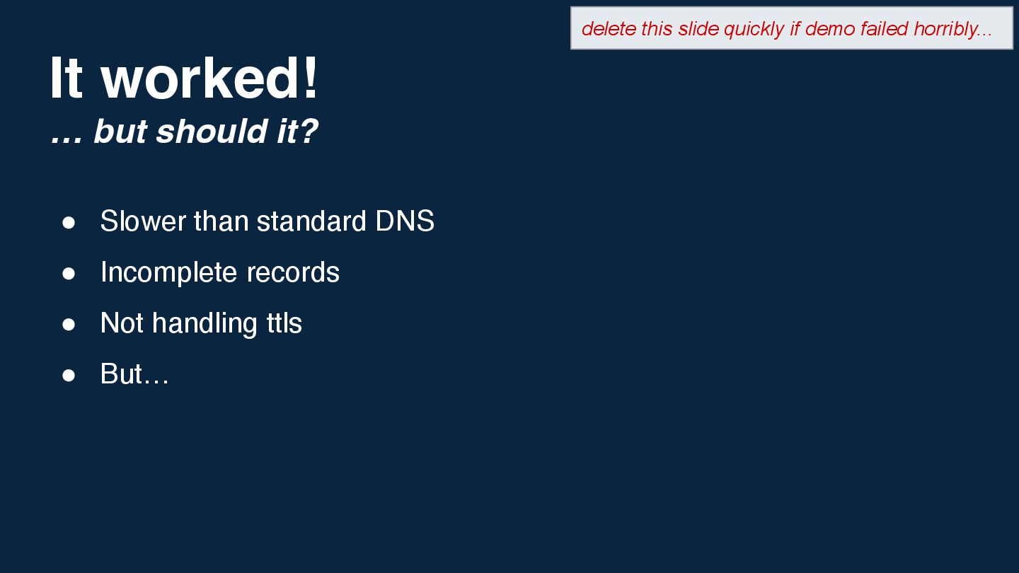 I've always believed the best way to really understand a technology is to push it in stupid, impractical directions and see what breaks. Inspired by Corey Quinn's claim that Amazon Route 53 is actually a database, I wondered: what's the opposite of that? If DNS can be used as a database, what's the most absurd way to implement a DNS server?