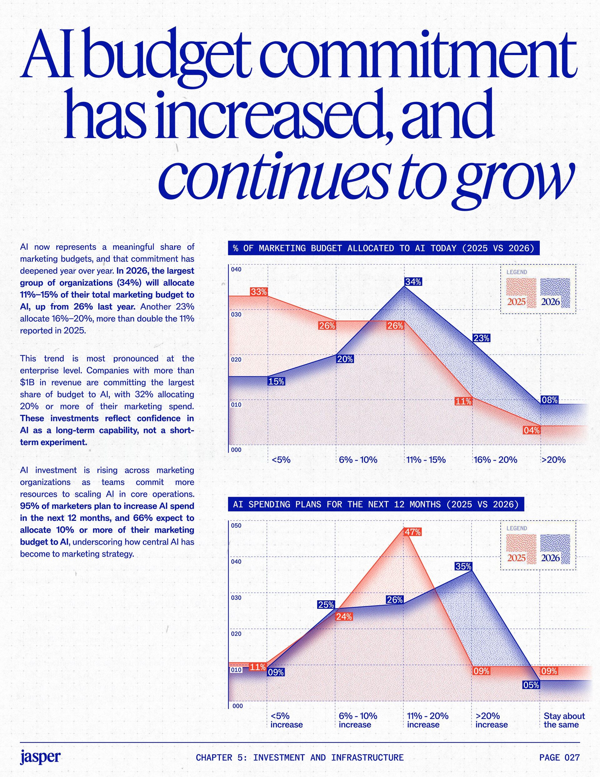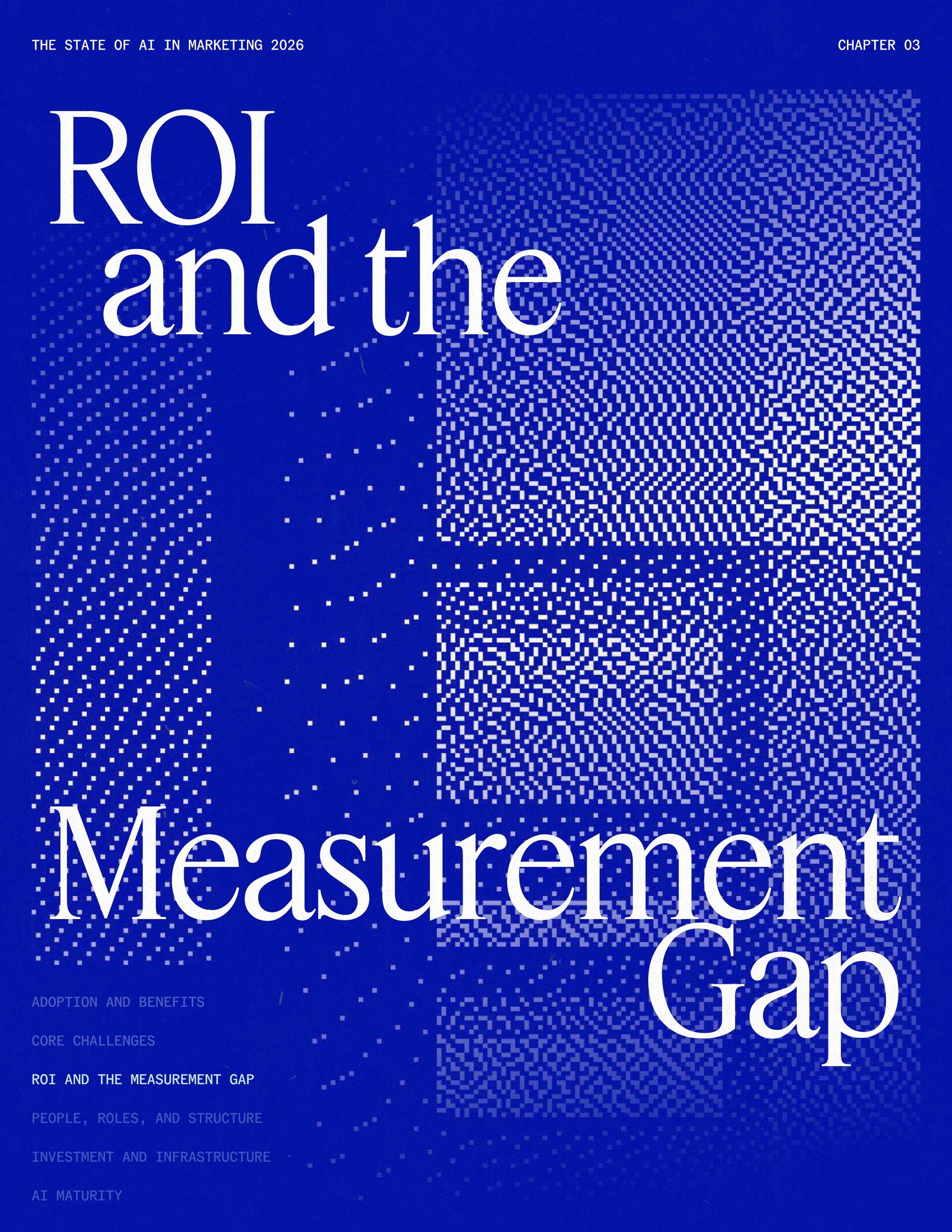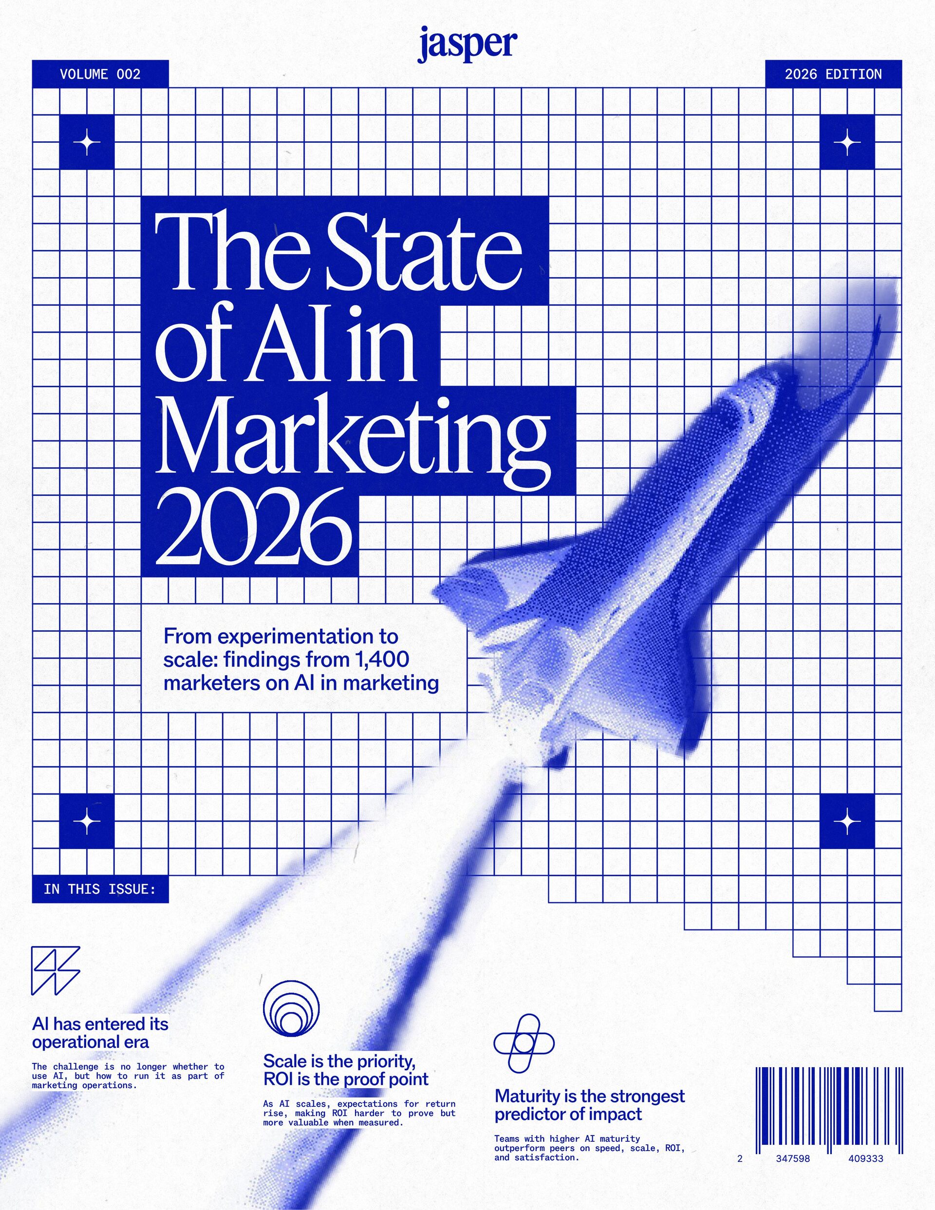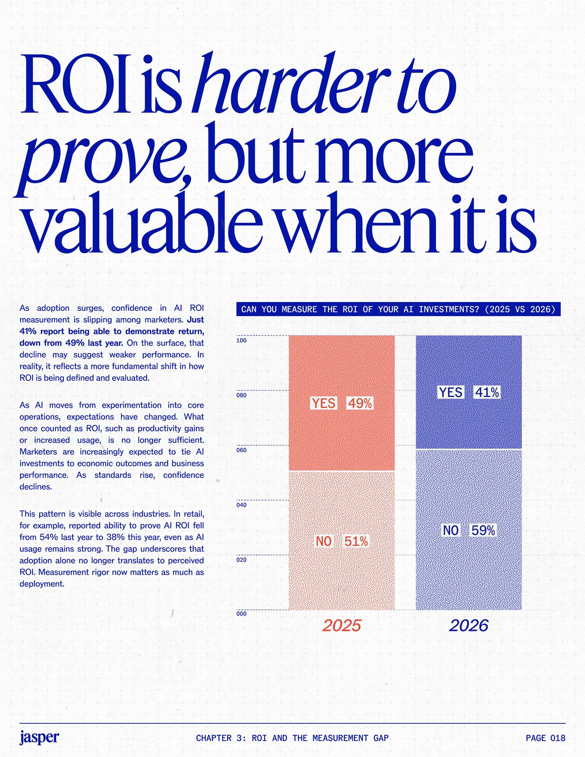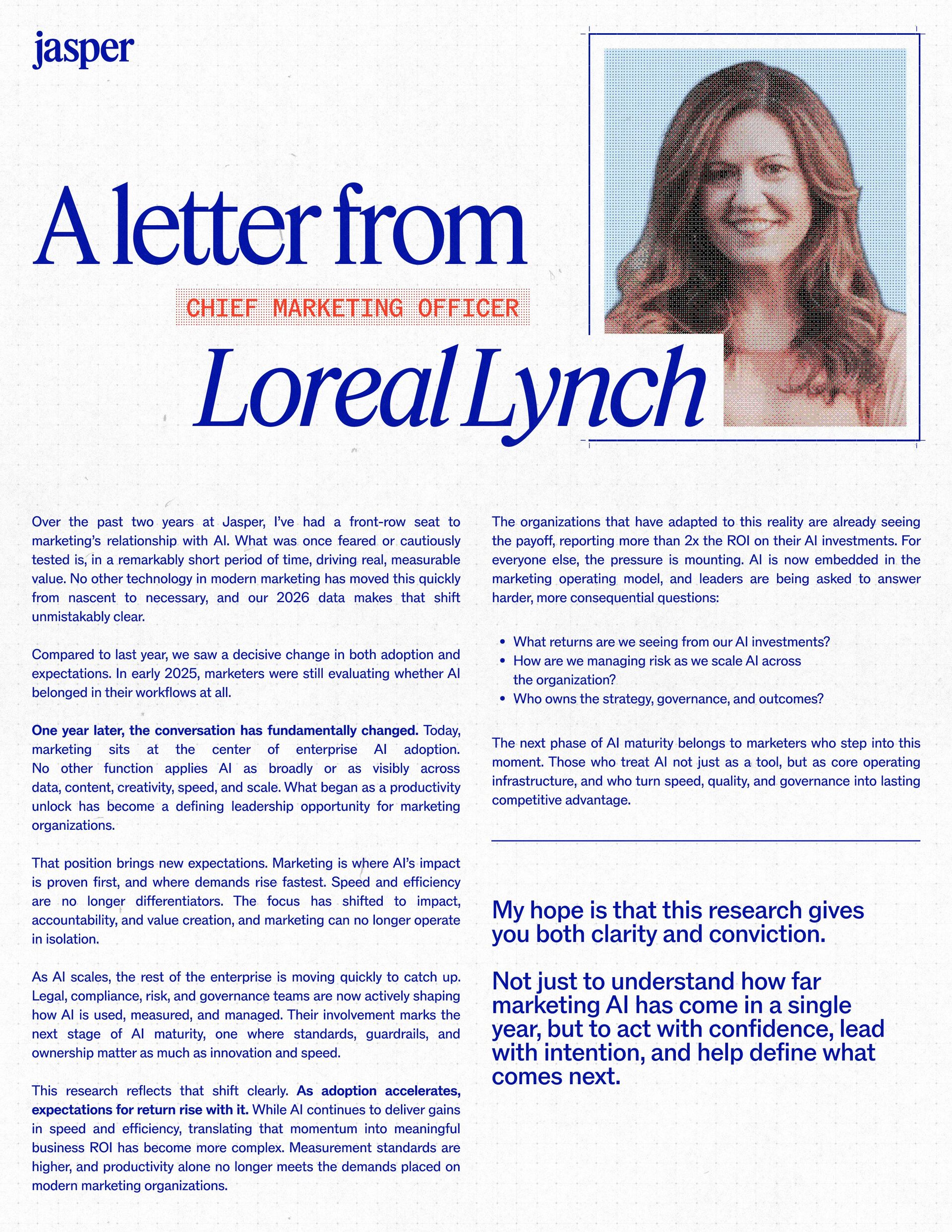 t t w o y e a r s a t J a s p e r , I ˇ v e h a d a f r o n t - r o w s e a t t o m a r k e t i n g ˇ s r e l a t i o n s h i p w i t h A I . W h a t w a s o n c e f e a r e d o r c a u t i o u s l y t e s t e d i s , i n a r e m a r k a b l y s h o r t p e r i o d o f t i m e , d r i v i n g r e a l , m e a s u r a b l e v a l u e . N o o t h e r t e c h n o l o g y i n m o d e r n m a r k e t i n g h a s m o v e d t h i s q u i c k l y f r o m n a s c e n t t o n e c e s s a r y , a n d o u r 2 0 2 6 d a t a m a k e s t h a t s h i f t u n m i s t a k a b l y c l e a r . C o m p a r e d t o l a s t y e a r , w e s a w a d e c i s i v e c h a n g e i n b o t h a d o p t i o n a n d e x p e c t a t i o n s . I n e a r l y 2 0 2 5 , m a r k e t e r s w e r e s t i l l e v a l u a t i n g w h e t h e r A I b e l o n g e d i n t h e i r w o r k f l o w s a t a l l . € O n e y e a r l a t e r , t h e c o n v e r s a t i o n h a s f u n d a m e n t a l l y c h a n g e d . T o d a y , m a r k e t i n g s i t s a t t h e c e n t e r o f e n t e r p r i s e A I a d o p t i o n . ( N o o t h e r f u n c t i o n a p p l i e s A I a s b r o a d l y o r a s v i s i b l y a c r o s s ( d a t a , c o n t e n t , c r e a t i v i t y , s p e e d , a n d s c a l e . W h a t b e g a n a s a p r o d u c t i v i t y u n l o c k h a s b e c o m e a d e f i n i n g l e a d e r s h i p o p p o r t u n i t y f o r m a r k e t i n g o r g a n i z a t i o n s . T h a t p o s i t i o n b r i n g s n e w e x p e c t a t i o n s . M a r k e t i n g i s w h e r e A I ˇ s i m p a c t i s p r o v e n f i r s t , a n d w h e r e d e m a n d s r i s e f a s t e s t . S p e e d a n d e f f i c i e n c y a r e n o l o n g e r d i f f e r e n t i a t o r s . T h e f o c u s h a s s h i f t e d t o i m p a c t , a c c o u n t a b i l i t y , a n d v a l u e c r e a t i o n , a n d m a r k e t i n g c a n n o l o n g e r o p e r a t e i n i s o l a t i o n . A s A I s c a l e s , t h e r e s t o f t h e e n t e r p r i s e i s m o v i n g q u i c k l y t o c a t c h u p . L e g a l , c o m p l i a n c e , r i s k , a n d g o v e r n a n c e t e a m s a r e n o w a c t i v e l y s h a p i n g h o w A I i s u s e d , m e a s u r e d , a n d m a n a g e d . T h e i r i n v o l v e m e n t m a r k s t h e n e x t s t a g e o f A I m a t u r i t y , o n e w h e r e s t a n d a r d s , g u a r d r a i l s , a n d o w n e r s h i p m a t t e r a s m u c h a s i n n o v a t i o n a n d s p e e d . T h i s r e s e a r c h r e f l e c t s t h a t s h i f t c l e a r l y . A s a d o p t i o n a c c e l e r a t e s , e x p e c t a t i o n s f o r r e t u r n r i s e w i t h i t . W h i l e A I c o n t i n u e s t o d e l i v e r g a i n s i n s p e e d a n d e f f i c i e n c y , t r a n s l a t i n g t h a t m o m e n t u m i n t o m e a n i n g f u l b u s i n e s s R O I h a s b e c o m e m o r e c o m p l e x . M e a s u r e m e n t s t a n d a r d s a r e h i g h e r , a n d p r o d u c t i v i t y a l o n e n o l o n g e r m e e t s t h e d e m a n d s p l a c e d o n m o d e r n m a r k e t i n g o r g a n i z a t i o n s . T h e o r g a n i z a t i o n s t h a t h a v e a d a p t e d t o t h i s r e a l i t y a r e a l r e a d y s e e i n g t h e p a y o f f , r e p o r t i n g m o r e t h a n 2 x t h e R O I o n t h e i r A I i n v e s t m e n t s . F o r e v e r y o n e e l s e , t h e p r e s s u r e i s m o u n t i n g . A I i s n o w e m b e d d e d i n t h e m a r k e t i n g o p e r a t i n g m o d e l , a n d l e a d e r s a r e b e i n g a s k e d t o a n s w e r h a r d e r , m o r e c o n s e q u e n t i a l q u e s t i o n s : What returns are we seeing from our AI investments? How are we managing risk as we scale AI across