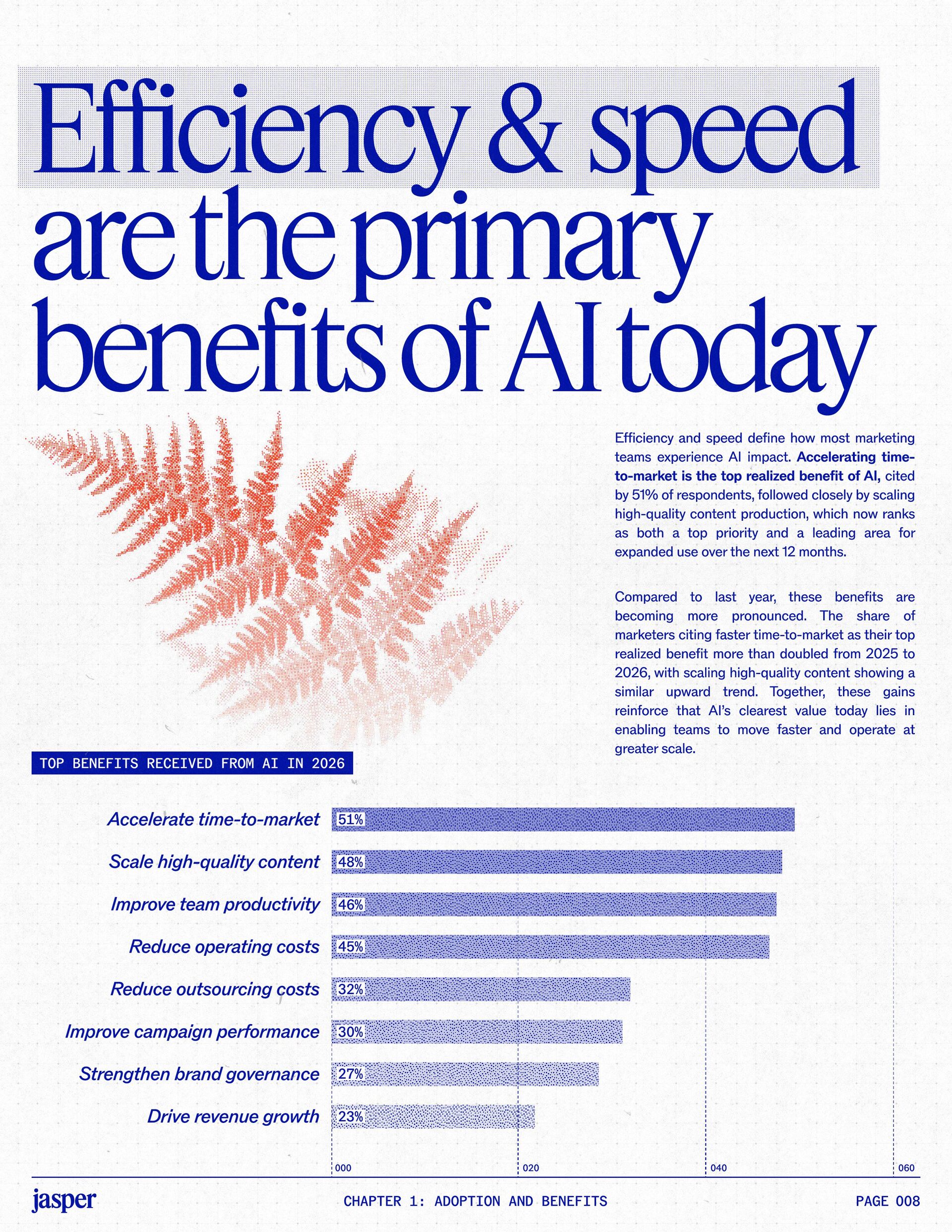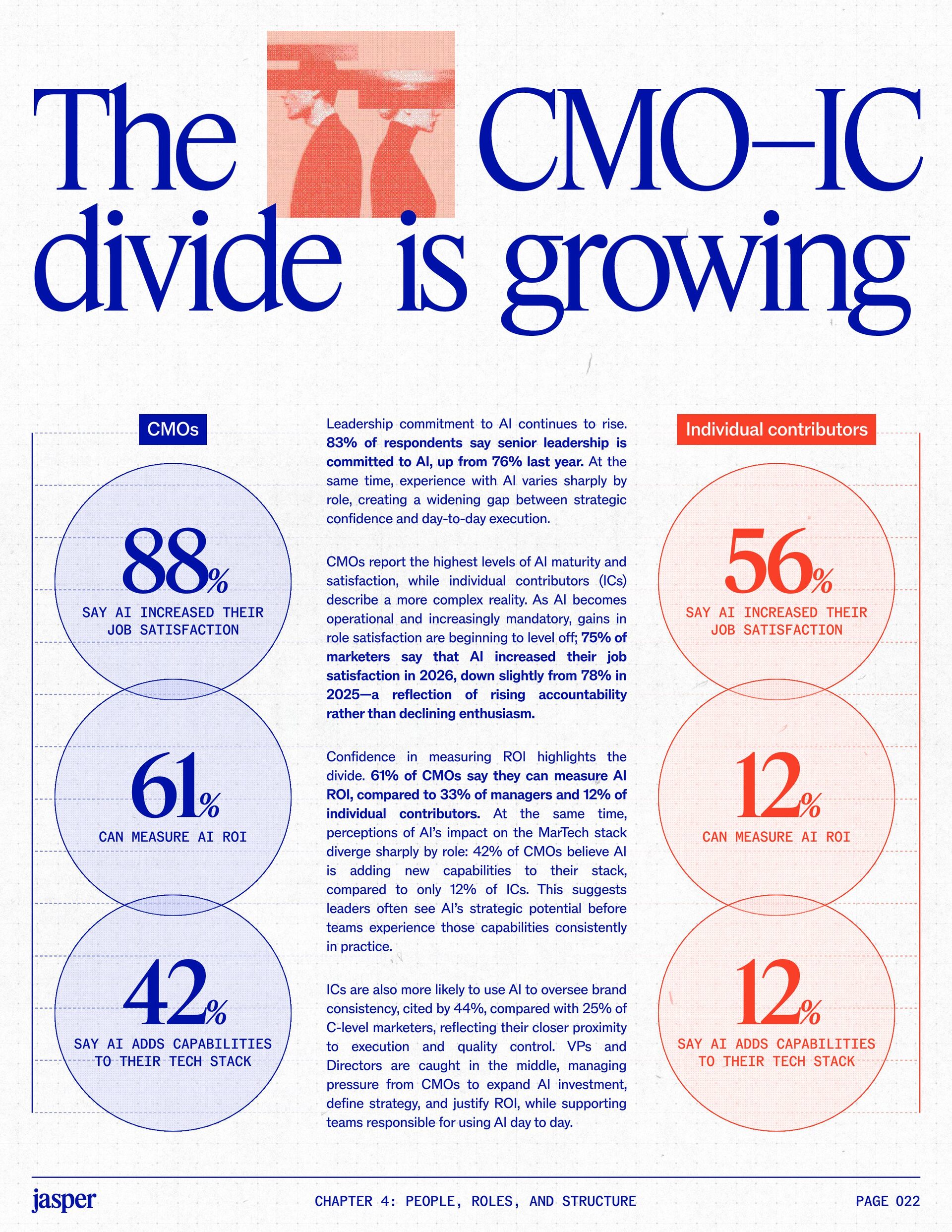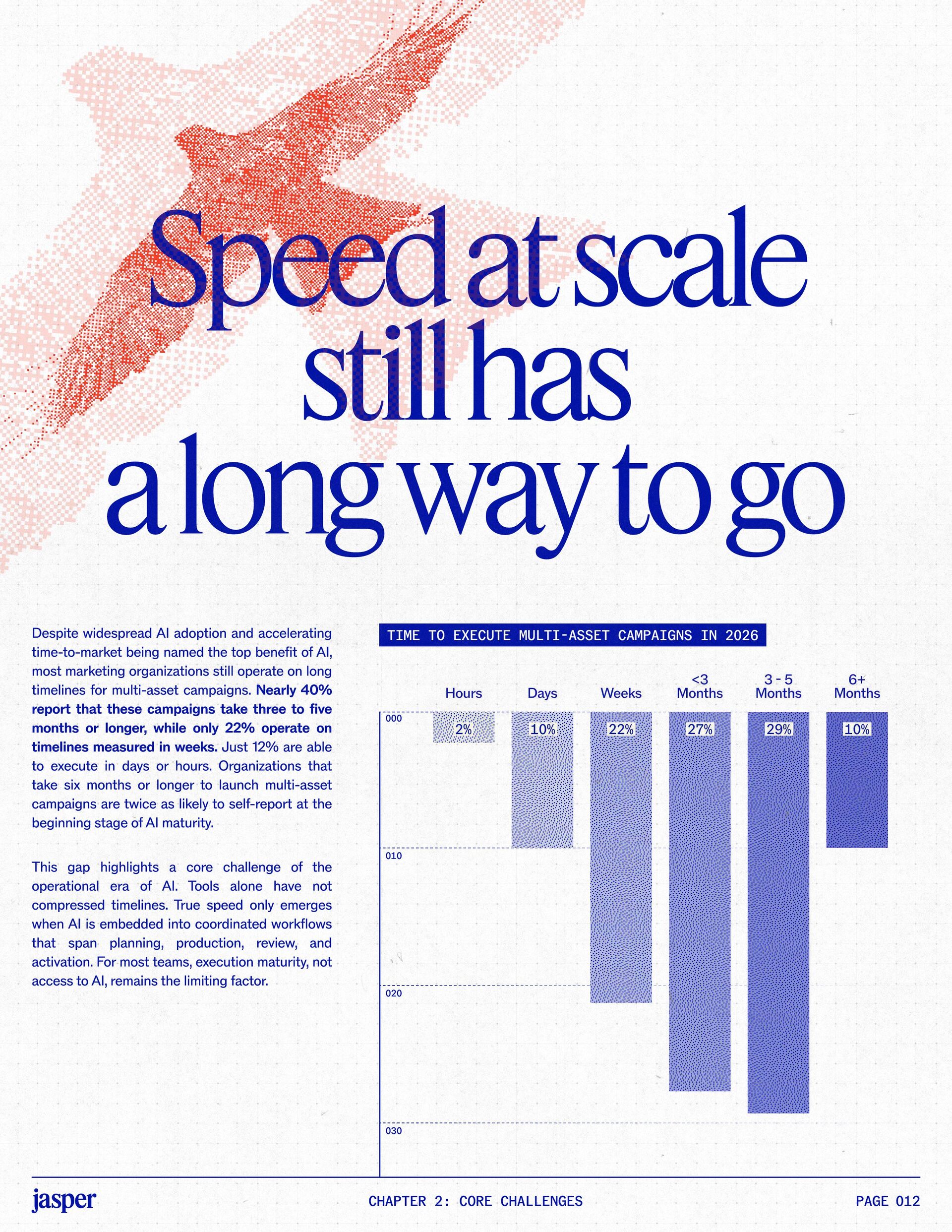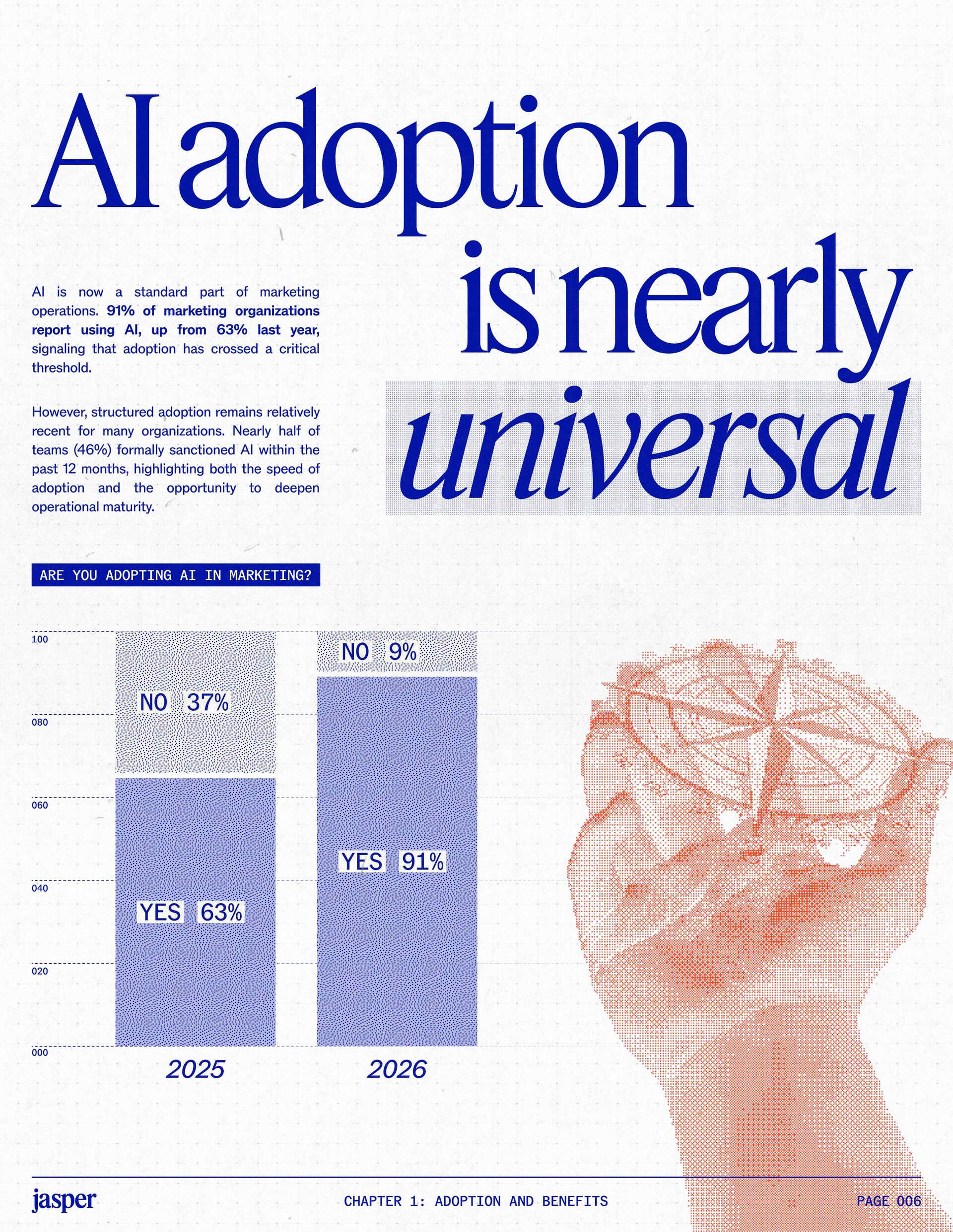 t t w o y e a r s a t J a s p e r , I ˇ v e h a d a f r o n t - r o w s e a t t o m a r k e t i n g ˇ s r e l a t i o n s h i p w i t h A I . W h a t w a s o n c e f e a r e d o r c a u t i o u s l y t e s t e d i s , i n a r e m a r k a b l y s h o r t p e r i o d o f t i m e , d r i v i n g r e a l , m e a s u r a b l e v a l u e . N o o t h e r t e c h n o l o g y i n m o d e r n m a r k e t i n g h a s m o v e d t h i s q u i c k l y f r o m n a s c e n t t o n e c e s s a r y , a n d o u r 2 0 2 6 d a t a m a k e s t h a t s h i f t u n m i s t a k a b l y c l e a r . C o m p a r e d t o l a s t y e a r , w e s a w a d e c i s i v e c h a n g e i n b o t h a d o p t i o n a n d e x p e c t a t i o n s . I n e a r l y 2 0 2 5 , m a r k e t e r s w e r e s t i l l e v a l u a t i n g w h e t h e r A I b e l o n g e d i n t h e i r w o r k f l o w s a t a l l . € O n e y e a r l a t e r , t h e c o n v e r s a t i o n h a s f u n d a m e n t a l l y c h a n g e d . T o d a y , m a r k e t i n g s i t s a t t h e c e n t e r o f e n t e r p r i s e A I a d o p t i o n . ( N o o t h e r f u n c t i o n a p p l i e s A I a s b r o a d l y o r a s v i s i b l y a c r o s s ( d a t a , c o n t e n t , c r e a t i v i t y , s p e e d , a n d s c a l e . W h a t b e g a n a s a p r o d u c t i v i t y u n l o c k h a s b e c o m e a d e f i n i n g l e a d e r s h i p o p p o r t u n i t y f o r m a r k e t i n g o r g a n i z a t i o n s . T h a t p o s i t i o n b r i n g s n e w e x p e c t a t i o n s . M a r k e t i n g i s w h e r e A I ˇ s i m p a c t i s p r o v e n f i r s t , a n d w h e r e d e m a n d s r i s e f a s t e s t . S p e e d a n d e f f i c i e n c y a r e n o l o n g e r d i f f e r e n t i a t o r s . T h e f o c u s h a s s h i f t e d t o i m p a c t , a c c o u n t a b i l i t y , a n d v a l u e c r e a t i o n , a n d m a r k e t i n g c a n n o l o n g e r o p e r a t e i n i s o l a t i o n . A s A I s c a l e s , t h e r e s t o f t h e e n t e r p r i s e i s m o v i n g q u i c k l y t o c a t c h u p . L e g a l , c o m p l i a n c e , r i s k , a n d g o v e r n a n c e t e a m s a r e n o w a c t i v e l y s h a p i n g h o w A I i s u s e d , m e a s u r e d , a n d m a n a g e d . T h e i r i n v o l v e m e n t m a r k s t h e n e x t s t a g e o f A I m a t u r i t y , o n e w h e r e s t a n d a r d s , g u a r d r a i l s , a n d o w n e r s h i p m a t t e r a s m u c h a s i n n o v a t i o n a n d s p e e d . T h i s r e s e a r c h r e f l e c t s t h a t s h i f t c l e a r l y . A s a d o p t i o n a c c e l e r a t e s , e x p e c t a t i o n s f o r r e t u r n r i s e w i t h i t . W h i l e A I c o n t i n u e s t o d e l i v e r g a i n s i n s p e e d a n d e f f i c i e n c y , t r a n s l a t i n g t h a t m o m e n t u m i n t o m e a n i n g f u l b u s i n e s s R O I h a s b e c o m e m o r e c o m p l e x . M e a s u r e m e n t s t a n d a r d s a r e h i g h e r , a n d p r o d u c t i v i t y a l o n e n o l o n g e r m e e t s t h e d e m a n d s p l a c e d o n m o d e r n m a r k e t i n g o r g a n i z a t i o n s . T h e o r g a n i z a t i o n s t h a t h a v e a d a p t e d t o t h i s r e a l i t y a r e a l r e a d y s e e i n g t h e p a y o f f , r e p o r t i n g m o r e t h a n 2 x t h e R O I o n t h e i r A I i n v e s t m e n t s . F o r e v e r y o n e e l s e , t h e p r e s s u r e i s m o u n t i n g . A I i s n o w e m b e d d e d i n t h e m a r k e t i n g o p e r a t i n g m o d e l , a n d l e a d e r s a r e b e i n g a s k e d t o a n s w e r h a r d e r , m o r e c o n s e q u e n t i a l q u e s t i o n s : What returns are we seeing from our AI investments? How are we managing risk as we scale AI across