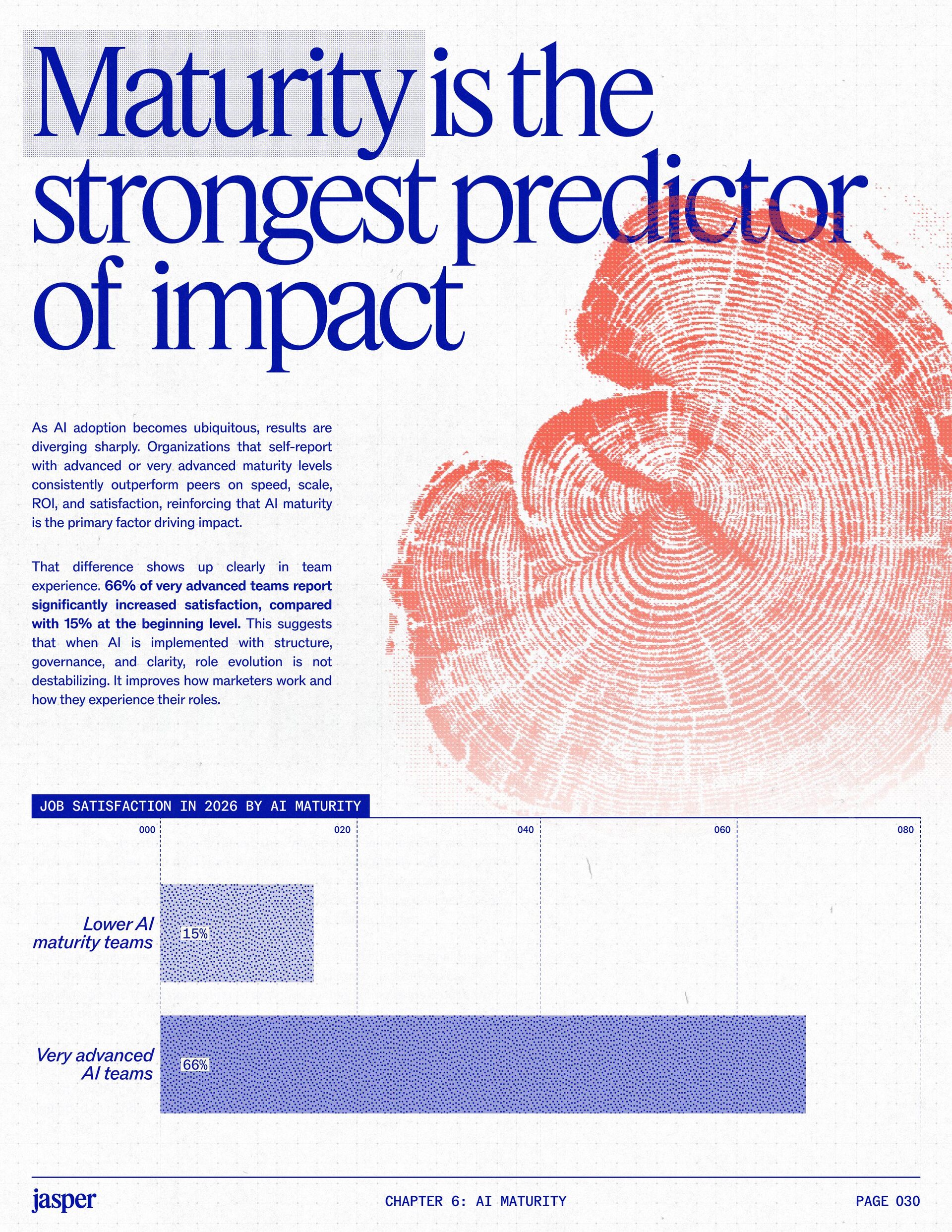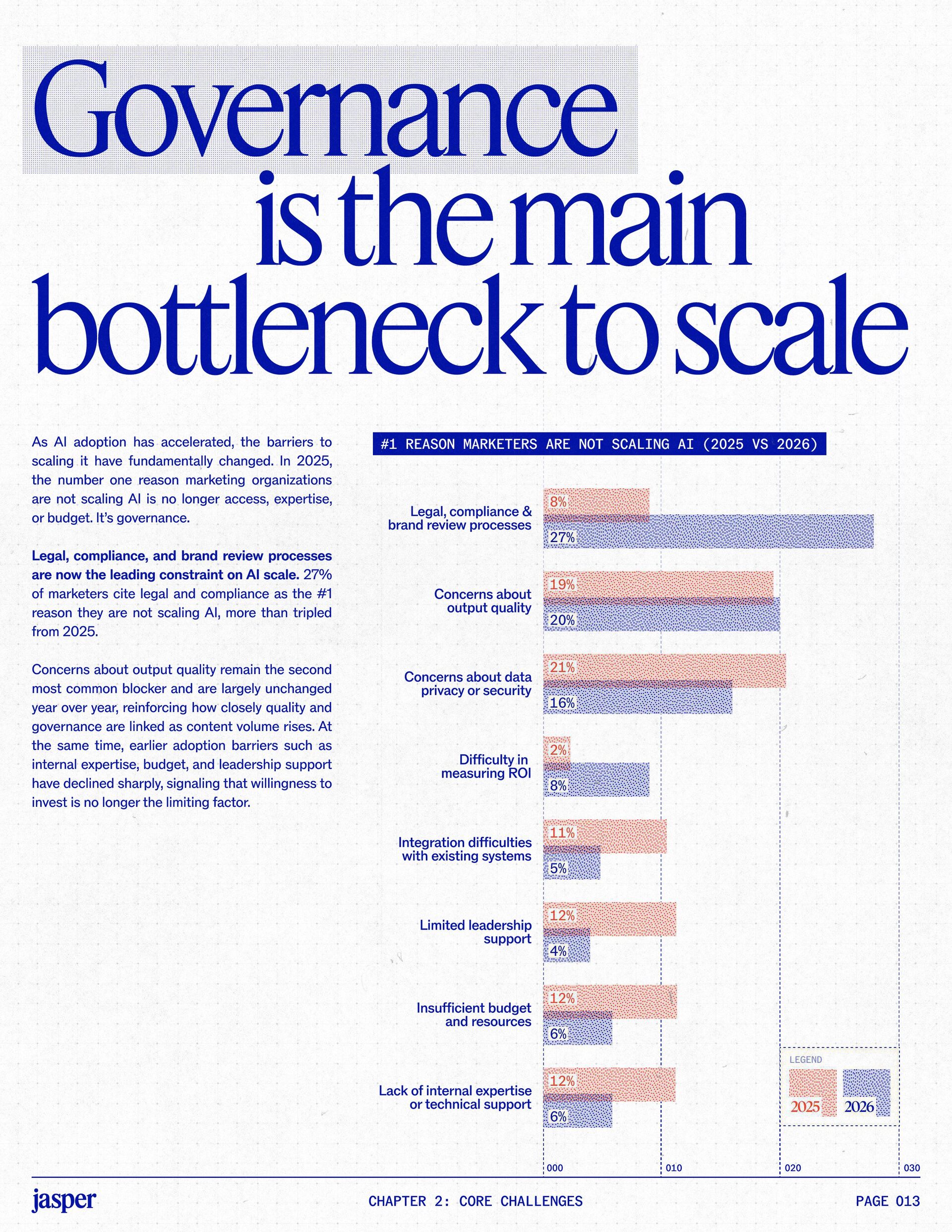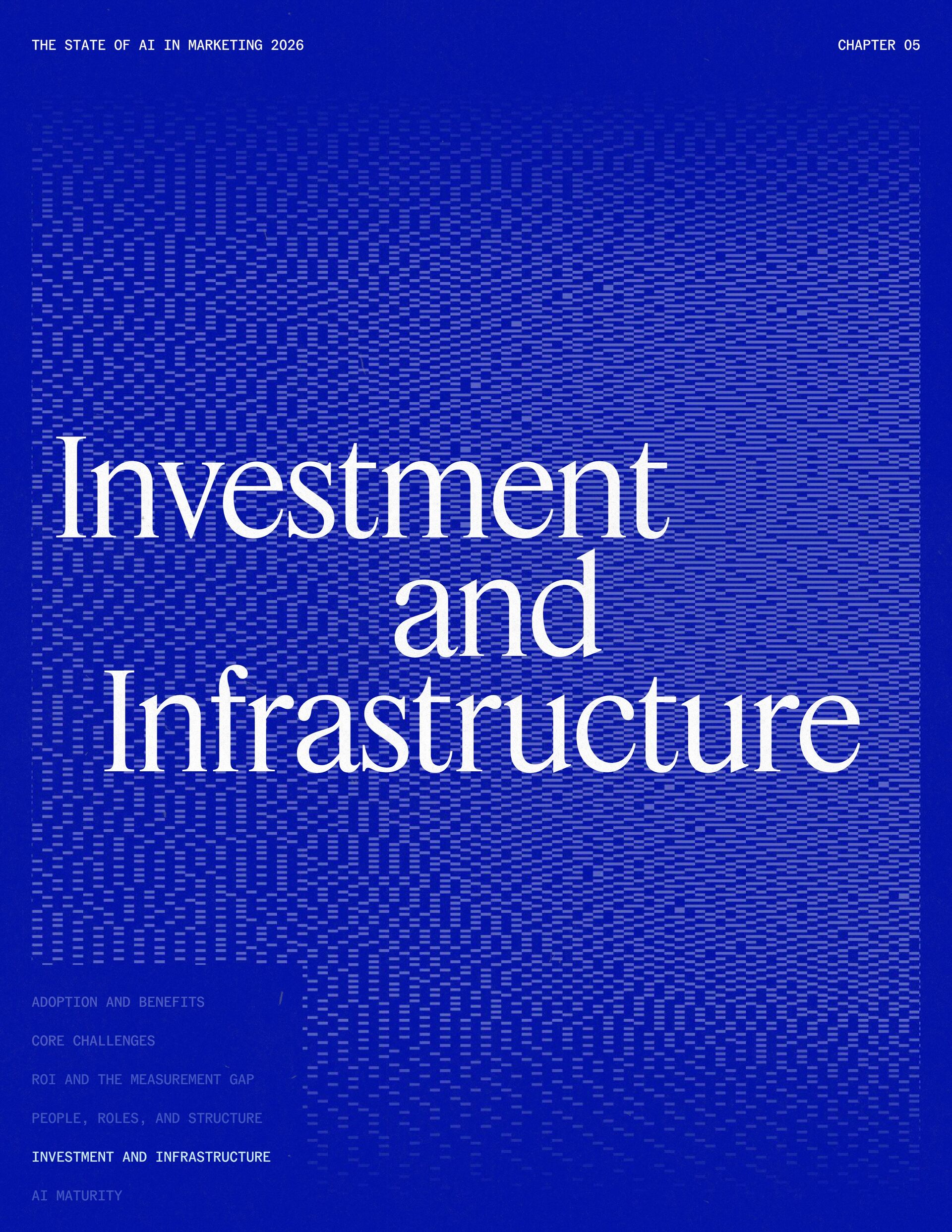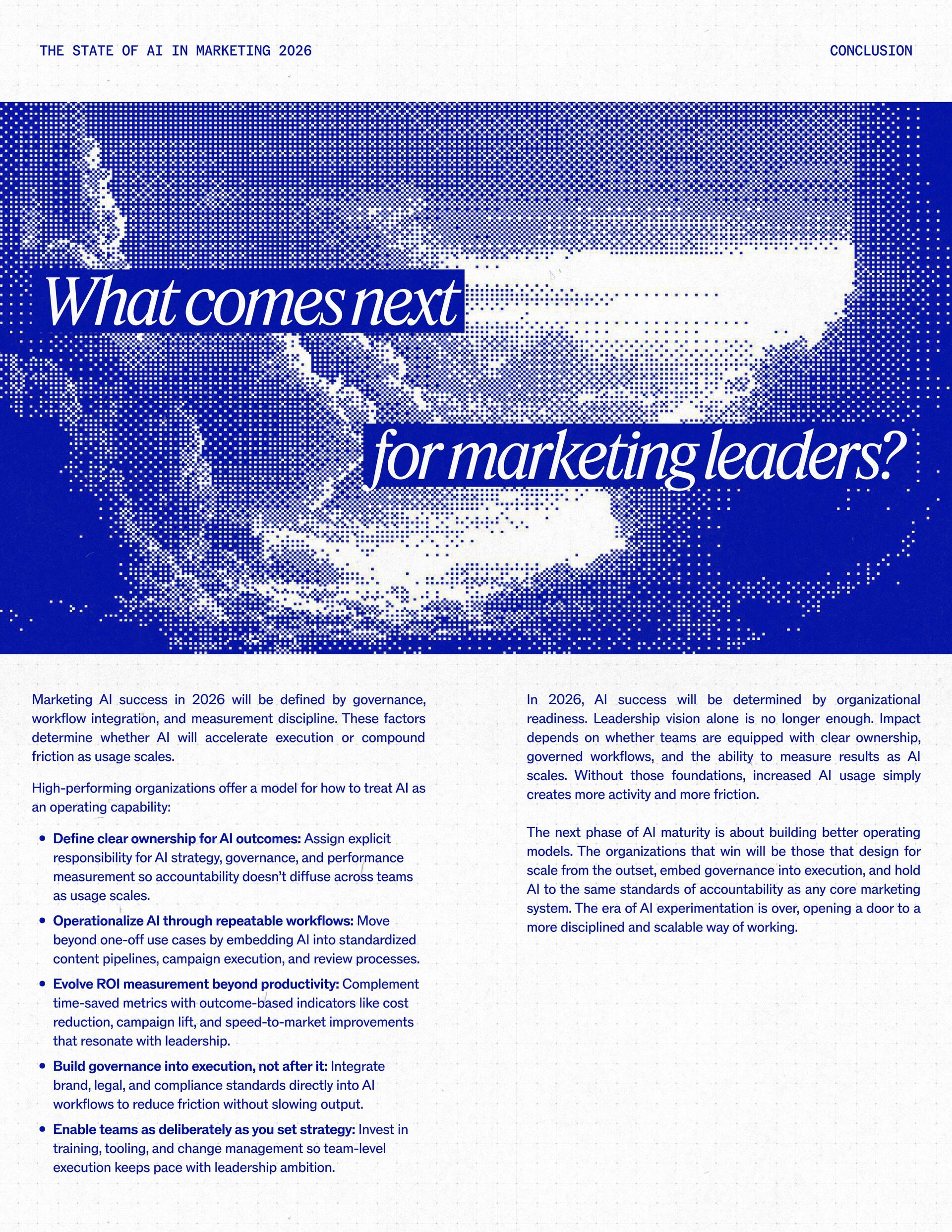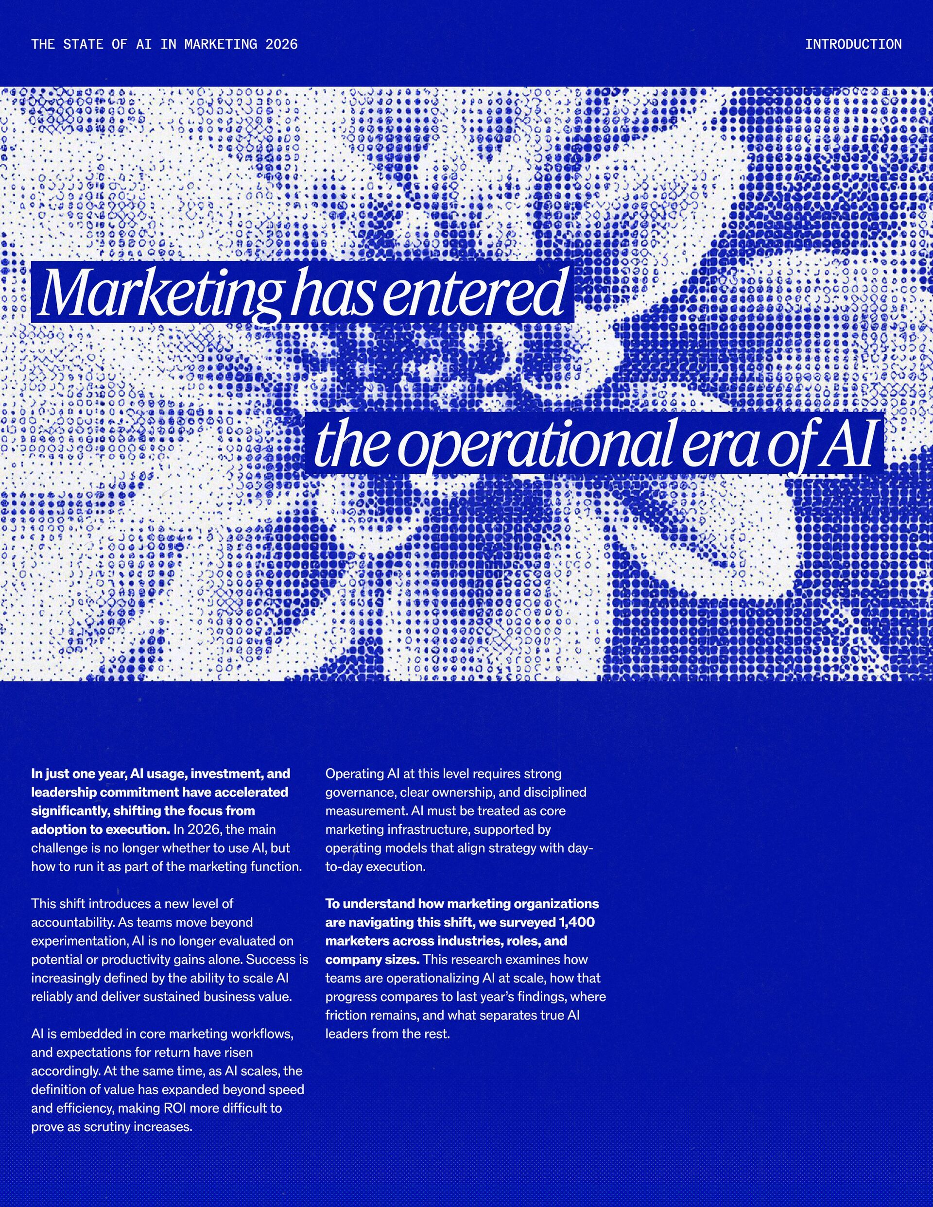 t t w o y e a r s a t J a s p e r , I ˇ v e h a d a f r o n t - r o w s e a t t o m a r k e t i n g ˇ s r e l a t i o n s h i p w i t h A I . W h a t w a s o n c e f e a r e d o r c a u t i o u s l y t e s t e d i s , i n a r e m a r k a b l y s h o r t p e r i o d o f t i m e , d r i v i n g r e a l , m e a s u r a b l e v a l u e . N o o t h e r t e c h n o l o g y i n m o d e r n m a r k e t i n g h a s m o v e d t h i s q u i c k l y f r o m n a s c e n t t o n e c e s s a r y , a n d o u r 2 0 2 6 d a t a m a k e s t h a t s h i f t u n m i s t a k a b l y c l e a r . C o m p a r e d t o l a s t y e a r , w e s a w a d e c i s i v e c h a n g e i n b o t h a d o p t i o n a n d e x p e c t a t i o n s . I n e a r l y 2 0 2 5 , m a r k e t e r s w e r e s t i l l e v a l u a t i n g w h e t h e r A I b e l o n g e d i n t h e i r w o r k f l o w s a t a l l . € O n e y e a r l a t e r , t h e c o n v e r s a t i o n h a s f u n d a m e n t a l l y c h a n g e d . T o d a y , m a r k e t i n g s i t s a t t h e c e n t e r o f e n t e r p r i s e A I a d o p t i o n . ( N o o t h e r f u n c t i o n a p p l i e s A I a s b r o a d l y o r a s v i s i b l y a c r o s s ( d a t a , c o n t e n t , c r e a t i v i t y , s p e e d , a n d s c a l e . W h a t b e g a n a s a p r o d u c t i v i t y u n l o c k h a s b e c o m e a d e f i n i n g l e a d e r s h i p o p p o r t u n i t y f o r m a r k e t i n g o r g a n i z a t i o n s . T h a t p o s i t i o n b r i n g s n e w e x p e c t a t i o n s . M a r k e t i n g i s w h e r e A I ˇ s i m p a c t i s p r o v e n f i r s t , a n d w h e r e d e m a n d s r i s e f a s t e s t . S p e e d a n d e f f i c i e n c y a r e n o l o n g e r d i f f e r e n t i a t o r s . T h e f o c u s h a s s h i f t e d t o i m p a c t , a c c o u n t a b i l i t y , a n d v a l u e c r e a t i o n , a n d m a r k e t i n g c a n n o l o n g e r o p e r a t e i n i s o l a t i o n . A s A I s c a l e s , t h e r e s t o f t h e e n t e r p r i s e i s m o v i n g q u i c k l y t o c a t c h u p . L e g a l , c o m p l i a n c e , r i s k , a n d g o v e r n a n c e t e a m s a r e n o w a c t i v e l y s h a p i n g h o w A I i s u s e d , m e a s u r e d , a n d m a n a g e d . T h e i r i n v o l v e m e n t m a r k s t h e n e x t s t a g e o f A I m a t u r i t y , o n e w h e r e s t a n d a r d s , g u a r d r a i l s , a n d o w n e r s h i p m a t t e r a s m u c h a s i n n o v a t i o n a n d s p e e d . T h i s r e s e a r c h r e f l e c t s t h a t s h i f t c l e a r l y . A s a d o p t i o n a c c e l e r a t e s , e x p e c t a t i o n s f o r r e t u r n r i s e w i t h i t . W h i l e A I c o n t i n u e s t o d e l i v e r g a i n s i n s p e e d a n d e f f i c i e n c y , t r a n s l a t i n g t h a t m o m e n t u m i n t o m e a n i n g f u l b u s i n e s s R O I h a s b e c o m e m o r e c o m p l e x . M e a s u r e m e n t s t a n d a r d s a r e h i g h e r , a n d p r o d u c t i v i t y a l o n e n o l o n g e r m e e t s t h e d e m a n d s p l a c e d o n m o d e r n m a r k e t i n g o r g a n i z a t i o n s . T h e o r g a n i z a t i o n s t h a t h a v e a d a p t e d t o t h i s r e a l i t y a r e a l r e a d y s e e i n g t h e p a y o f f , r e p o r t i n g m o r e t h a n 2 x t h e R O I o n t h e i r A I i n v e s t m e n t s . F o r e v e r y o n e e l s e , t h e p r e s s u r e i s m o u n t i n g . A I i s n o w e m b e d d e d i n t h e m a r k e t i n g o p e r a t i n g m o d e l , a n d l e a d e r s a r e b e i n g a s k e d t o a n s w e r h a r d e r , m o r e c o n s e q u e n t i a l q u e s t i o n s : What returns are we seeing from our AI investments? How are we managing risk as we scale AI across