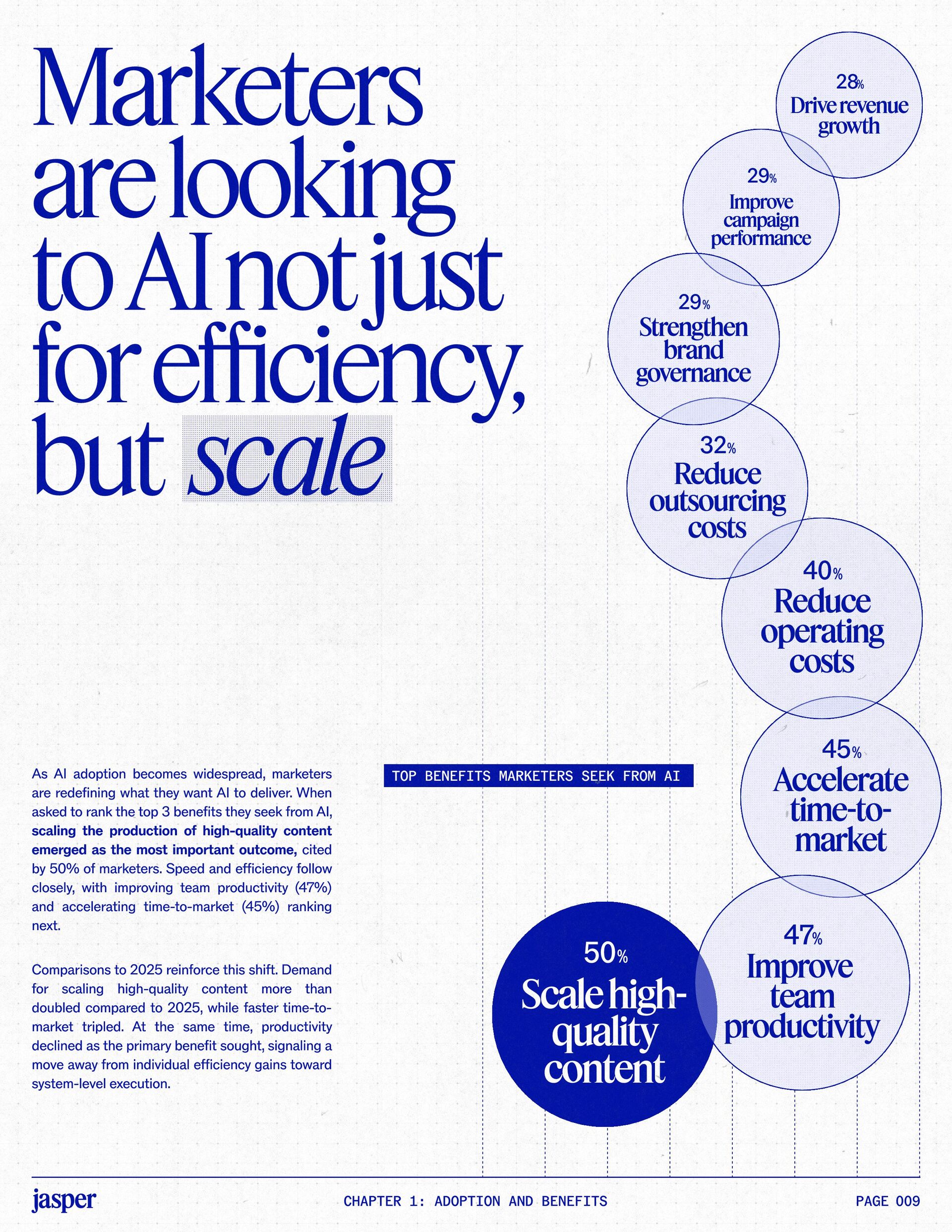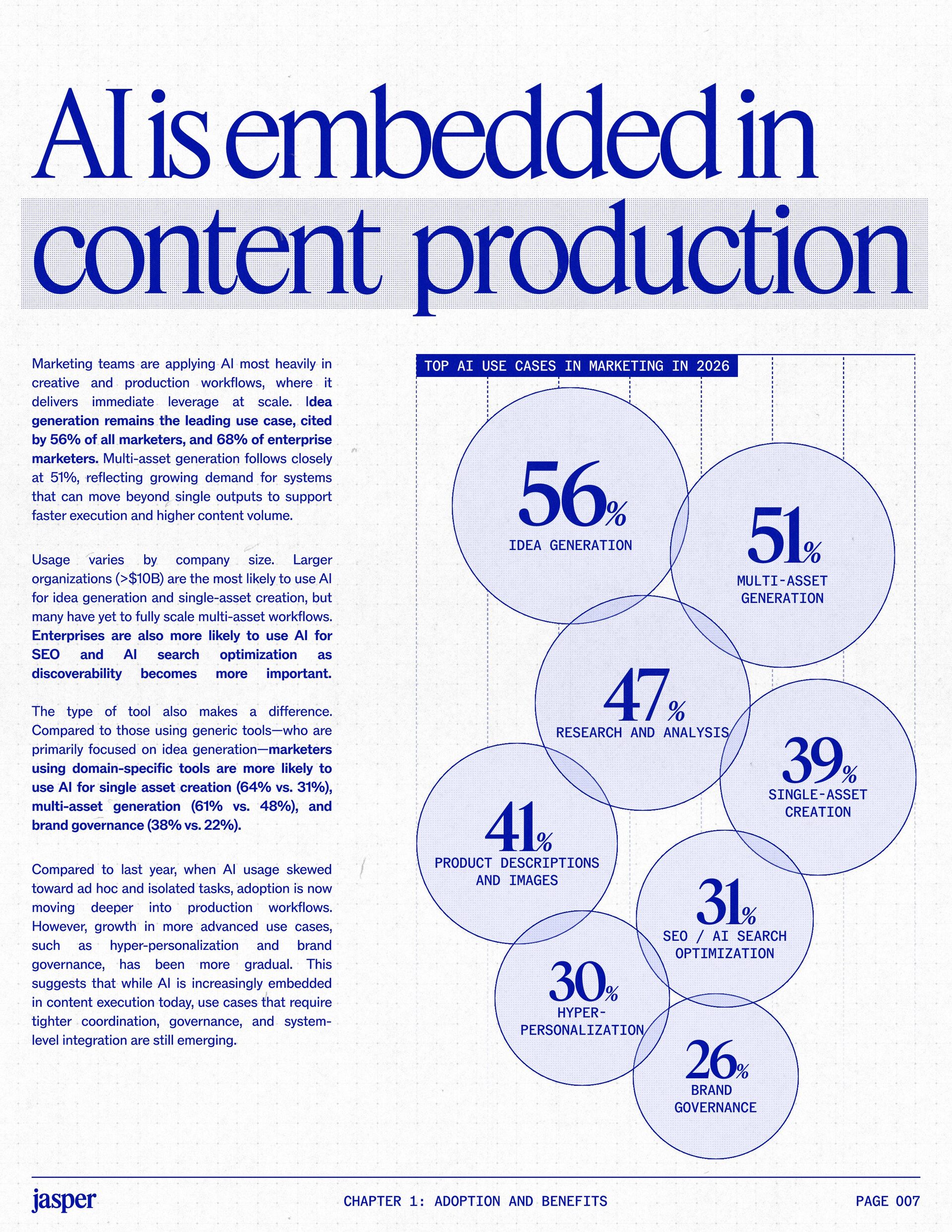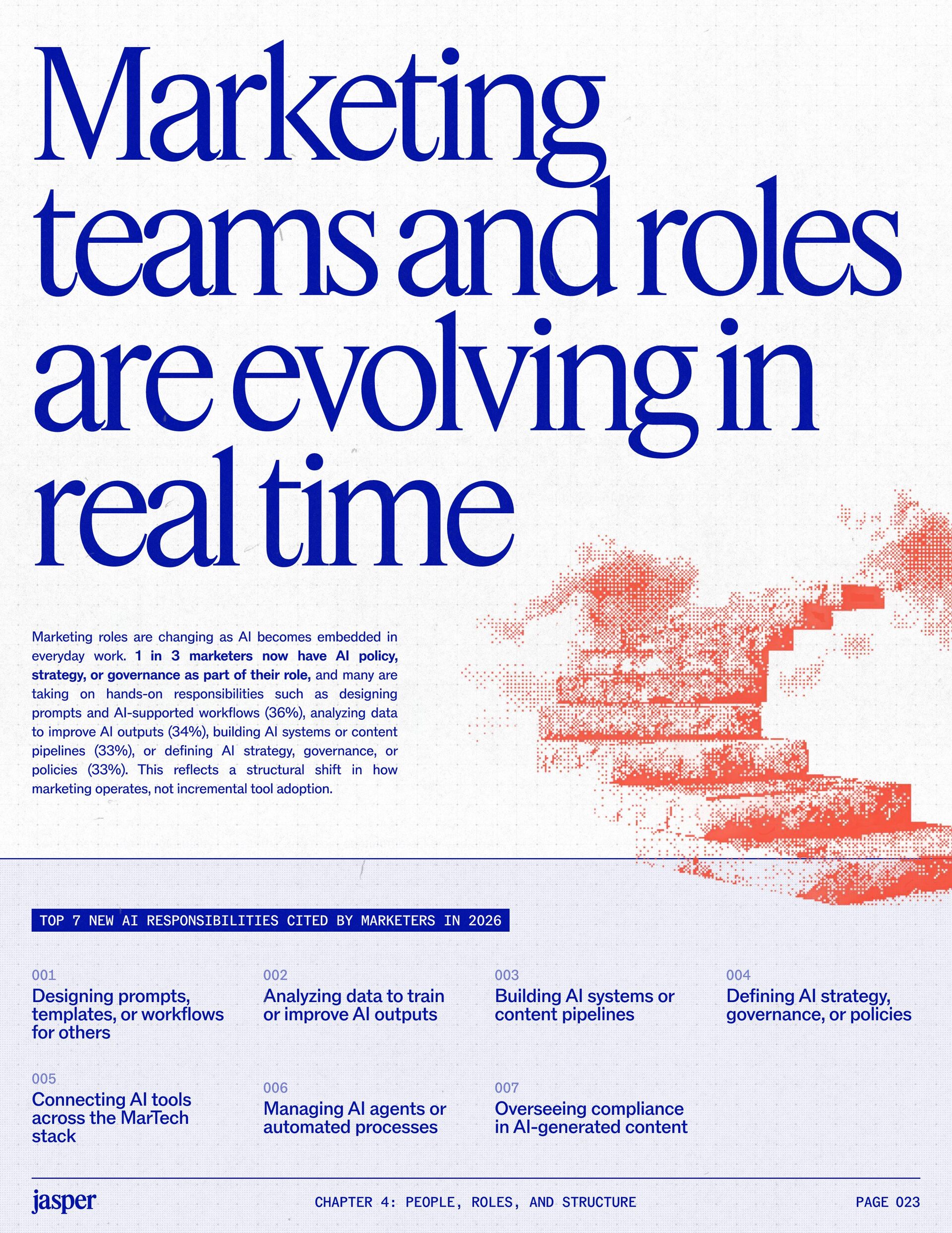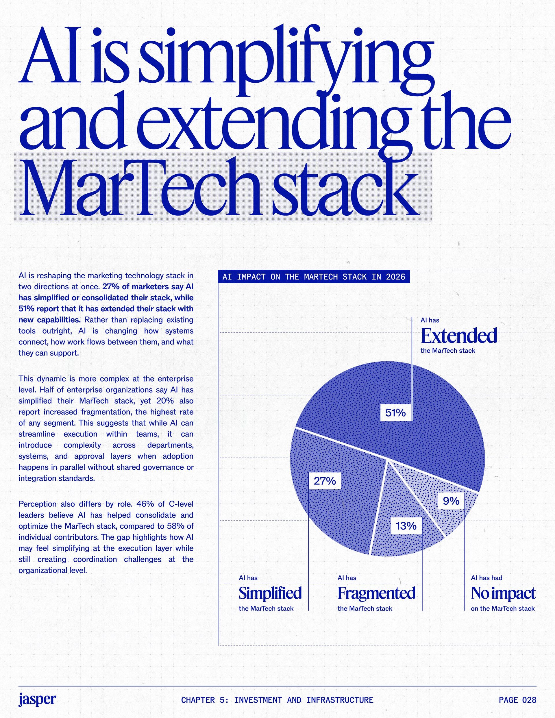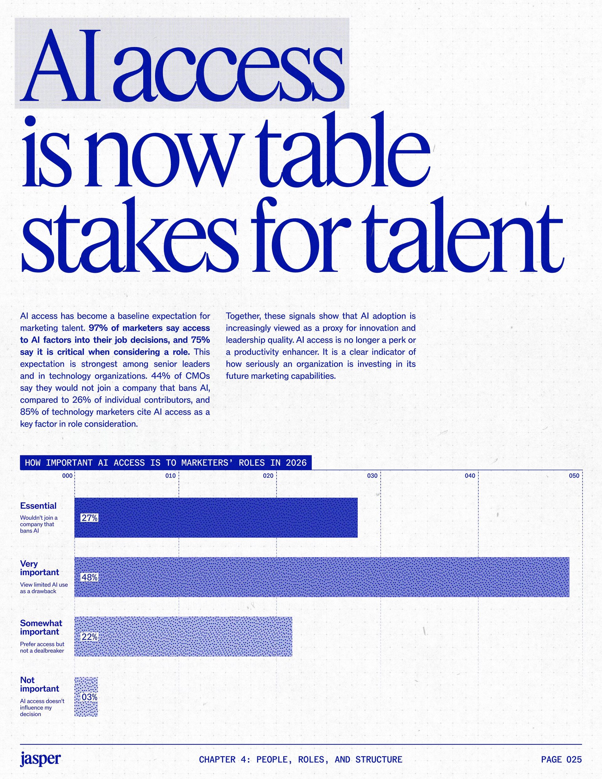 t t w o y e a r s a t J a s p e r , I ˇ v e h a d a f r o n t - r o w s e a t t o m a r k e t i n g ˇ s r e l a t i o n s h i p w i t h A I . W h a t w a s o n c e f e a r e d o r c a u t i o u s l y t e s t e d i s , i n a r e m a r k a b l y s h o r t p e r i o d o f t i m e , d r i v i n g r e a l , m e a s u r a b l e v a l u e . N o o t h e r t e c h n o l o g y i n m o d e r n m a r k e t i n g h a s m o v e d t h i s q u i c k l y f r o m n a s c e n t t o n e c e s s a r y , a n d o u r 2 0 2 6 d a t a m a k e s t h a t s h i f t u n m i s t a k a b l y c l e a r . C o m p a r e d t o l a s t y e a r , w e s a w a d e c i s i v e c h a n g e i n b o t h a d o p t i o n a n d e x p e c t a t i o n s . I n e a r l y 2 0 2 5 , m a r k e t e r s w e r e s t i l l e v a l u a t i n g w h e t h e r A I b e l o n g e d i n t h e i r w o r k f l o w s a t a l l . € O n e y e a r l a t e r , t h e c o n v e r s a t i o n h a s f u n d a m e n t a l l y c h a n g e d . T o d a y , m a r k e t i n g s i t s a t t h e c e n t e r o f e n t e r p r i s e A I a d o p t i o n . ( N o o t h e r f u n c t i o n a p p l i e s A I a s b r o a d l y o r a s v i s i b l y a c r o s s ( d a t a , c o n t e n t , c r e a t i v i t y , s p e e d , a n d s c a l e . W h a t b e g a n a s a p r o d u c t i v i t y u n l o c k h a s b e c o m e a d e f i n i n g l e a d e r s h i p o p p o r t u n i t y f o r m a r k e t i n g o r g a n i z a t i o n s . T h a t p o s i t i o n b r i n g s n e w e x p e c t a t i o n s . M a r k e t i n g i s w h e r e A I ˇ s i m p a c t i s p r o v e n f i r s t , a n d w h e r e d e m a n d s r i s e f a s t e s t . S p e e d a n d e f f i c i e n c y a r e n o l o n g e r d i f f e r e n t i a t o r s . T h e f o c u s h a s s h i f t e d t o i m p a c t , a c c o u n t a b i l i t y , a n d v a l u e c r e a t i o n , a n d m a r k e t i n g c a n n o l o n g e r o p e r a t e i n i s o l a t i o n . A s A I s c a l e s , t h e r e s t o f t h e e n t e r p r i s e i s m o v i n g q u i c k l y t o c a t c h u p . L e g a l , c o m p l i a n c e , r i s k , a n d g o v e r n a n c e t e a m s a r e n o w a c t i v e l y s h a p i n g h o w A I i s u s e d , m e a s u r e d , a n d m a n a g e d . T h e i r i n v o l v e m e n t m a r k s t h e n e x t s t a g e o f A I m a t u r i t y , o n e w h e r e s t a n d a r d s , g u a r d r a i l s , a n d o w n e r s h i p m a t t e r a s m u c h a s i n n o v a t i o n a n d s p e e d . T h i s r e s e a r c h r e f l e c t s t h a t s h i f t c l e a r l y . A s a d o p t i o n a c c e l e r a t e s , e x p e c t a t i o n s f o r r e t u r n r i s e w i t h i t . W h i l e A I c o n t i n u e s t o d e l i v e r g a i n s i n s p e e d a n d e f f i c i e n c y , t r a n s l a t i n g t h a t m o m e n t u m i n t o m e a n i n g f u l b u s i n e s s R O I h a s b e c o m e m o r e c o m p l e x . M e a s u r e m e n t s t a n d a r d s a r e h i g h e r , a n d p r o d u c t i v i t y a l o n e n o l o n g e r m e e t s t h e d e m a n d s p l a c e d o n m o d e r n m a r k e t i n g o r g a n i z a t i o n s . T h e o r g a n i z a t i o n s t h a t h a v e a d a p t e d t o t h i s r e a l i t y a r e a l r e a d y s e e i n g t h e p a y o f f , r e p o r t i n g m o r e t h a n 2 x t h e R O I o n t h e i r A I i n v e s t m e n t s . F o r e v e r y o n e e l s e , t h e p r e s s u r e i s m o u n t i n g . A I i s n o w e m b e d d e d i n t h e m a r k e t i n g o p e r a t i n g m o d e l , a n d l e a d e r s a r e b e i n g a s k e d t o a n s w e r h a r d e r , m o r e c o n s e q u e n t i a l q u e s t i o n s : What returns are we seeing from our AI investments? How are we managing risk as we scale AI across
