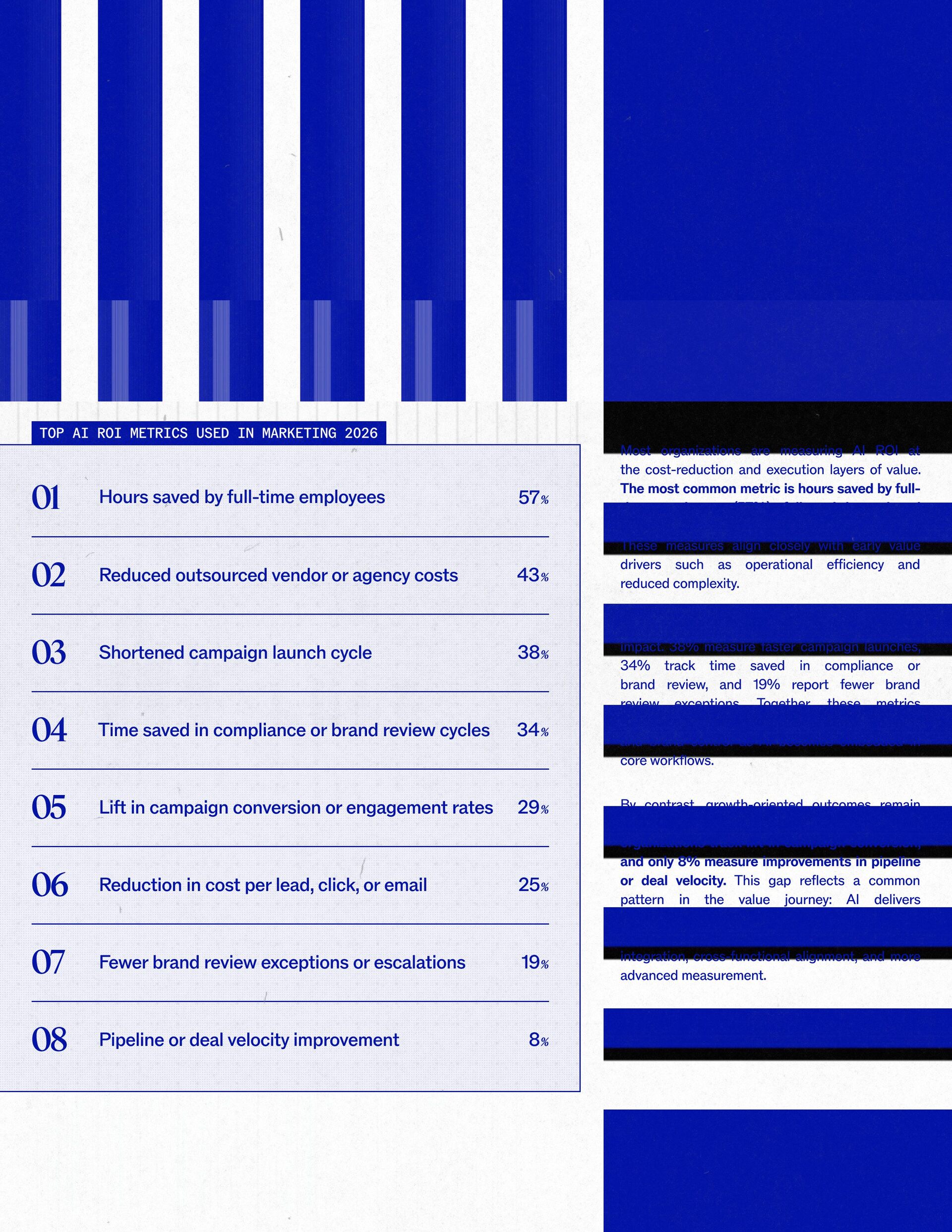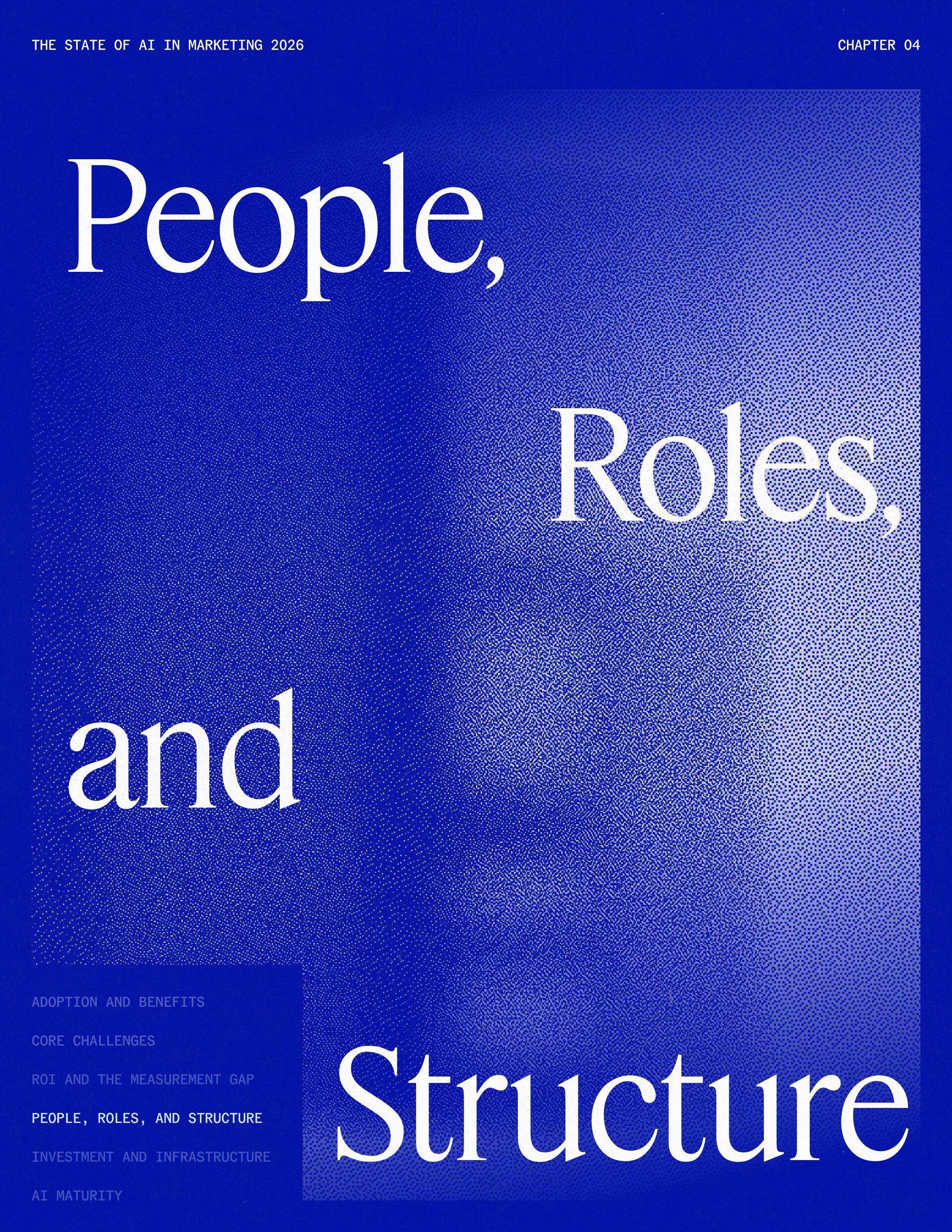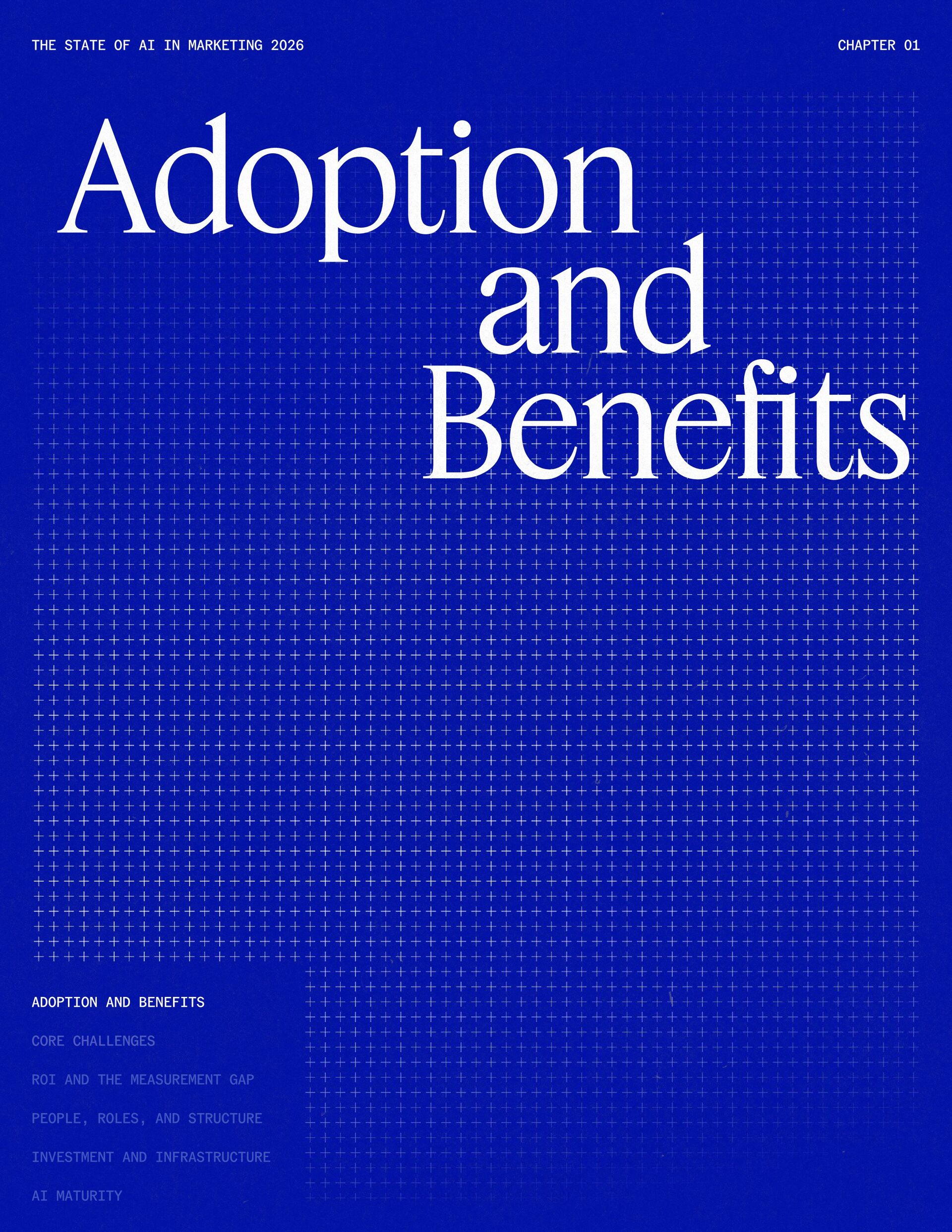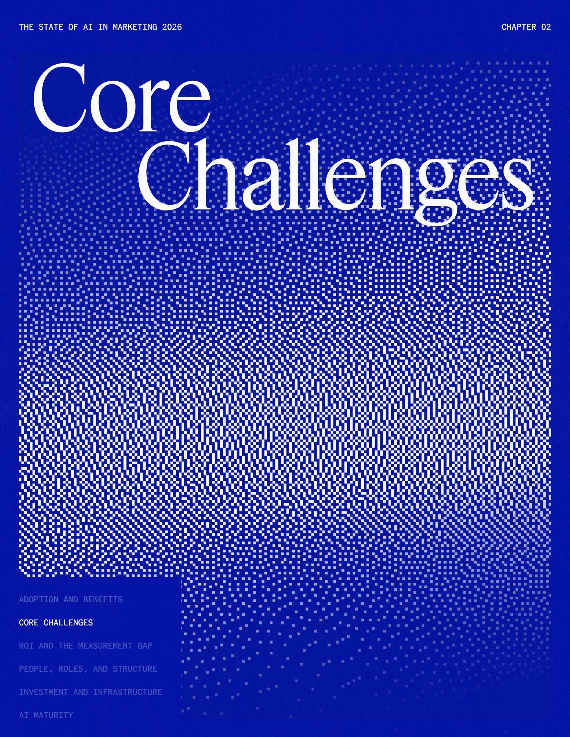 t t w o y e a r s a t J a s p e r , I ˇ v e h a d a f r o n t - r o w s e a t t o m a r k e t i n g ˇ s r e l a t i o n s h i p w i t h A I . W h a t w a s o n c e f e a r e d o r c a u t i o u s l y t e s t e d i s , i n a r e m a r k a b l y s h o r t p e r i o d o f t i m e , d r i v i n g r e a l , m e a s u r a b l e v a l u e . N o o t h e r t e c h n o l o g y i n m o d e r n m a r k e t i n g h a s m o v e d t h i s q u i c k l y f r o m n a s c e n t t o n e c e s s a r y , a n d o u r 2 0 2 6 d a t a m a k e s t h a t s h i f t u n m i s t a k a b l y c l e a r . C o m p a r e d t o l a s t y e a r , w e s a w a d e c i s i v e c h a n g e i n b o t h a d o p t i o n a n d e x p e c t a t i o n s . I n e a r l y 2 0 2 5 , m a r k e t e r s w e r e s t i l l e v a l u a t i n g w h e t h e r A I b e l o n g e d i n t h e i r w o r k f l o w s a t a l l . € O n e y e a r l a t e r , t h e c o n v e r s a t i o n h a s f u n d a m e n t a l l y c h a n g e d . T o d a y , m a r k e t i n g s i t s a t t h e c e n t e r o f e n t e r p r i s e A I a d o p t i o n . ( N o o t h e r f u n c t i o n a p p l i e s A I a s b r o a d l y o r a s v i s i b l y a c r o s s ( d a t a , c o n t e n t , c r e a t i v i t y , s p e e d , a n d s c a l e . W h a t b e g a n a s a p r o d u c t i v i t y u n l o c k h a s b e c o m e a d e f i n i n g l e a d e r s h i p o p p o r t u n i t y f o r m a r k e t i n g o r g a n i z a t i o n s . T h a t p o s i t i o n b r i n g s n e w e x p e c t a t i o n s . M a r k e t i n g i s w h e r e A I ˇ s i m p a c t i s p r o v e n f i r s t , a n d w h e r e d e m a n d s r i s e f a s t e s t . S p e e d a n d e f f i c i e n c y a r e n o l o n g e r d i f f e r e n t i a t o r s . T h e f o c u s h a s s h i f t e d t o i m p a c t , a c c o u n t a b i l i t y , a n d v a l u e c r e a t i o n , a n d m a r k e t i n g c a n n o l o n g e r o p e r a t e i n i s o l a t i o n . A s A I s c a l e s , t h e r e s t o f t h e e n t e r p r i s e i s m o v i n g q u i c k l y t o c a t c h u p . L e g a l , c o m p l i a n c e , r i s k , a n d g o v e r n a n c e t e a m s a r e n o w a c t i v e l y s h a p i n g h o w A I i s u s e d , m e a s u r e d , a n d m a n a g e d . T h e i r i n v o l v e m e n t m a r k s t h e n e x t s t a g e o f A I m a t u r i t y , o n e w h e r e s t a n d a r d s , g u a r d r a i l s , a n d o w n e r s h i p m a t t e r a s m u c h a s i n n o v a t i o n a n d s p e e d . T h i s r e s e a r c h r e f l e c t s t h a t s h i f t c l e a r l y . A s a d o p t i o n a c c e l e r a t e s , e x p e c t a t i o n s f o r r e t u r n r i s e w i t h i t . W h i l e A I c o n t i n u e s t o d e l i v e r g a i n s i n s p e e d a n d e f f i c i e n c y , t r a n s l a t i n g t h a t m o m e n t u m i n t o m e a n i n g f u l b u s i n e s s R O I h a s b e c o m e m o r e c o m p l e x . M e a s u r e m e n t s t a n d a r d s a r e h i g h e r , a n d p r o d u c t i v i t y a l o n e n o l o n g e r m e e t s t h e d e m a n d s p l a c e d o n m o d e r n m a r k e t i n g o r g a n i z a t i o n s . T h e o r g a n i z a t i o n s t h a t h a v e a d a p t e d t o t h i s r e a l i t y a r e a l r e a d y s e e i n g t h e p a y o f f , r e p o r t i n g m o r e t h a n 2 x t h e R O I o n t h e i r A I i n v e s t m e n t s . F o r e v e r y o n e e l s e , t h e p r e s s u r e i s m o u n t i n g . A I i s n o w e m b e d d e d i n t h e m a r k e t i n g o p e r a t i n g m o d e l , a n d l e a d e r s a r e b e i n g a s k e d t o a n s w e r h a r d e r , m o r e c o n s e q u e n t i a l q u e s t i o n s : What returns are we seeing from our AI investments? How are we managing risk as we scale AI across