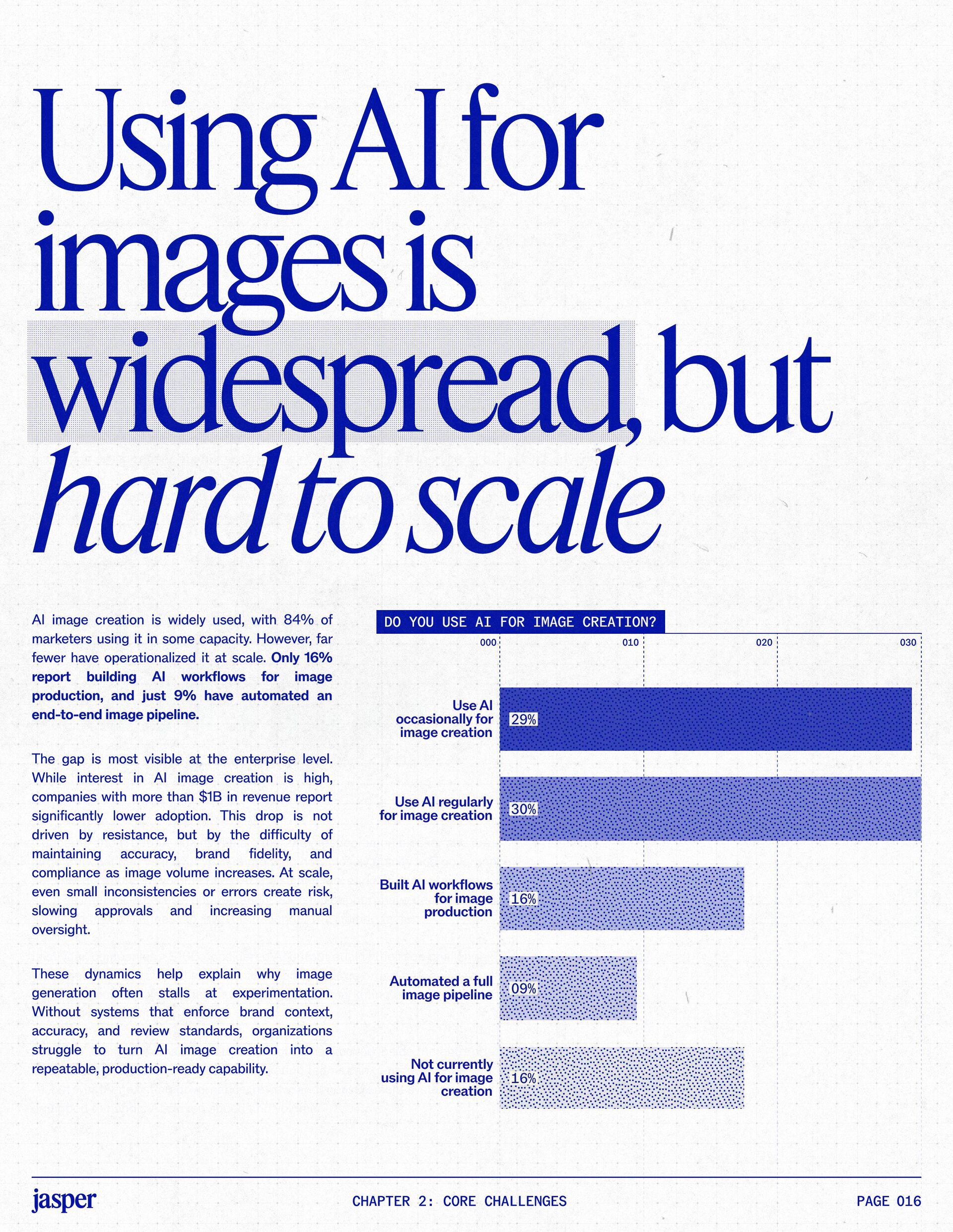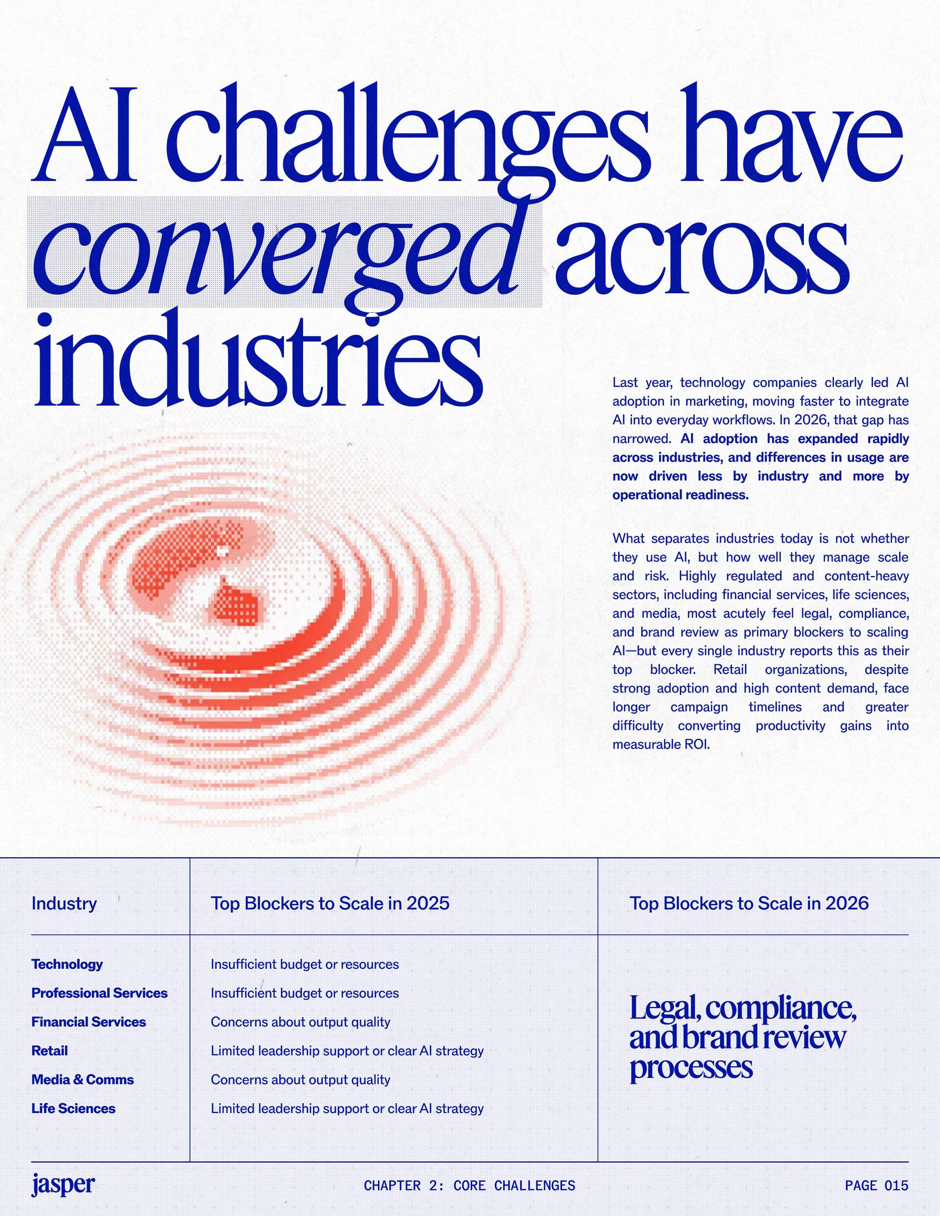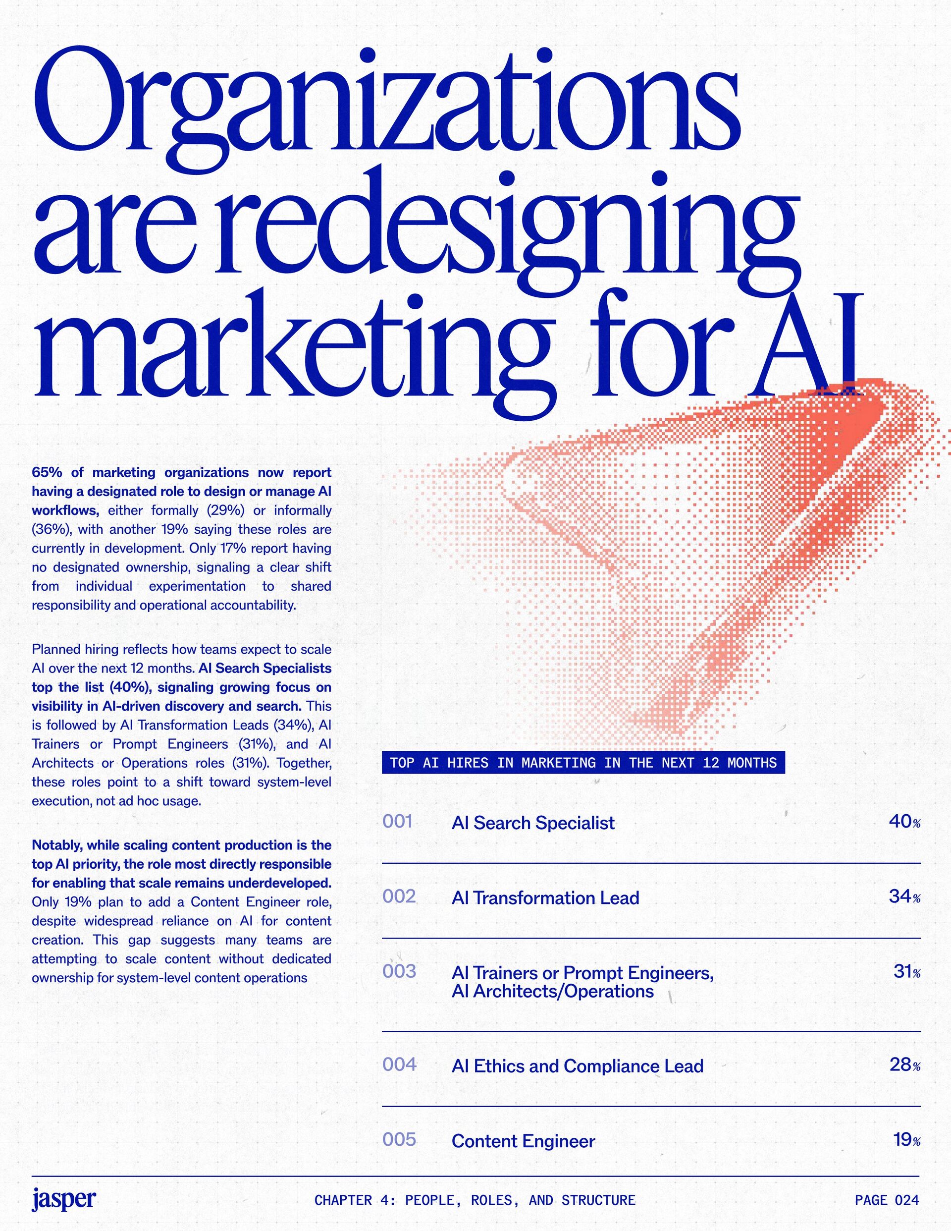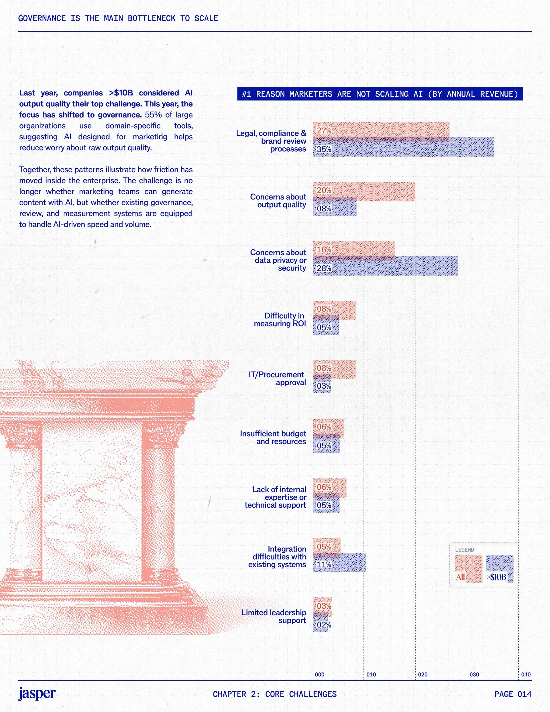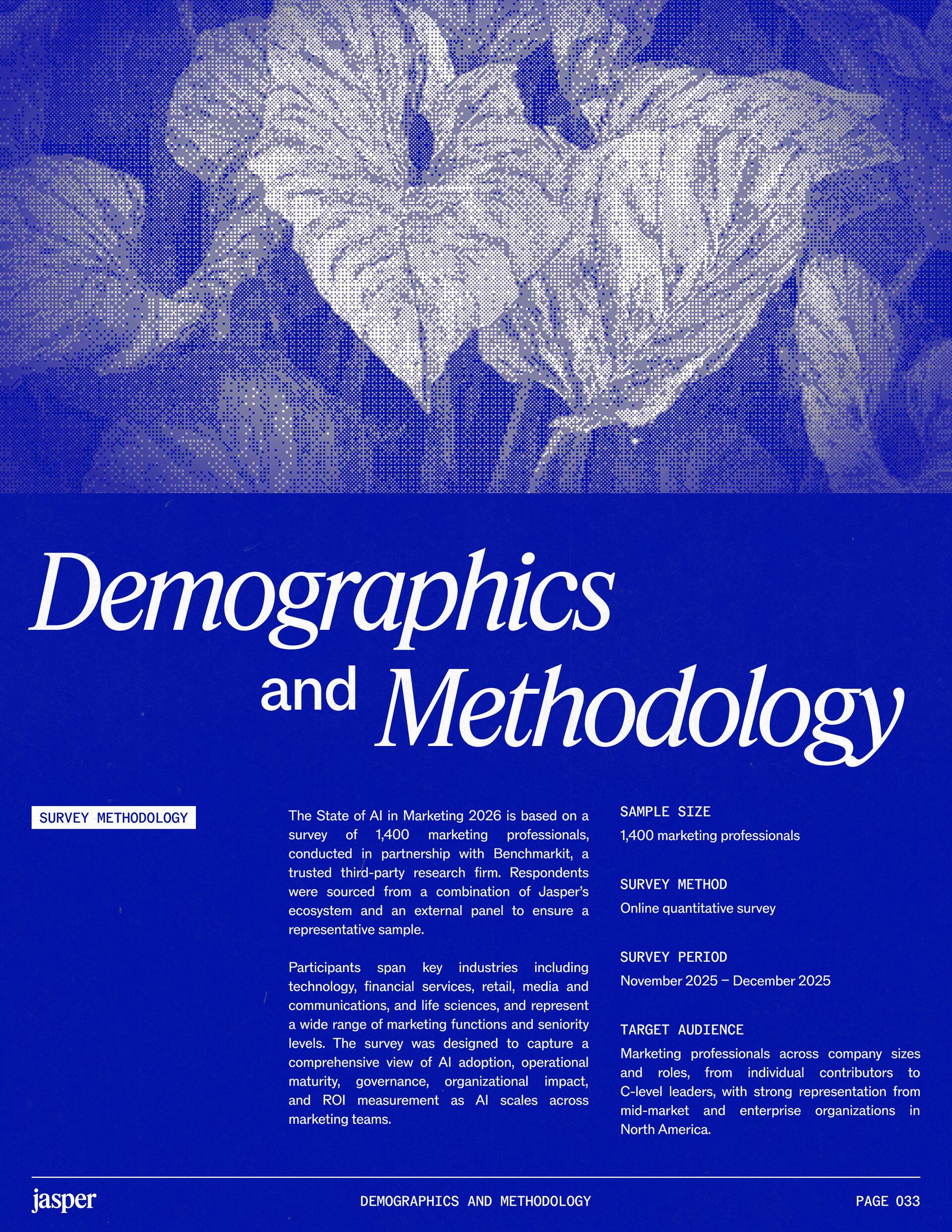 t t w o y e a r s a t J a s p e r , I ˇ v e h a d a f r o n t - r o w s e a t t o m a r k e t i n g ˇ s r e l a t i o n s h i p w i t h A I . W h a t w a s o n c e f e a r e d o r c a u t i o u s l y t e s t e d i s , i n a r e m a r k a b l y s h o r t p e r i o d o f t i m e , d r i v i n g r e a l , m e a s u r a b l e v a l u e . N o o t h e r t e c h n o l o g y i n m o d e r n m a r k e t i n g h a s m o v e d t h i s q u i c k l y f r o m n a s c e n t t o n e c e s s a r y , a n d o u r 2 0 2 6 d a t a m a k e s t h a t s h i f t u n m i s t a k a b l y c l e a r . C o m p a r e d t o l a s t y e a r , w e s a w a d e c i s i v e c h a n g e i n b o t h a d o p t i o n a n d e x p e c t a t i o n s . I n e a r l y 2 0 2 5 , m a r k e t e r s w e r e s t i l l e v a l u a t i n g w h e t h e r A I b e l o n g e d i n t h e i r w o r k f l o w s a t a l l . € O n e y e a r l a t e r , t h e c o n v e r s a t i o n h a s f u n d a m e n t a l l y c h a n g e d . T o d a y , m a r k e t i n g s i t s a t t h e c e n t e r o f e n t e r p r i s e A I a d o p t i o n . ( N o o t h e r f u n c t i o n a p p l i e s A I a s b r o a d l y o r a s v i s i b l y a c r o s s ( d a t a , c o n t e n t , c r e a t i v i t y , s p e e d , a n d s c a l e . W h a t b e g a n a s a p r o d u c t i v i t y u n l o c k h a s b e c o m e a d e f i n i n g l e a d e r s h i p o p p o r t u n i t y f o r m a r k e t i n g o r g a n i z a t i o n s . T h a t p o s i t i o n b r i n g s n e w e x p e c t a t i o n s . M a r k e t i n g i s w h e r e A I ˇ s i m p a c t i s p r o v e n f i r s t , a n d w h e r e d e m a n d s r i s e f a s t e s t . S p e e d a n d e f f i c i e n c y a r e n o l o n g e r d i f f e r e n t i a t o r s . T h e f o c u s h a s s h i f t e d t o i m p a c t , a c c o u n t a b i l i t y , a n d v a l u e c r e a t i o n , a n d m a r k e t i n g c a n n o l o n g e r o p e r a t e i n i s o l a t i o n . A s A I s c a l e s , t h e r e s t o f t h e e n t e r p r i s e i s m o v i n g q u i c k l y t o c a t c h u p . L e g a l , c o m p l i a n c e , r i s k , a n d g o v e r n a n c e t e a m s a r e n o w a c t i v e l y s h a p i n g h o w A I i s u s e d , m e a s u r e d , a n d m a n a g e d . T h e i r i n v o l v e m e n t m a r k s t h e n e x t s t a g e o f A I m a t u r i t y , o n e w h e r e s t a n d a r d s , g u a r d r a i l s , a n d o w n e r s h i p m a t t e r a s m u c h a s i n n o v a t i o n a n d s p e e d . T h i s r e s e a r c h r e f l e c t s t h a t s h i f t c l e a r l y . A s a d o p t i o n a c c e l e r a t e s , e x p e c t a t i o n s f o r r e t u r n r i s e w i t h i t . W h i l e A I c o n t i n u e s t o d e l i v e r g a i n s i n s p e e d a n d e f f i c i e n c y , t r a n s l a t i n g t h a t m o m e n t u m i n t o m e a n i n g f u l b u s i n e s s R O I h a s b e c o m e m o r e c o m p l e x . M e a s u r e m e n t s t a n d a r d s a r e h i g h e r , a n d p r o d u c t i v i t y a l o n e n o l o n g e r m e e t s t h e d e m a n d s p l a c e d o n m o d e r n m a r k e t i n g o r g a n i z a t i o n s . T h e o r g a n i z a t i o n s t h a t h a v e a d a p t e d t o t h i s r e a l i t y a r e a l r e a d y s e e i n g t h e p a y o f f , r e p o r t i n g m o r e t h a n 2 x t h e R O I o n t h e i r A I i n v e s t m e n t s . F o r e v e r y o n e e l s e , t h e p r e s s u r e i s m o u n t i n g . A I i s n o w e m b e d d e d i n t h e m a r k e t i n g o p e r a t i n g m o d e l , a n d l e a d e r s a r e b e i n g a s k e d t o a n s w e r h a r d e r , m o r e c o n s e q u e n t i a l q u e s t i o n s : What returns are we seeing from our AI investments? How are we managing risk as we scale AI across