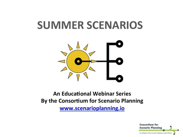 This webinar slide deck covers the basics of scenario planning for rural and urban planners and includes questions for an interview with staff members at Metrolinx of the Toronto-Hamilton, Canada metro area, along with consultants on the project with WSP. It closes with a brief introduction to the Consortium for Scenario Planning, the provider of the webinar. The companion video recording is available at https://vimeo.com/277627470. Find out more about the Consortium for Scenario Planning at www.scenarioplanning.io.