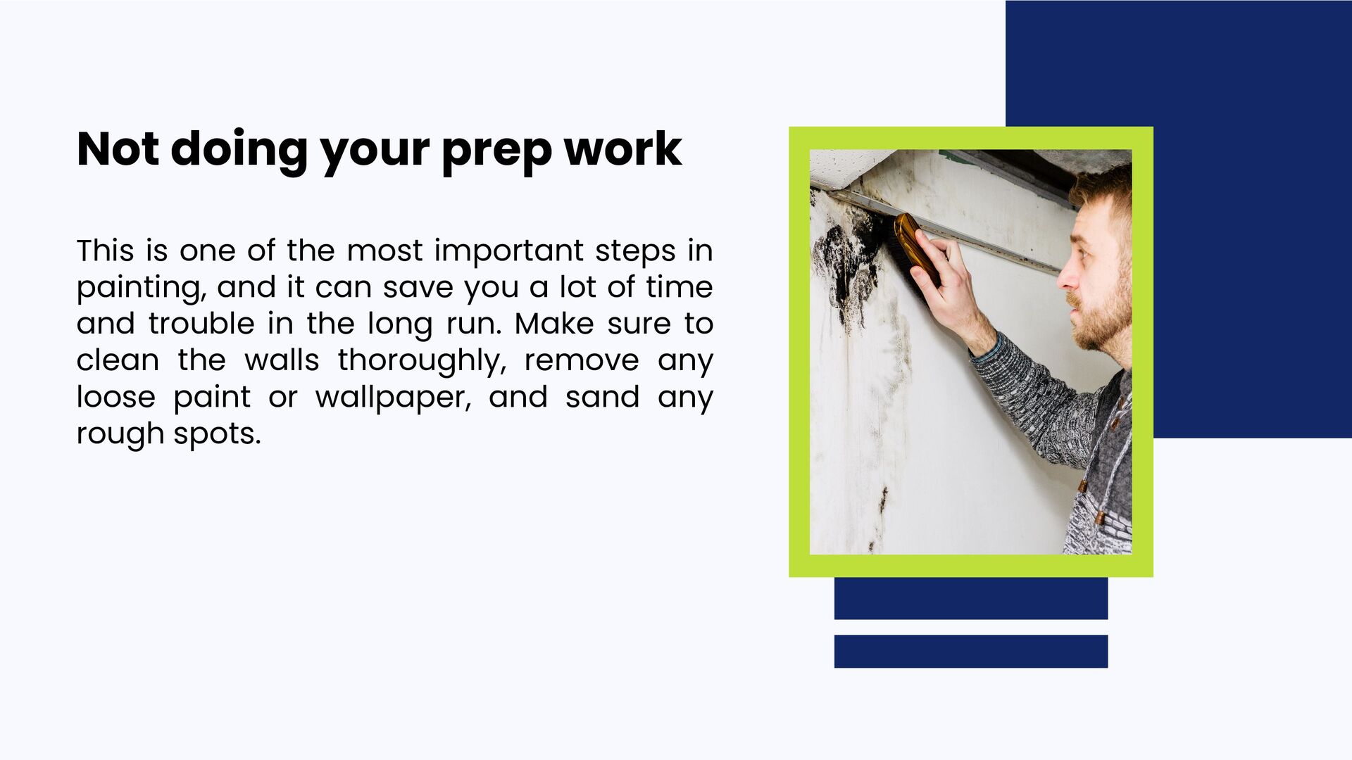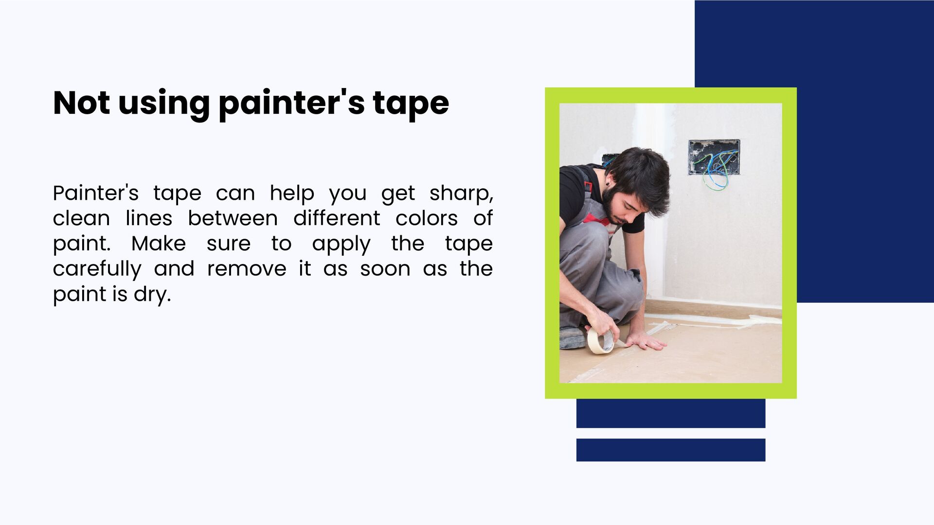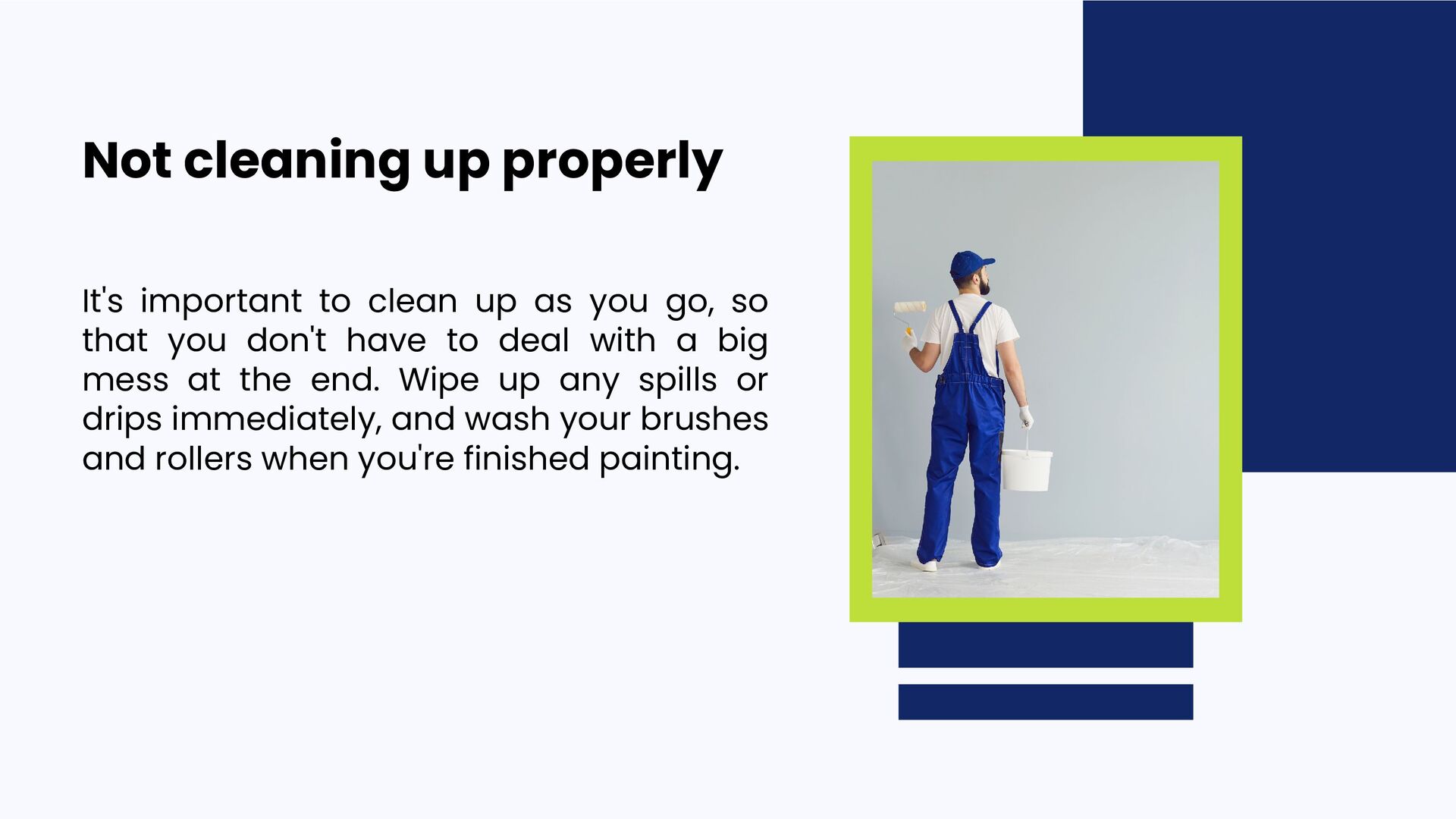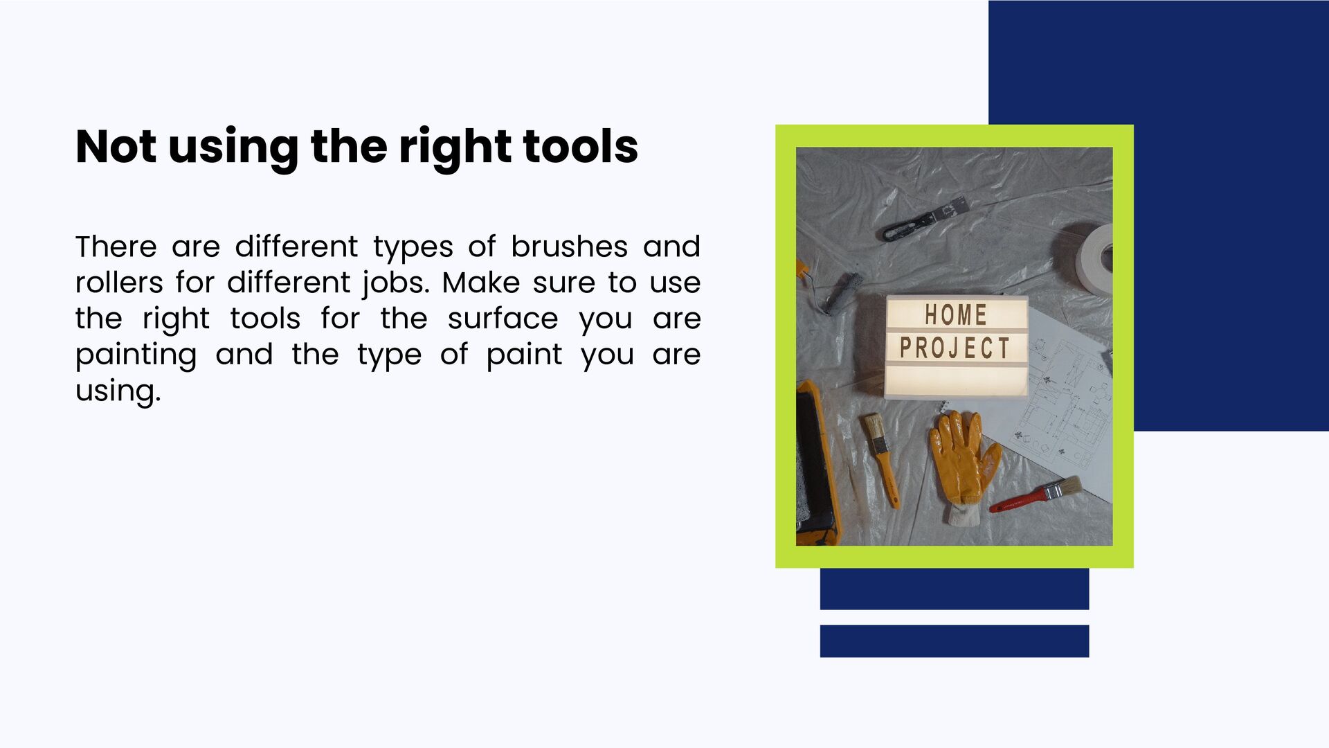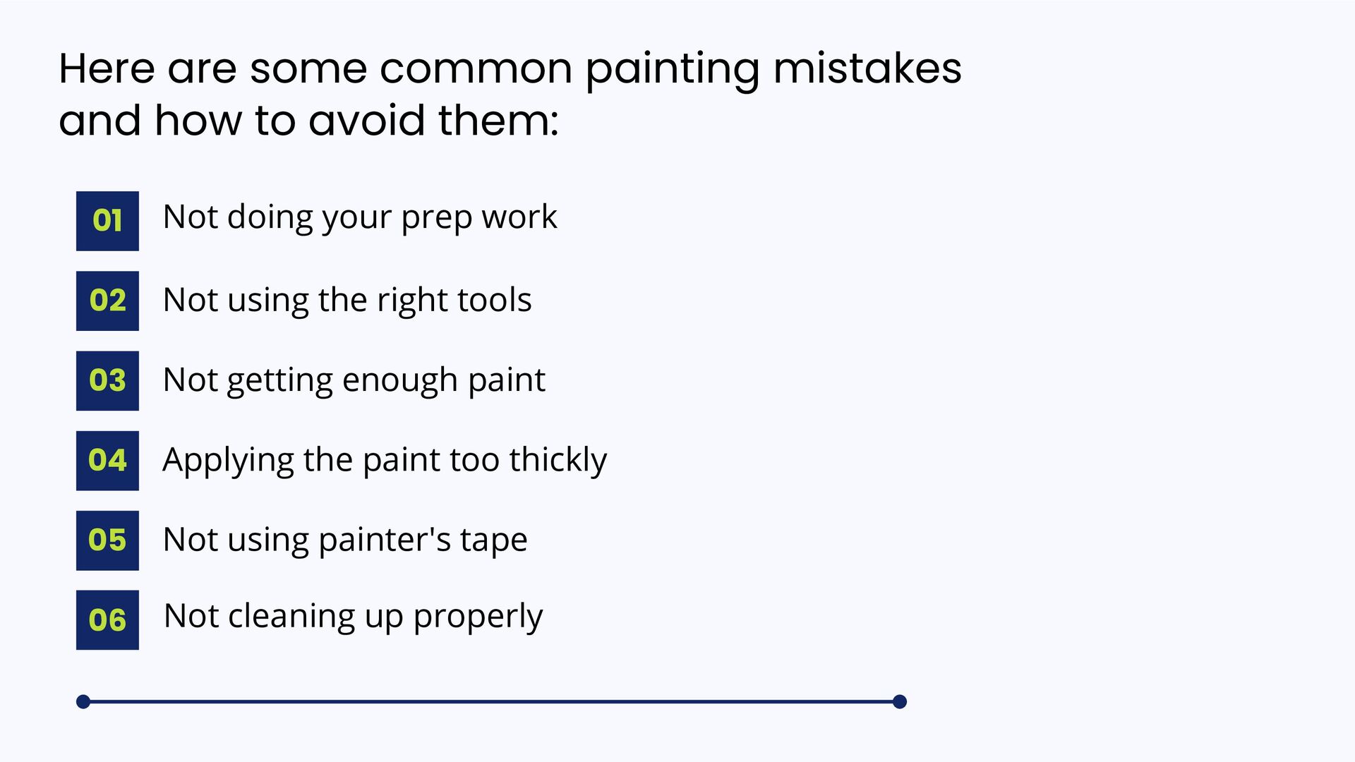 them: 01 02 03 04 05 Not doing your prep work Not using the right tools Not getting enough paint Applying the paint too thickly Not using painter's tape 06 Not cleaning up properly
