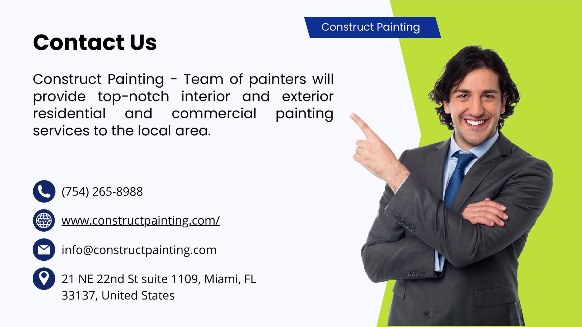 suite 1109, Miami, FL 33137, United States Construct Painting - Team of painters will provide top-notch interior and exterior residential and commercial painting services to the local area. Construct Painting