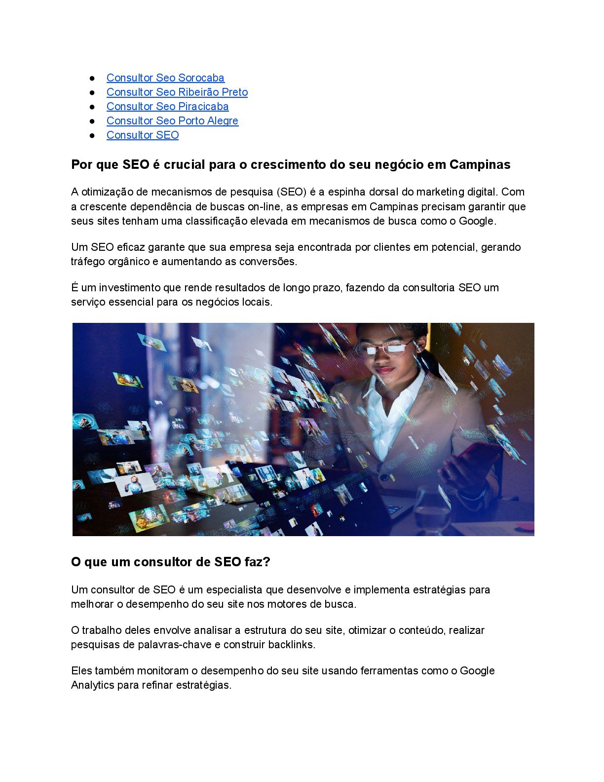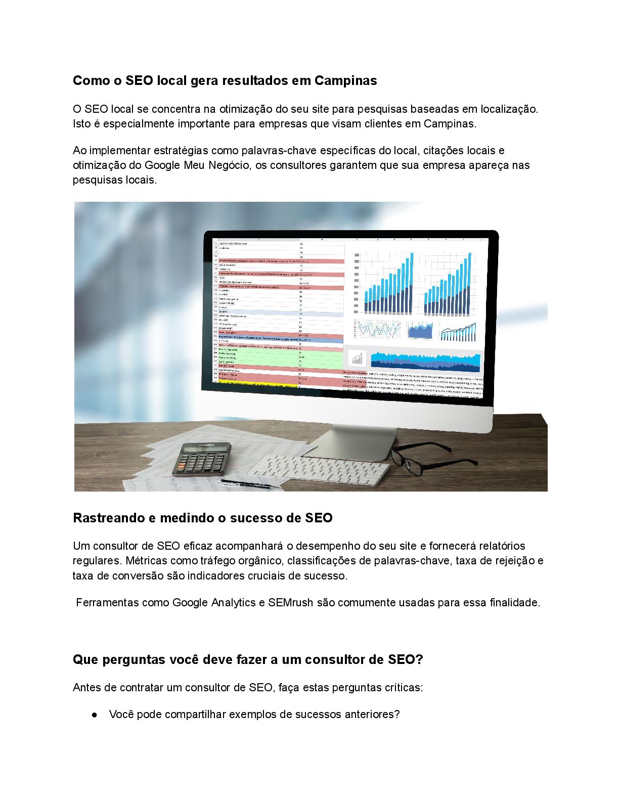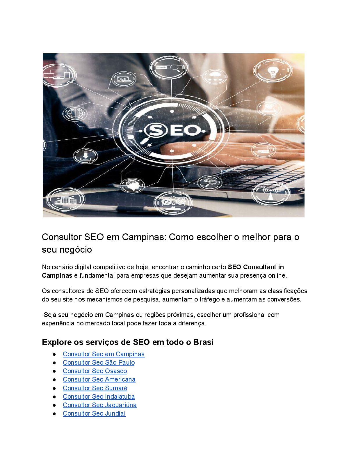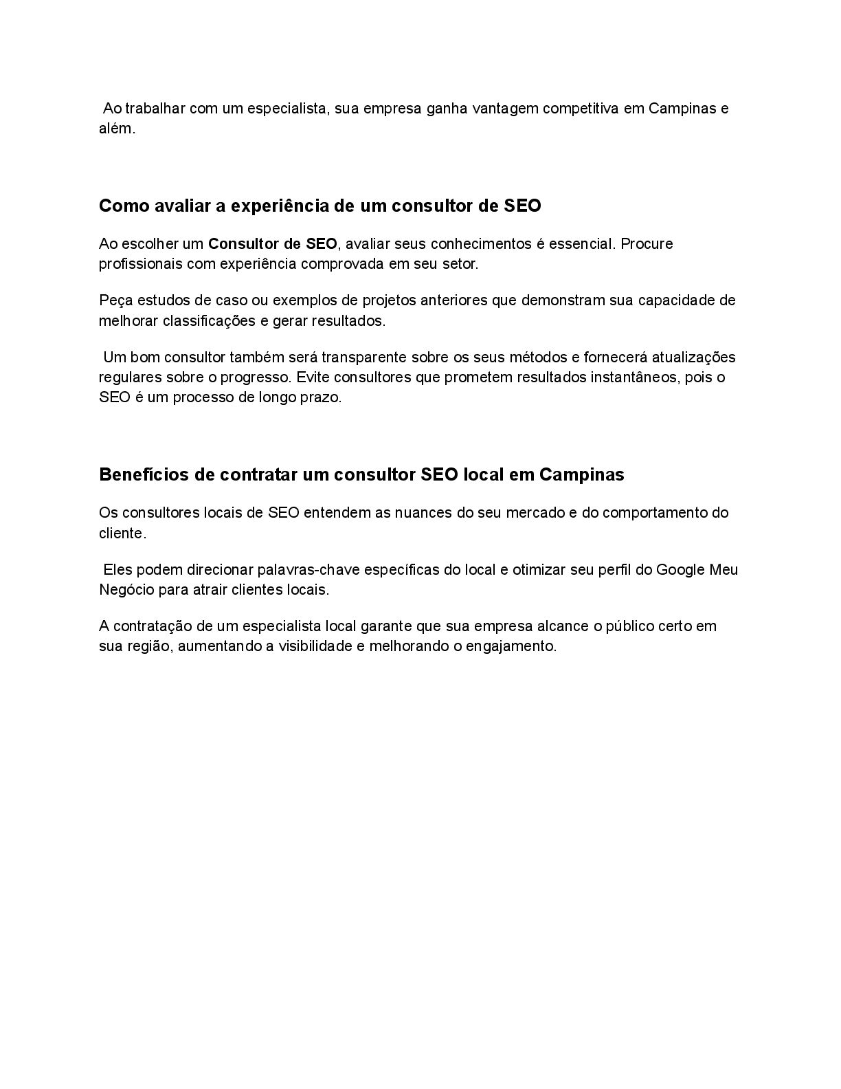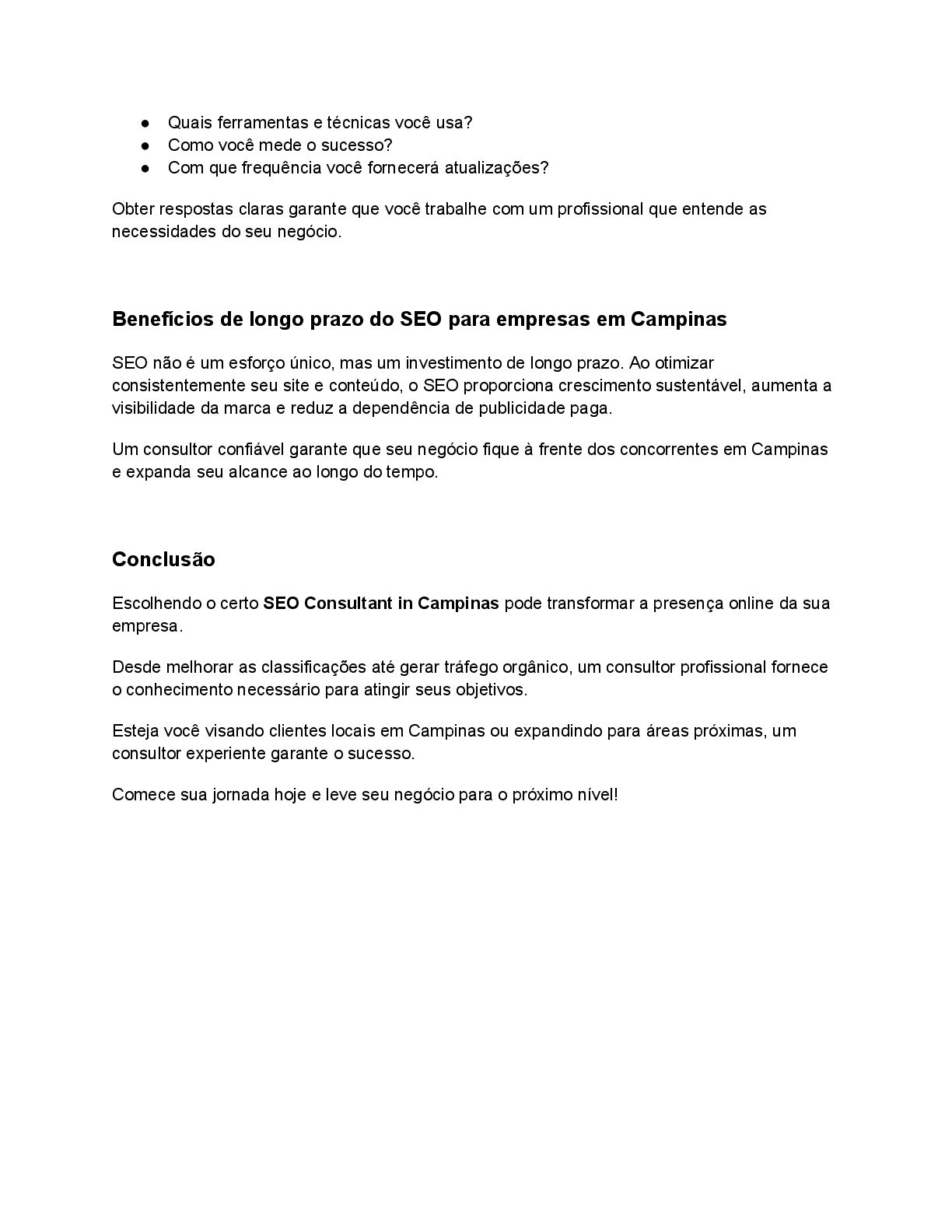 mede o sucesso? • Com que frequência você fornecerá atualizações? Obter respostas claras garante que você trabalhe com um profissional que entende as necessidades do seu negócio. Benefícios de longo prazo do SEO para empresas em Campinas SEO não é um esforço único, mas um investimento de longo prazo. Ao otimizar consistentemente seu site e conteúdo, o SEO proporciona crescimento sustentável, aumenta a visibilidade da marca e reduz a dependência de publicidade paga. Um consultor confiável garante que seu negócio fique à frente dos concorrentes em Campinas e expanda seu alcance ao longo do tempo. Conclusão Escolhendo o certo SEO Consultant in Campinas pode transformar a presença online da sua empresa. Desde melhorar as classificações até gerar tráfego orgânico, um consultor profissional fornece o conhecimento necessário para atingir seus objetivos. Esteja você visando clientes locais em Campinas ou expandindo para áreas próximas, um consultor experiente garante o sucesso. Comece sua jornada hoje e leve seu negócio para o próximo nível!