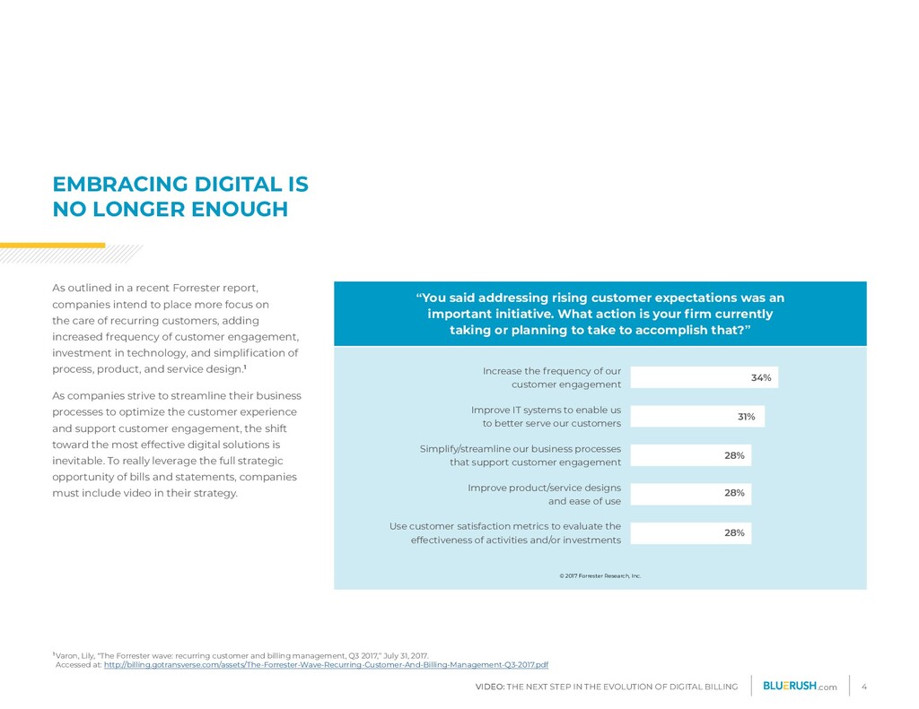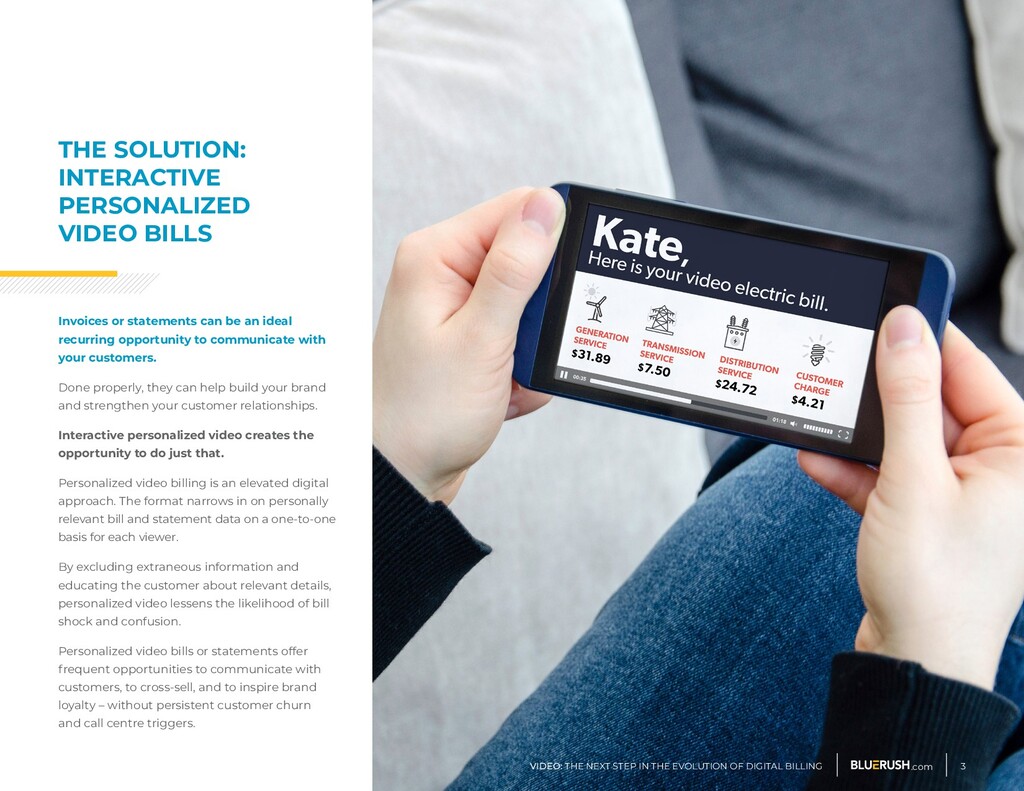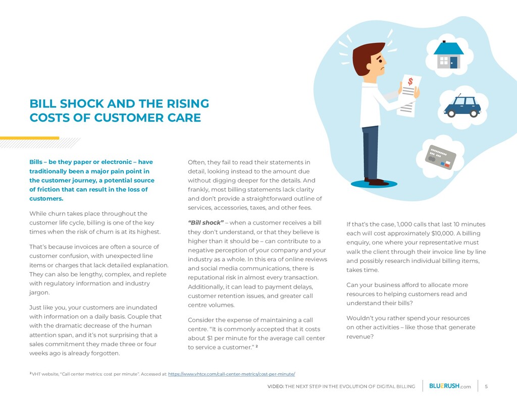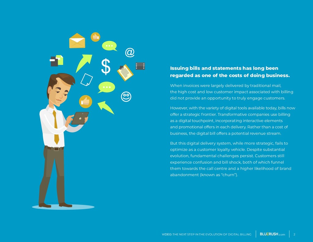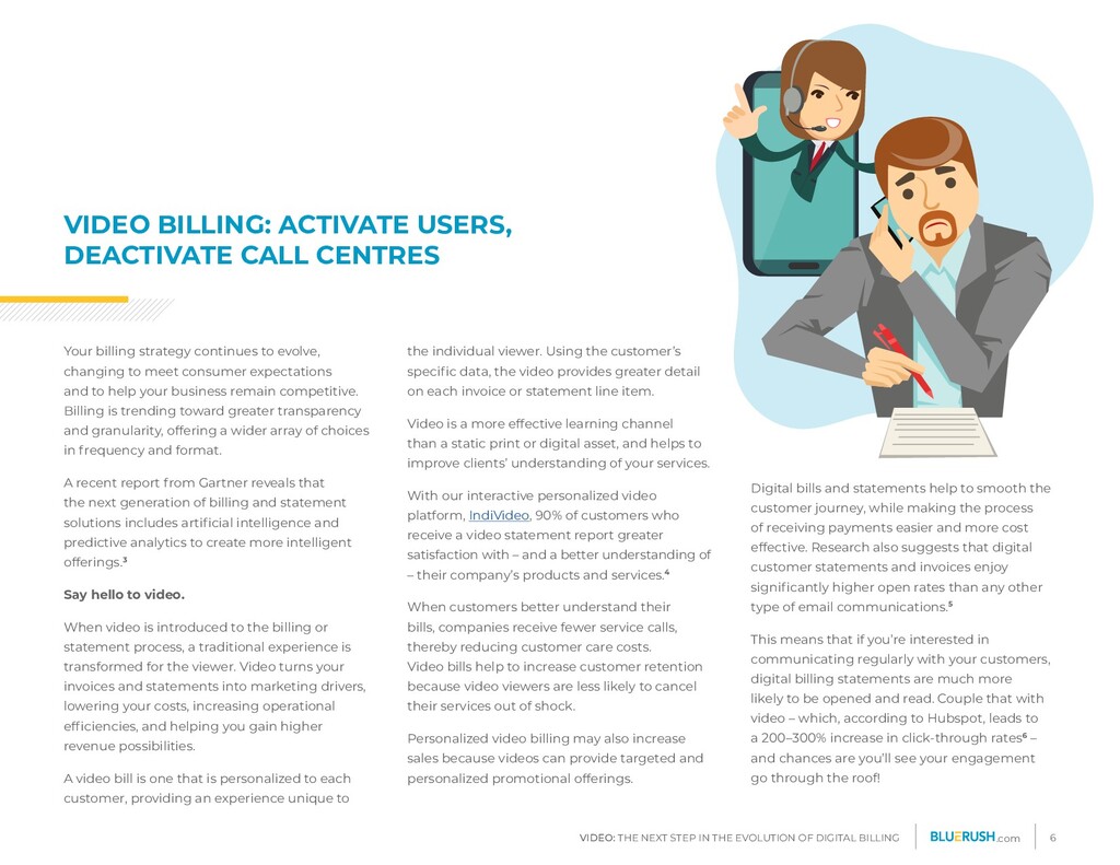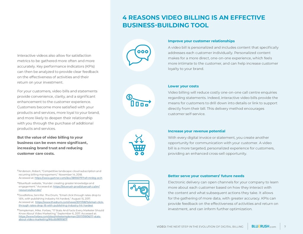 BILLING .com Interactive videos also allow for satisfaction metrics to be gathered more often and more accurately. Key performance indicators (KPIs) can then be analyzed to provide clear feedback on the effectiveness of activities and their return on your investment. For your customers, video bills and statements provide convenience, clarity, and a significant enhancement to the customer experience. Customers become more satisfied with your products and services, more loyal to your brand, and more likely to deepen their relationship with you through the purchase of additional products and services. But the value of video billing to your business can be even more significant, increasing brand trust and reducing customer care costs. 3 Anderson, Robert, “Competitive landscape: cloud subscription and recurring billing management,” November 14, 2018. Accessed at: https://www.gartner.com/doc/3893079?ref=mrktg-srch 4 BlueRush website, “Kunder: creating greater knowledge and engagement.” Accessed at: https://bluerush-prod.bluerush.ca/en/ resources/kunder/ 5 Goodfellow, Jennifer. The Drum, “Email click through rates drop to 1.6%, with publishing industry hit hardest,” August 15, 2017. Accessed at: https://www.thedrum.com/news/2017/08/15/email-click- through-rates-drop-16-with-publishing-industry-hit-hardest 6 Templeman, Mike. Forbes, “17 Stats And Facts Every Marketer Should Know About Video Marketing,” September 6, 2017. Accessed at: https://www.forbes.com/sites/miketempleman/2017/09/06/17-stats- about-video-marketing/#6cdb9819567f 4 REASONS VIDEO BILLING IS AN EFFECTIVE BUSINESS-BUILDING TOOL Increase your revenue potential With every digital invoice or statement, you create another opportunity for communication with your customer. A video bill is a more targeted, personalized experience for customers, providing an enhanced cross-sell opportunity. Lower your costs Video billing will reduce costly one-on-one call centre enquiries regarding statements. Indeed, interactive video bills provide the means for customers to drill down into details or link to support directly from their bill. This delivery method encourages customer self-service. Better serve your customers’ future needs Electronic delivery can open channels for your company to learn more about each customer based on how they interact with the content and what subsequent actions they take. It allows for the gathering of more data, with greater accuracy. KPIs can provide feedback on the effectiveness of activities and return on investment, and can inform further optimization. Improve your customer relationships A video bill is personalized and includes content that specifically addresses each customer individually. Personalized content makes for a more direct, one-on-one experience, which feels more intimate to the customer, and can help increase customer loyalty to your brand.