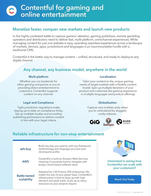 contentful.com Monetize faster, conquer new markets and launch new products Any channel, any business model, anywhere in the world Multi-platform In the highly contested battle to capture gamers’ attention, gaming publishers, remote gambling operators and distributors need to deliver fast, multi-platform, omnichannel experiences. While managing content for just one website is easy, operating seamless experiences across a landscape of markets, devices, apps, jurisdictions and languages is an insurmountable hurdle with a traditional CMS. Contentful is the better way to manage content — unified, structured, and ready to deploy to any digital channel. Whether you run backends for other gaming companies or you’re providing direct entertainment to customers, Contentful supports content on any channel. Globalization Localization Legal and Compliance Capture new markets early when you’re unhindered by sluggish, costly releases. Tailor your content to the unique gaming needs of target markets with a flexible content model. Spin up multiple iterations of your product and customize the gaming experience in multiple languages and product offerings Tight jurisdiction regulations make staying up to date on compliance tricky. Set up multiple locales and according publishing permissions to deliver content in line with your legal criteria. Reach Out Today Reliable infrastructure for non-stop entertainment Build any way you want to, with any framework, methodology and language you (and your developers) prefer. Interested in seeing how Contentful can scale with your customers? Contentful is built on Amazon Web Services, meaning it’s purpose-built to integrate with today’s cloud-based software stack. Adopted by +30 Fortune 250 enterprises: No matter the size of your player base, Contentful’s infrastructure is built to keep up with high demand and peak loads. Scale up as many resources as your projects require. API-first AWS Battle-tested scalability