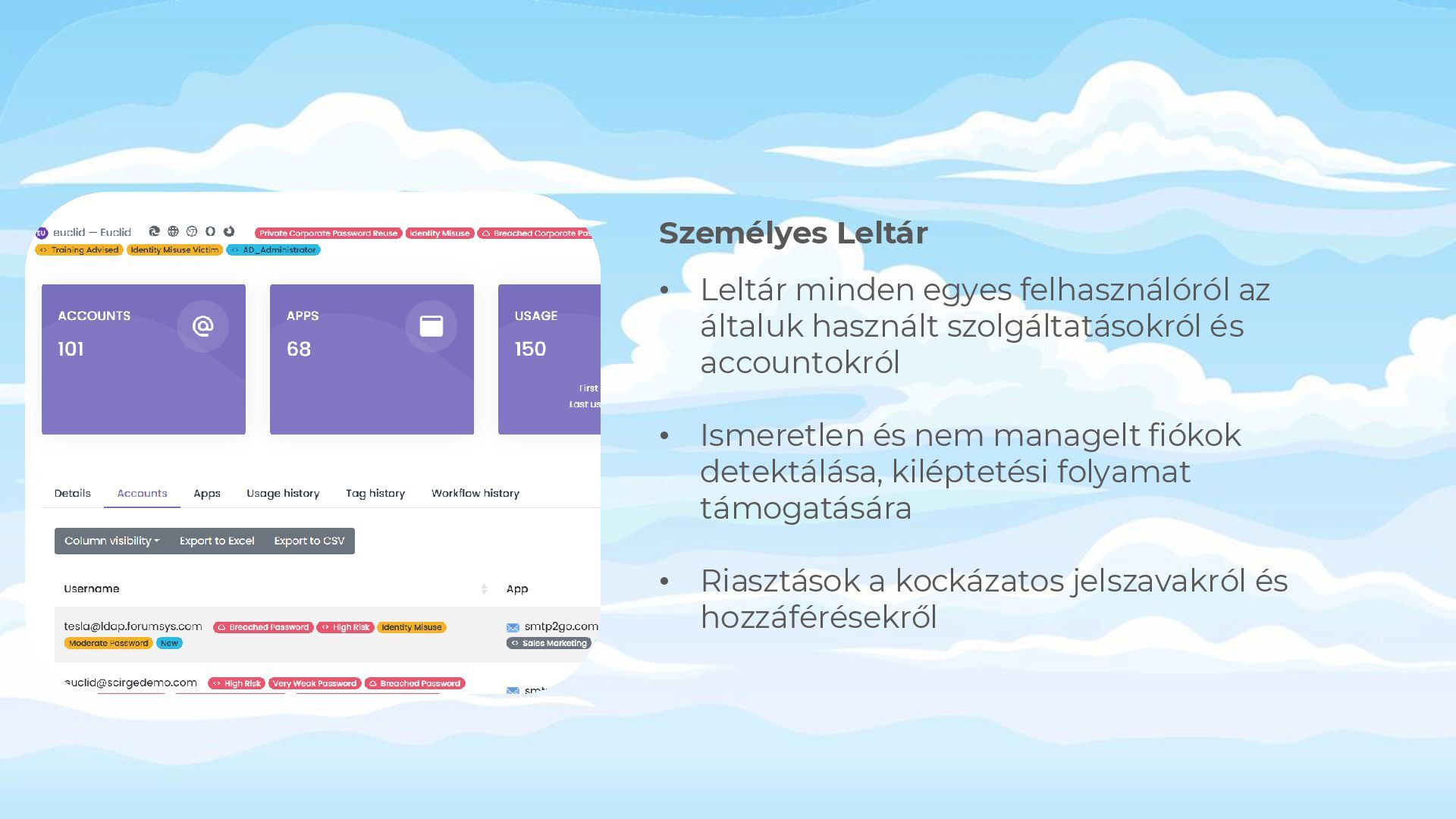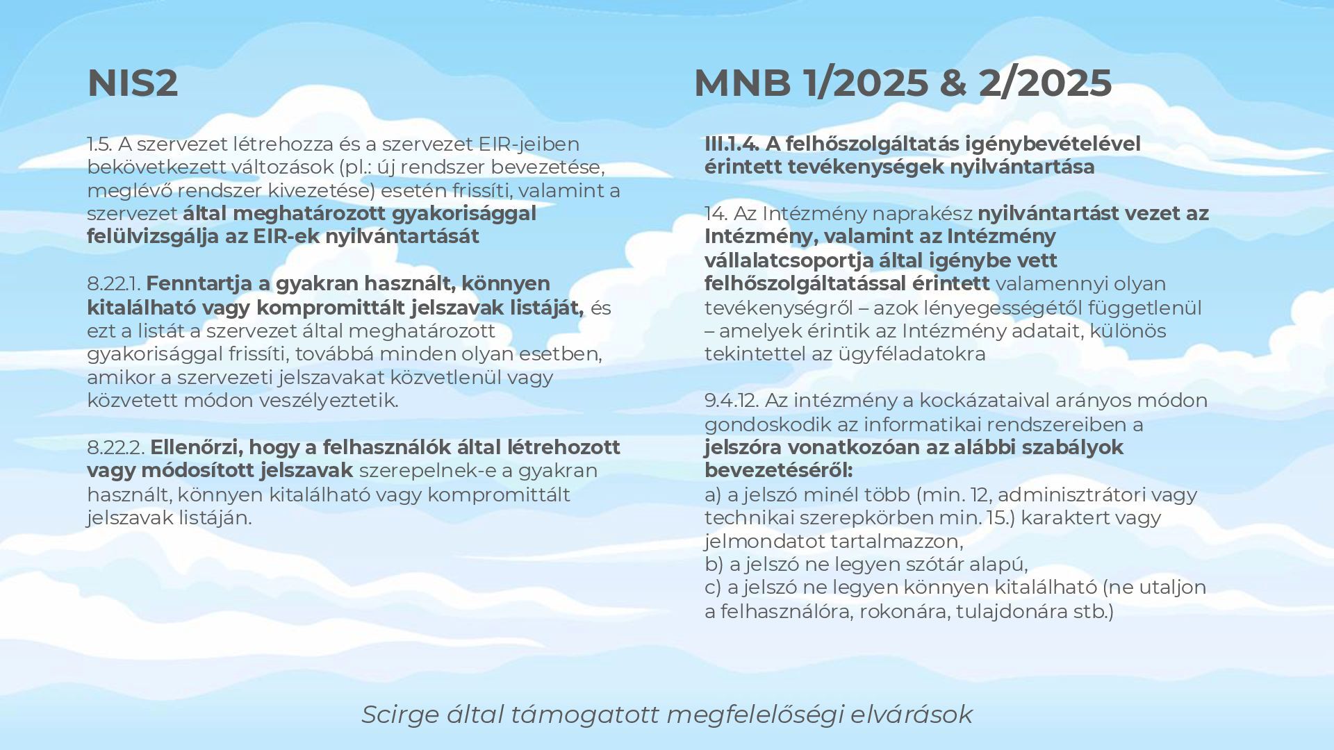 (pl.: új rendszer bevezetése, meglévő rendszer kivezetése) esetén frissíti, valamint a szervezet által meghatározott gyakorisággal felülvizsgálja az EIR-ek nyilvántartását 8.22.1. Fenntartja a gyakran használt, könnyen kitalálható vagy kompromittált jelszavak listáját, és ezt a listát a szervezet által meghatározott gyakorisággal frissíti, továbbá minden olyan esetben, amikor a szervezeti jelszavakat közvetlenül vagy közvetett módon veszélyeztetik. 8.22.2. Ellenőrzi, hogy a felhasználók által létrehozott vagy módosított jelszavak szerepelnek-e a gyakran használt, könnyen kitalálható vagy kompromittált jelszavak listáján. III.1.4. A felhőszolgáltatás igénybevételével érintett tevékenységek nyilvántartása 14. Az Intézmény naprakész nyilvántartást vezet az Intézmény, valamint az Intézmény vállalatcsoportja által igénybe vett felhőszolgáltatással érintett valamennyi olyan tevékenységről – azok lényegességétől függetlenül – amelyek érintik az Intézmény adatait, különös tekintettel az ügyféladatokra 9.4.12. Az intézmény a kockázataival arányos módon gondoskodik az informatikai rendszereiben a jelszóra vonatkozóan az alábbi szabályok bevezetéséről: a) a jelszó minél több (min. 12, adminisztrátori vagy technikai szerepkörben min. 15.) karaktert vagy jelmondatot tartalmazzon, b) a jelszó ne legyen szótár alapú, c) a jelszó ne legyen könnyen kitalálható (ne utaljon a felhasználóra, rokonára, tulajdonára stb.) NIS2 MNB 1/2025 & 2/2025 Scirge által támogatott megfelelőségi elvárások
