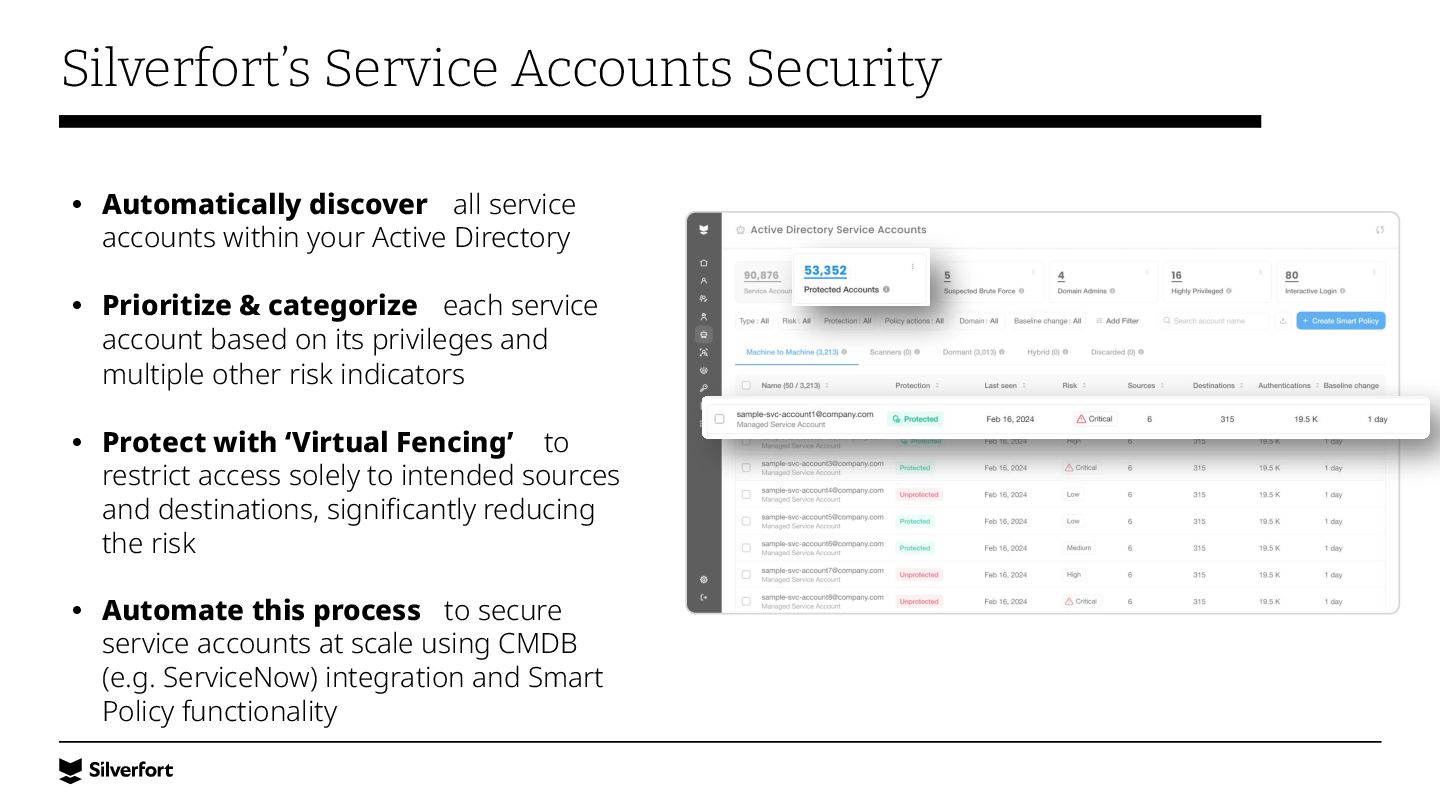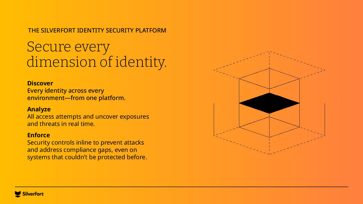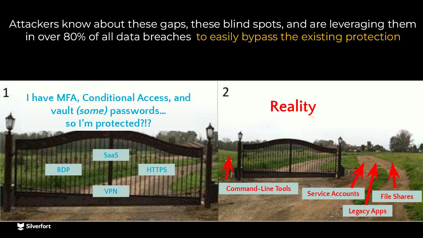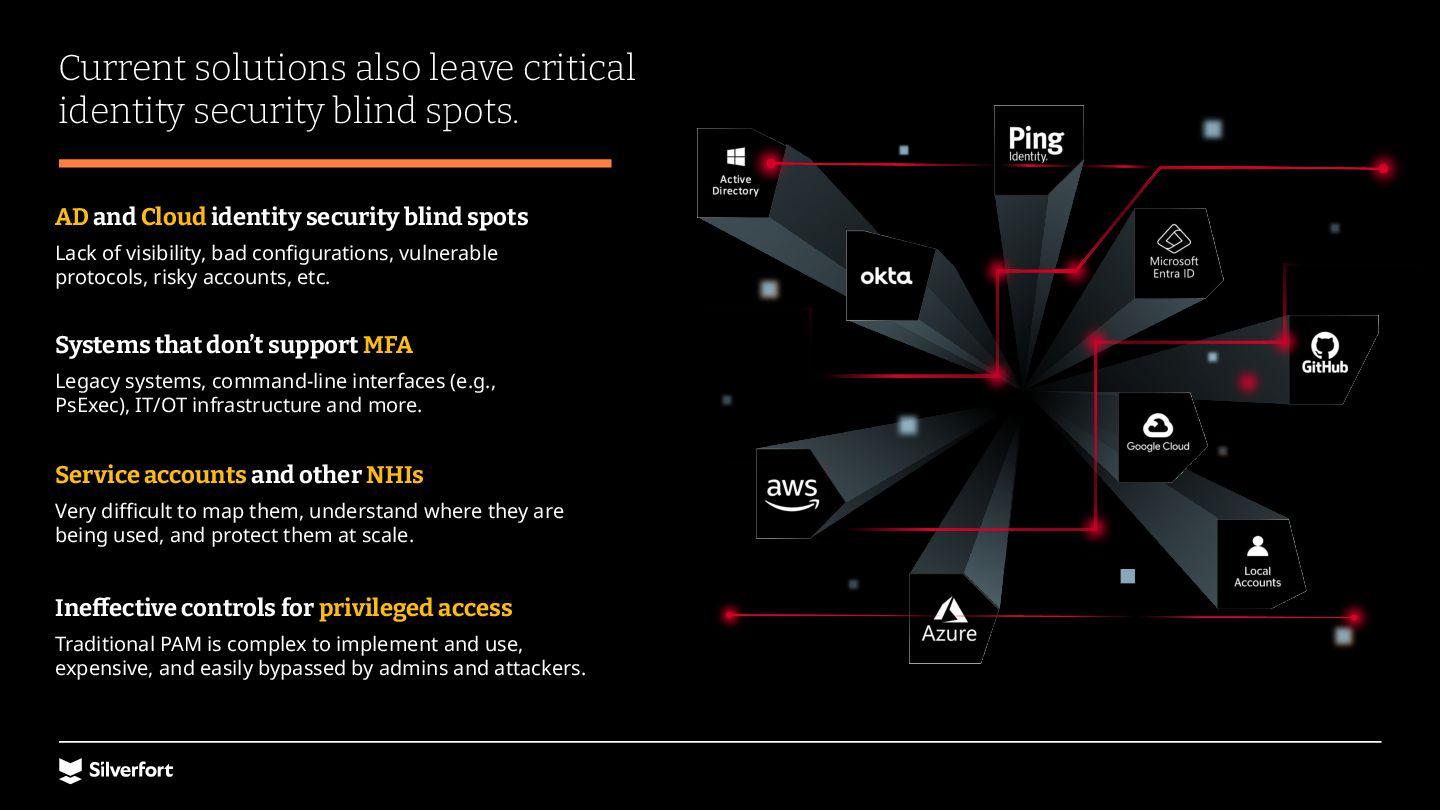 Lack of visibility, bad configurations, vulnerable protocols, risky accounts, etc. Systems that don’t support MFA Legacy systems, command-line interfaces (e.g., PsExec), IT/OT infrastructure and more. Service accounts and other NHIs Very difficult to map them, understand where they are being used, and protect them at scale. Ineffective controls for privileged access Traditional PAM is complex to implement and use, expensive, and easily bypassed by admins and attackers.