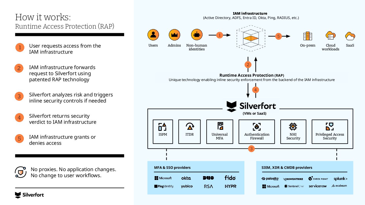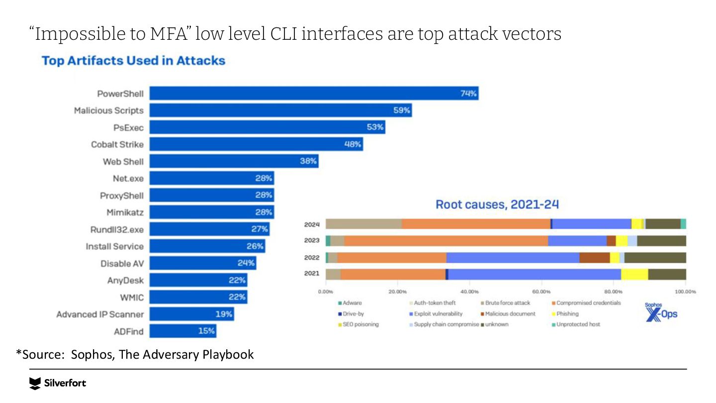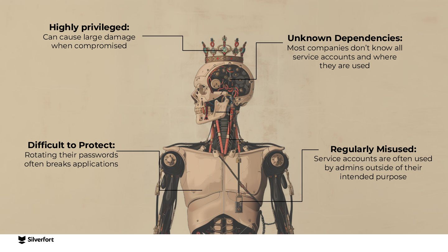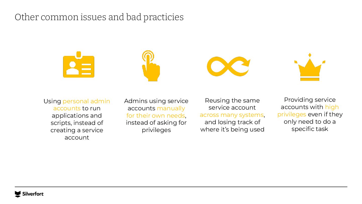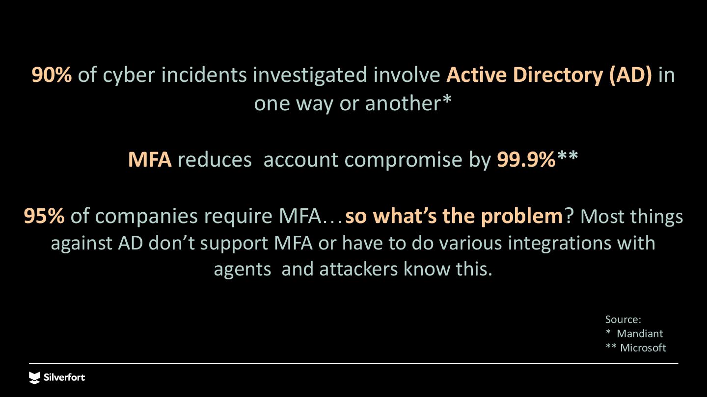 Lack of visibility, bad configurations, vulnerable protocols, risky accounts, etc. Systems that don’t support MFA Legacy systems, command-line interfaces (e.g., PsExec), IT/OT infrastructure and more. Service accounts and other NHIs Very difficult to map them, understand where they are being used, and protect them at scale. Ineffective controls for privileged access Traditional PAM is complex to implement and use, expensive, and easily bypassed by admins and attackers.