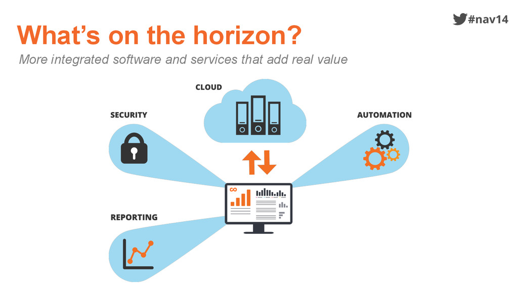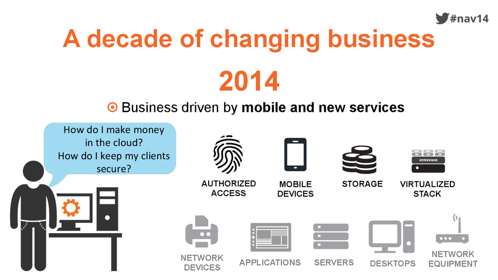 EQUIPMENT 2014 How  do  I  make  money     in  the  cloud?     How  do  I  keep  my  clients   secure?   A decade of changing business APPLICATIONS NETWORK DEVICES AUTHORIZED ACCESS STORAGE HYPERVISOR VIRTUALIZED STACK MOBILE DEVICES