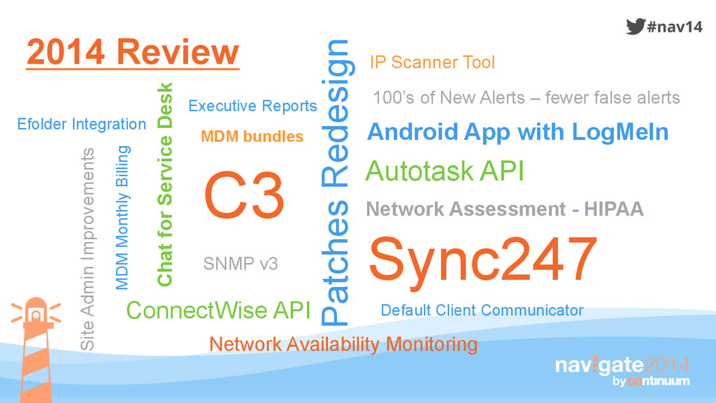 - HIPAA IP Scanner Tool Network Availability Monitoring Default Client Communicator Chat for Service Desk MDM Monthly Billing MDM bundles Site Admin Improvements Efolder Integration Android App with LogMeIn SNMP v3 100’s of New Alerts – fewer false alerts C3 Sync247 2014 Review