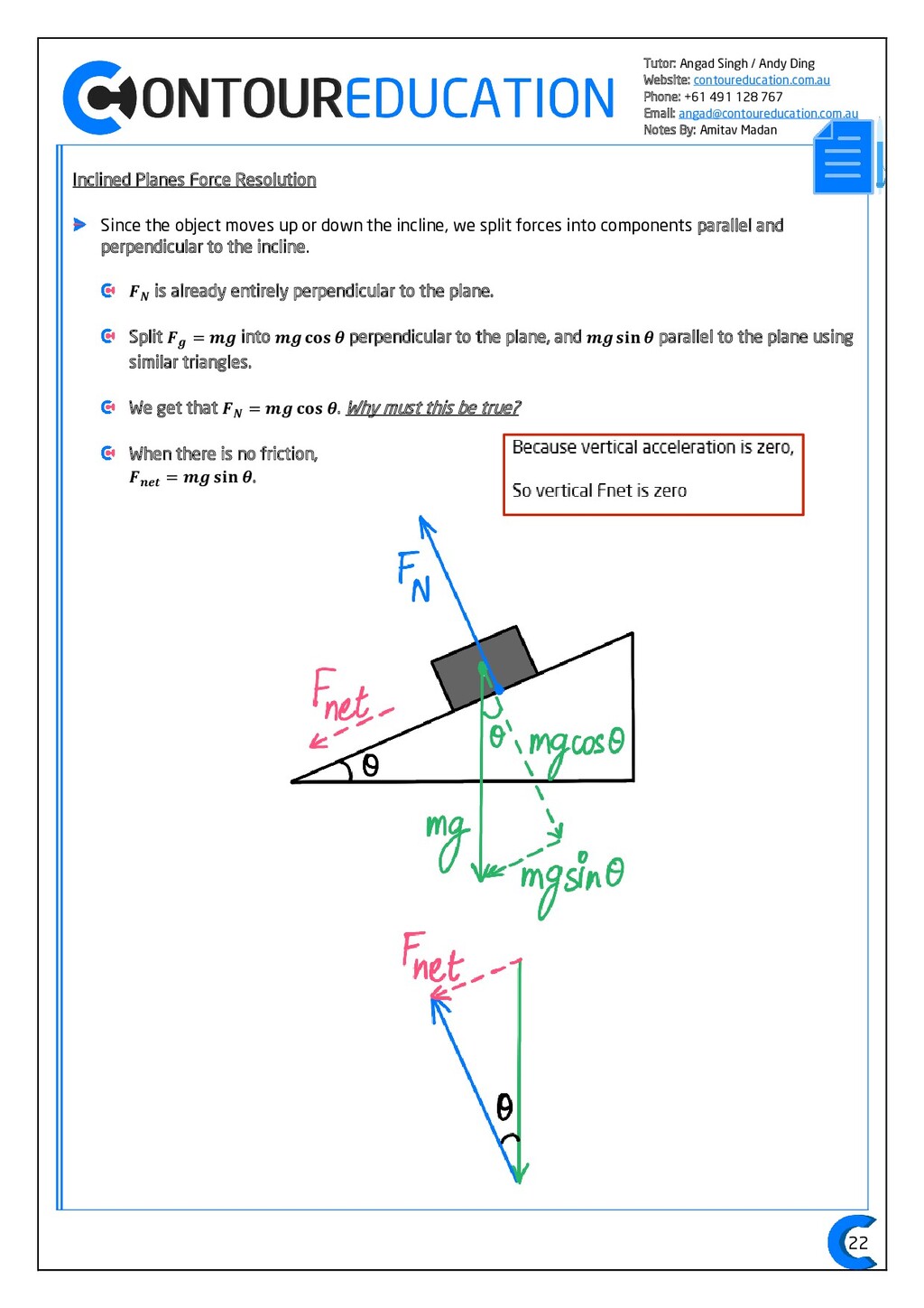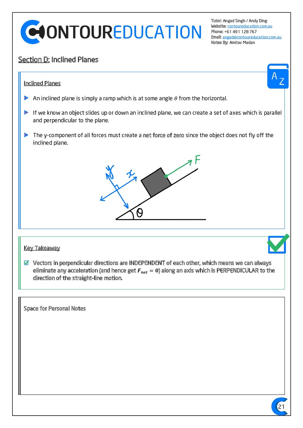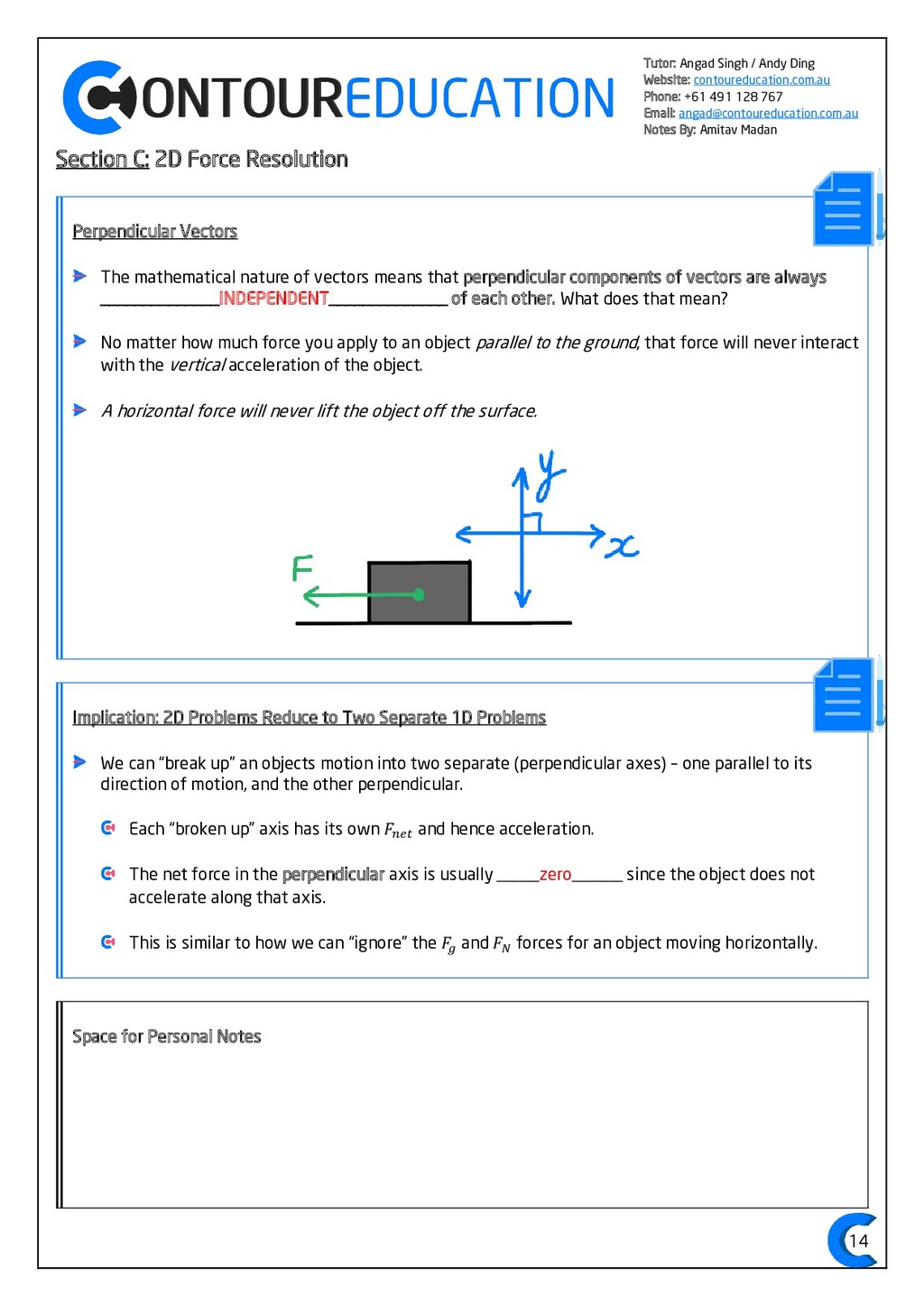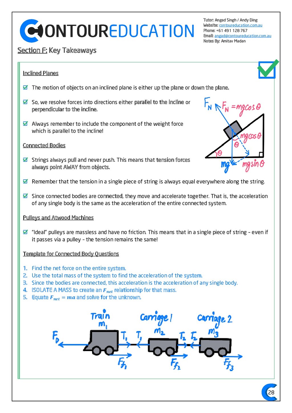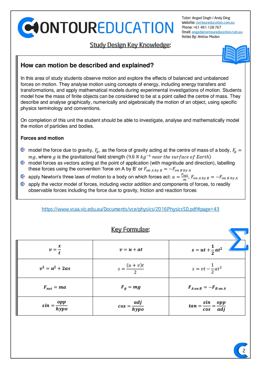 [email protected] Notes By: Amitav Madan 2 Study Design Key Knowledge: How can motion be described and explained? In this area of study students observe motion and explore the effects of balanced and unbalanced forces on motion. They analyse motion using concepts of energy, including energy transfers and transformations, and apply mathematical models during experimental investigations of motion. Students model how the mass of finite objects can be considered to be at a point called the centre of mass. They describe and analyse graphically, numerically and algebraically the motion of an object, using specific physics terminology and conventions. On completion of this unit the student should be able to investigate, analyse and mathematically model the motion of particles and bodies. Forces and motion model the force due to gravity, 𝐹 𝑔, as the force of gravity acting at the centre of mass of a body, 𝐹 𝑔 = 𝑚𝑔, where 𝑔 is the gravitational field strength (9.8 𝑁 𝑘𝑔−1 𝑛𝑒𝑎𝑟 𝑡ℎ𝑒 𝑠𝑢𝑟𝑓𝑎𝑐𝑒 𝑜𝑓 𝐸𝑎𝑟𝑡ℎ) model forces as vectors acting at the point of application (with magnitude and direction), labelling these forces using the convention ‘force on A by B’ or 𝐹𝑜𝑛 𝐴 𝑏𝑦 𝐵 = −𝐹𝑜𝑛 𝐵 𝑏𝑦 𝐴 apply Newton’s three laws of motion to a body on which forces act: 𝑎 = 𝐹𝑛𝑒𝑡 𝑚 , 𝐹𝑜𝑛 𝐴 𝑏𝑦 𝐵 = −𝐹𝑜𝑛 𝐵 𝑏𝑦 𝐴 apply the vector model of forces, including vector addition and components of forces, to readily observable forces including the force due to gravity, friction and reaction forces https://www.vcaa.vic.edu.au/Documents/vce/physics/2016PhysicsSD.pdf#page=43 Key Formulae: 𝒗 = 𝒙 𝒕 𝒗 = 𝒖 + 𝒂𝒕 𝒔 = 𝒖𝒕 + 𝟏 𝟐 𝒂𝒕𝟐 𝒗𝟐 = 𝒖𝟐 + 𝟐𝒂𝒔 𝑠 = (𝑢 + 𝑣)𝑡 2 𝑠 = 𝑣𝑡 − 1 2 𝑎𝑡2 𝑭𝒏𝒆𝒕 = 𝒎𝒂 𝑭𝒈 = 𝒎𝒈 𝑭𝑨 𝒐𝒏 𝑩 = −𝑭𝑩 𝒐𝒏 𝑨 𝒔𝒊𝒏 = 𝒐𝒑𝒑 𝒉𝒚𝒑𝒐 𝒄𝒐𝒔 = 𝒂𝒅𝒋 𝒉𝒚𝒑𝒐 𝒕𝒂𝒏 = 𝒔𝒊𝒏 𝒄𝒐𝒔 = 𝒐𝒑𝒑 𝒂𝒅𝒋
