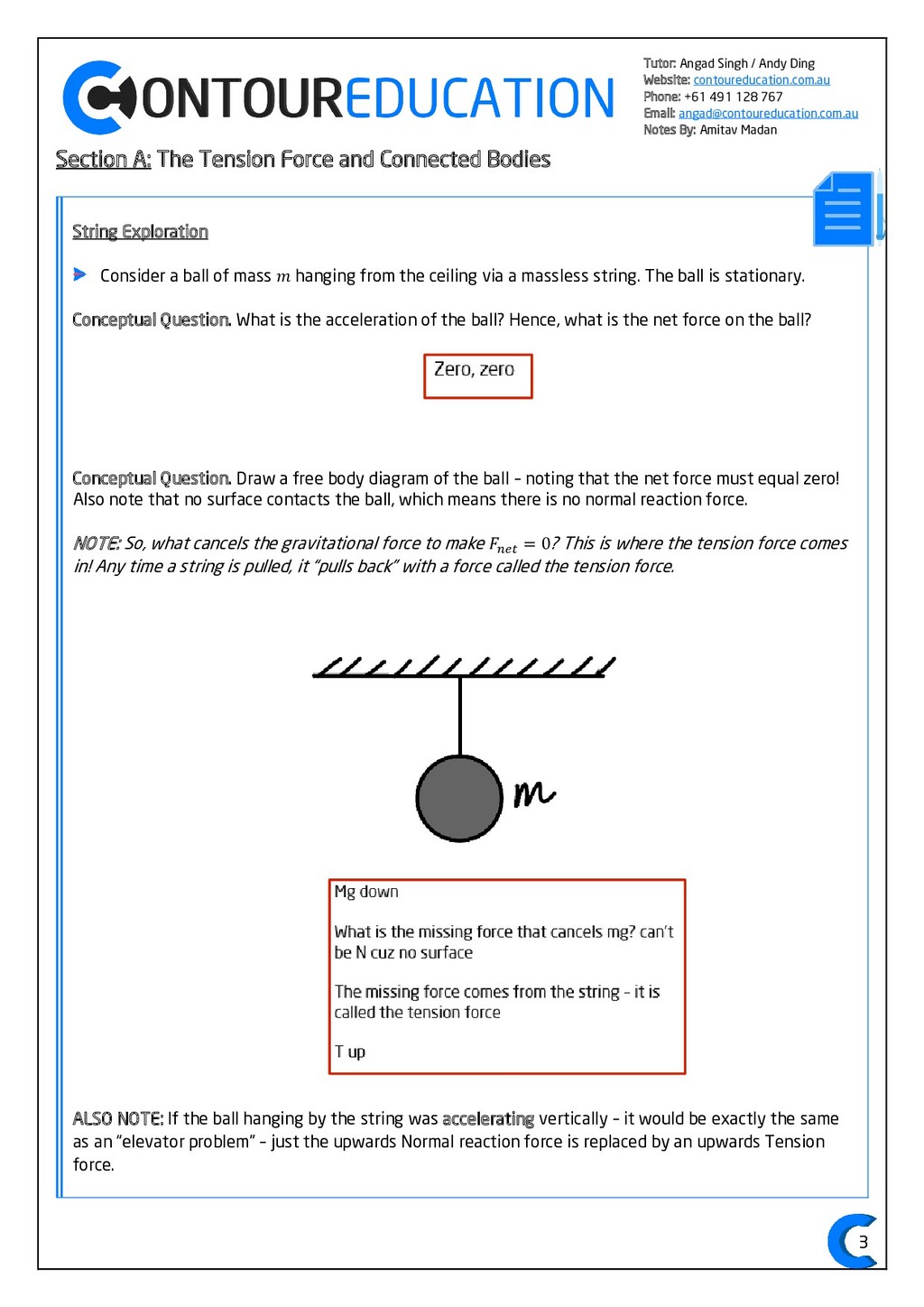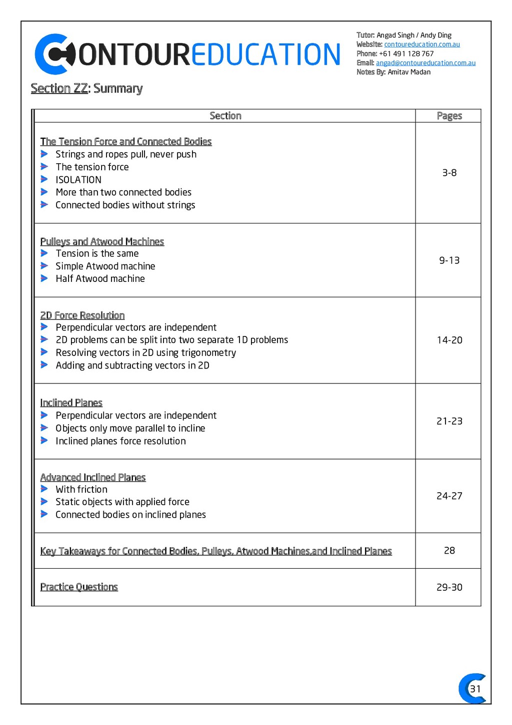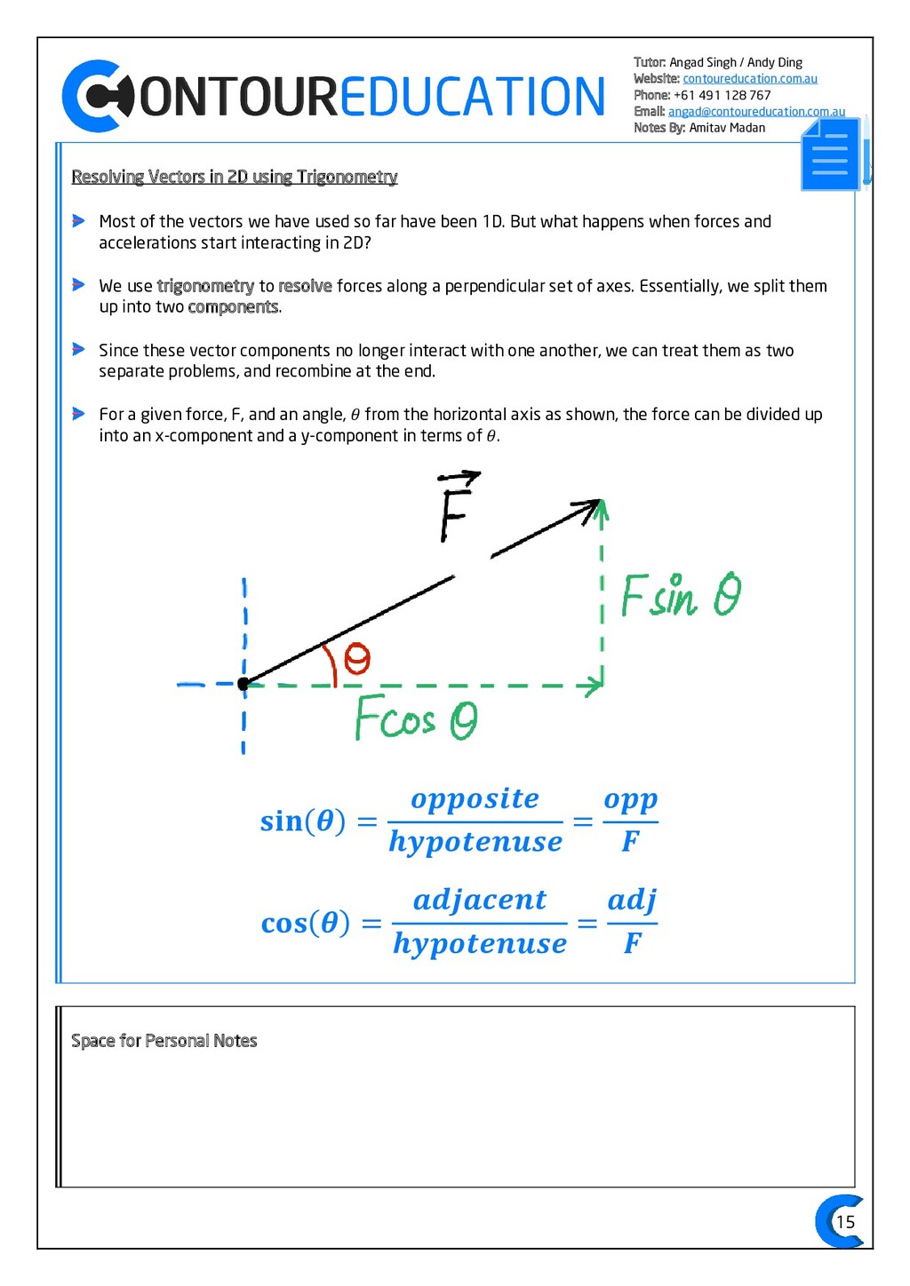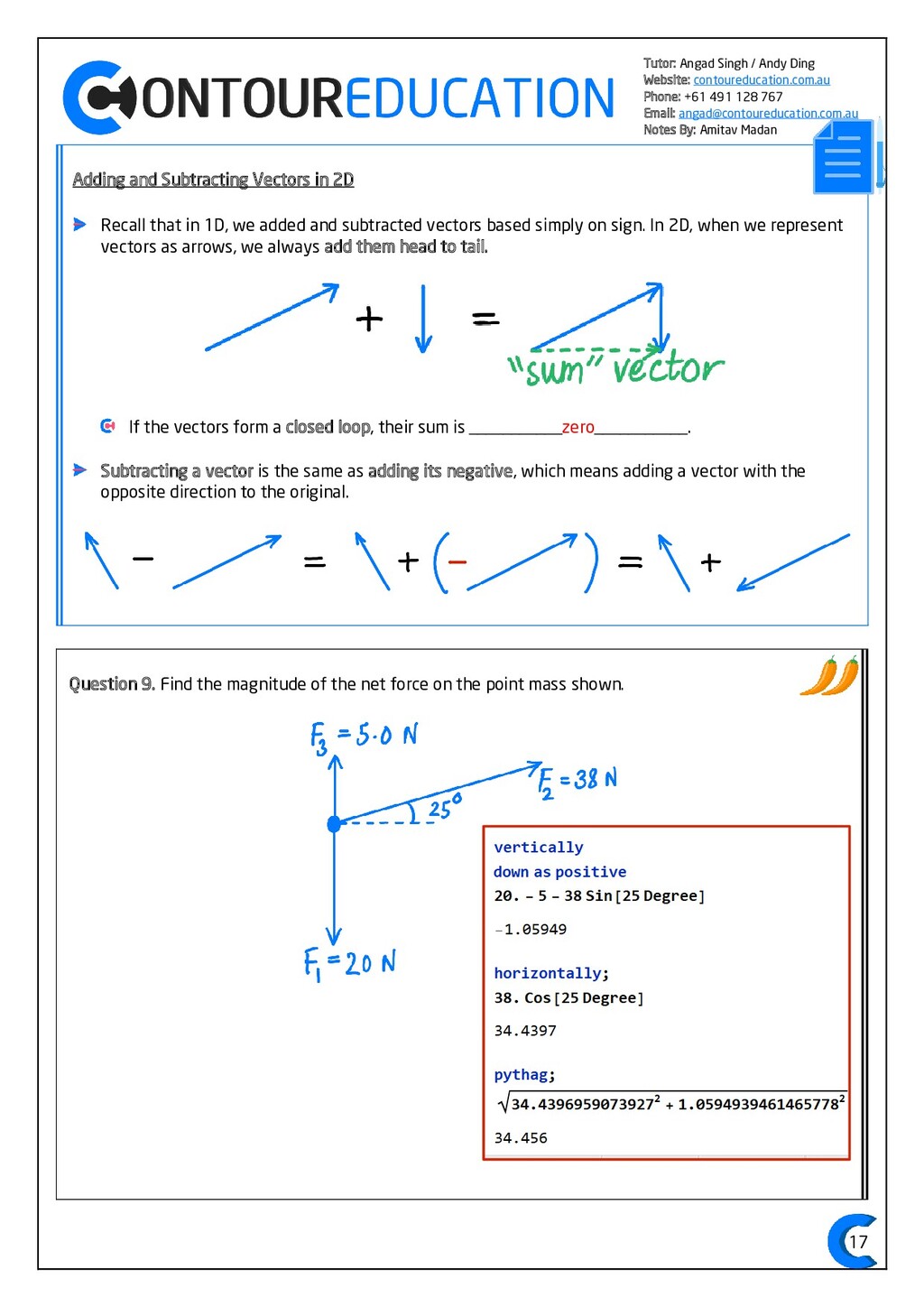 [email protected] Notes By: Amitav Madan 2 Study Design Key Knowledge: How can motion be described and explained? In this area of study students observe motion and explore the effects of balanced and unbalanced forces on motion. They analyse motion using concepts of energy, including energy transfers and transformations, and apply mathematical models during experimental investigations of motion. Students model how the mass of finite objects can be considered to be at a point called the centre of mass. They describe and analyse graphically, numerically and algebraically the motion of an object, using specific physics terminology and conventions. On completion of this unit the student should be able to investigate, analyse and mathematically model the motion of particles and bodies. Forces and motion model the force due to gravity, 𝐹 𝑔, as the force of gravity acting at the centre of mass of a body, 𝐹 𝑔 = 𝑚𝑔, where 𝑔 is the gravitational field strength (9.8 𝑁 𝑘𝑔−1 𝑛𝑒𝑎𝑟 𝑡ℎ𝑒 𝑠𝑢𝑟𝑓𝑎𝑐𝑒 𝑜𝑓 𝐸𝑎𝑟𝑡ℎ) model forces as vectors acting at the point of application (with magnitude and direction), labelling these forces using the convention ‘force on A by B’ or 𝐹𝑜𝑛 𝐴 𝑏𝑦 𝐵 = −𝐹𝑜𝑛 𝐵 𝑏𝑦 𝐴 apply Newton’s three laws of motion to a body on which forces act: 𝑎 = 𝐹𝑛𝑒𝑡 𝑚 , 𝐹𝑜𝑛 𝐴 𝑏𝑦 𝐵 = −𝐹𝑜𝑛 𝐵 𝑏𝑦 𝐴 apply the vector model of forces, including vector addition and components of forces, to readily observable forces including the force due to gravity, friction and reaction forces https://www.vcaa.vic.edu.au/Documents/vce/physics/2016PhysicsSD.pdf#page=43 Key Formulae: 𝒗 = 𝒙 𝒕 𝒗 = 𝒖 + 𝒂𝒕 𝒔 = 𝒖𝒕 + 𝟏 𝟐 𝒂𝒕𝟐 𝒗𝟐 = 𝒖𝟐 + 𝟐𝒂𝒔 𝑠 = (𝑢 + 𝑣)𝑡 2 𝑠 = 𝑣𝑡 − 1 2 𝑎𝑡2 𝑭𝒏𝒆𝒕 = 𝒎𝒂 𝑭𝒈 = 𝒎𝒈 𝑭𝑨 𝒐𝒏 𝑩 = −𝑭𝑩 𝒐𝒏 𝑨 𝒔𝒊𝒏 = 𝒐𝒑𝒑 𝒉𝒚𝒑𝒐 𝒄𝒐𝒔 = 𝒂𝒅𝒋 𝒉𝒚𝒑𝒐 𝒕𝒂𝒏 = 𝒔𝒊𝒏 𝒄𝒐𝒔 = 𝒐𝒑𝒑 𝒂𝒅𝒋