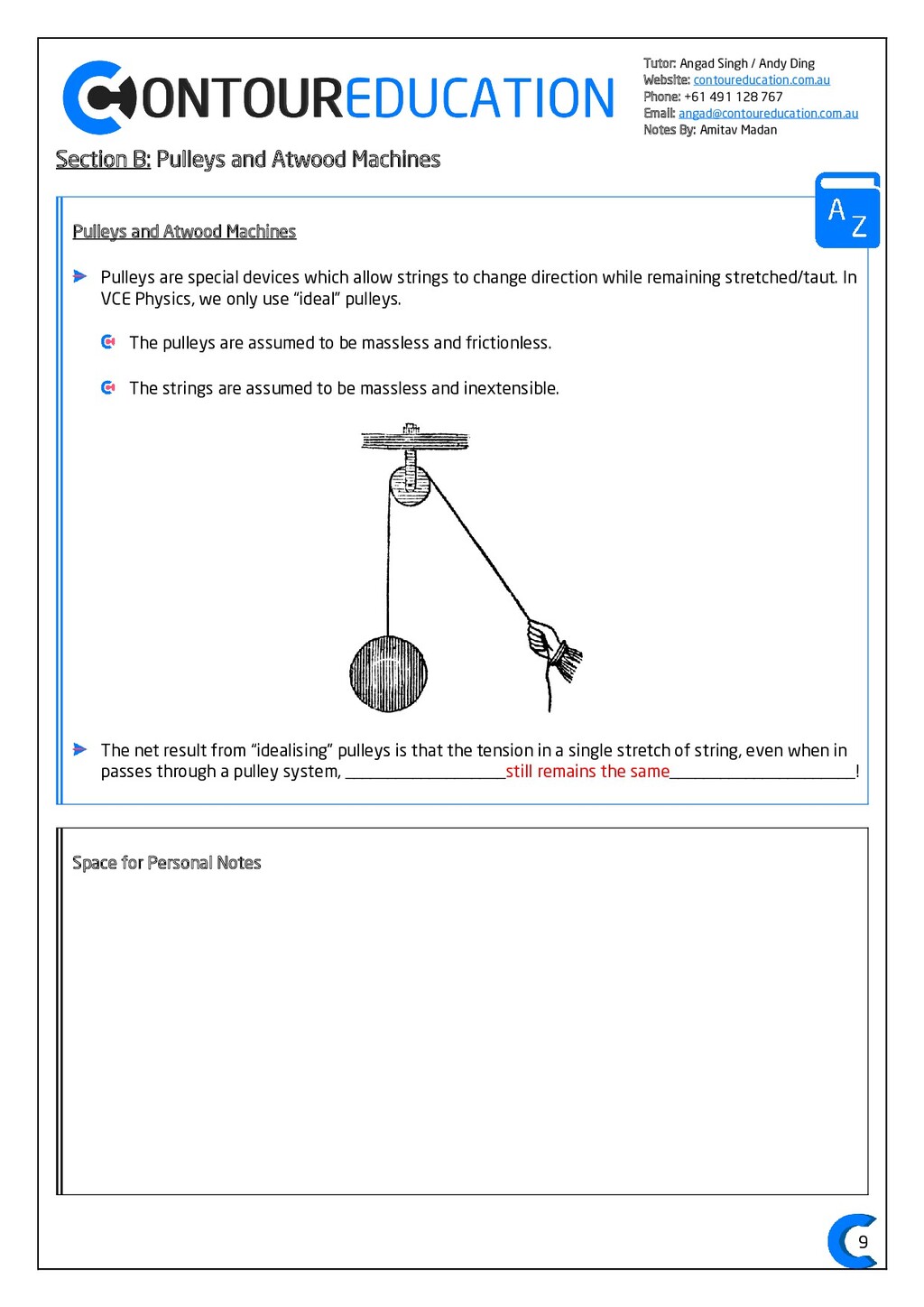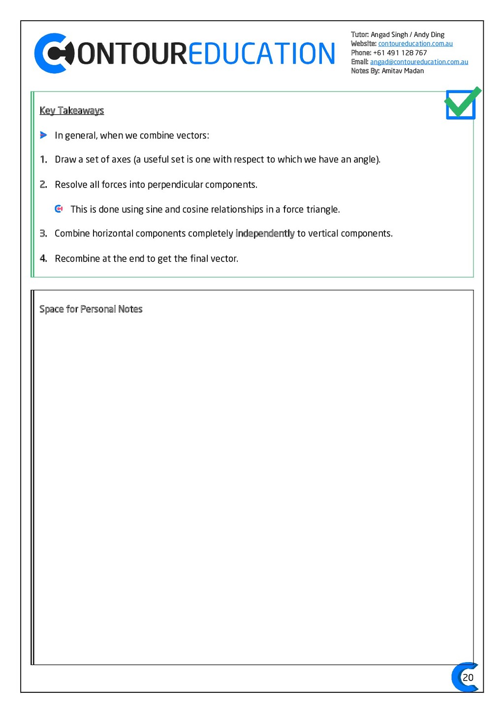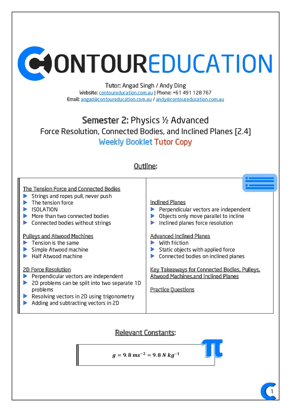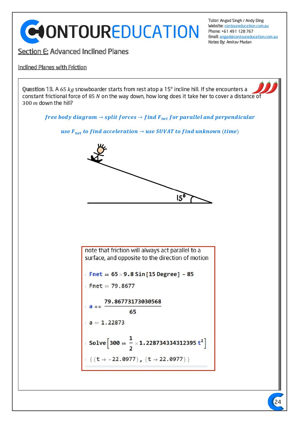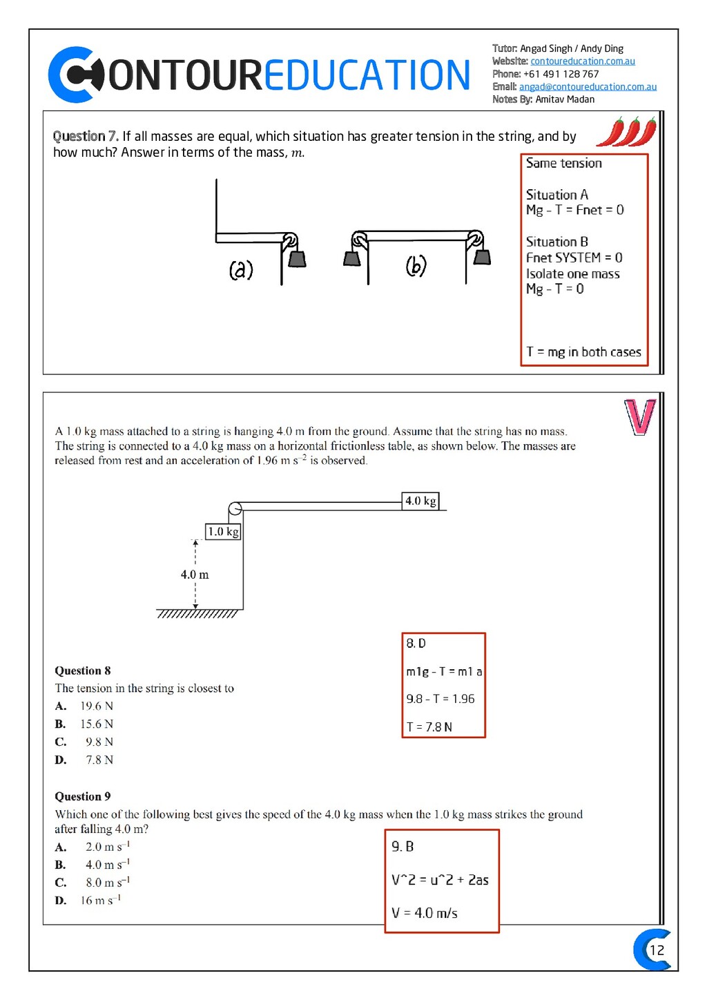 [email protected] Notes By: Amitav Madan 2 Study Design Key Knowledge: How can motion be described and explained? In this area of study students observe motion and explore the effects of balanced and unbalanced forces on motion. They analyse motion using concepts of energy, including energy transfers and transformations, and apply mathematical models during experimental investigations of motion. Students model how the mass of finite objects can be considered to be at a point called the centre of mass. They describe and analyse graphically, numerically and algebraically the motion of an object, using specific physics terminology and conventions. On completion of this unit the student should be able to investigate, analyse and mathematically model the motion of particles and bodies. Forces and motion model the force due to gravity, 𝐹 𝑔, as the force of gravity acting at the centre of mass of a body, 𝐹 𝑔 = 𝑚𝑔, where 𝑔 is the gravitational field strength (9.8 𝑁 𝑘𝑔−1 𝑛𝑒𝑎𝑟 𝑡ℎ𝑒 𝑠𝑢𝑟𝑓𝑎𝑐𝑒 𝑜𝑓 𝐸𝑎𝑟𝑡ℎ) model forces as vectors acting at the point of application (with magnitude and direction), labelling these forces using the convention ‘force on A by B’ or 𝐹𝑜𝑛 𝐴 𝑏𝑦 𝐵 = −𝐹𝑜𝑛 𝐵 𝑏𝑦 𝐴 apply Newton’s three laws of motion to a body on which forces act: 𝑎 = 𝐹𝑛𝑒𝑡 𝑚 , 𝐹𝑜𝑛 𝐴 𝑏𝑦 𝐵 = −𝐹𝑜𝑛 𝐵 𝑏𝑦 𝐴 apply the vector model of forces, including vector addition and components of forces, to readily observable forces including the force due to gravity, friction and reaction forces https://www.vcaa.vic.edu.au/Documents/vce/physics/2016PhysicsSD.pdf#page=43 Key Formulae: 𝒗 = 𝒙 𝒕 𝒗 = 𝒖 + 𝒂𝒕 𝒔 = 𝒖𝒕 + 𝟏 𝟐 𝒂𝒕𝟐 𝒗𝟐 = 𝒖𝟐 + 𝟐𝒂𝒔 𝑠 = (𝑢 + 𝑣)𝑡 2 𝑠 = 𝑣𝑡 − 1 2 𝑎𝑡2 𝑭𝒏𝒆𝒕 = 𝒎𝒂 𝑭𝒈 = 𝒎𝒈 𝑭𝑨 𝒐𝒏 𝑩 = −𝑭𝑩 𝒐𝒏 𝑨 𝒔𝒊𝒏 = 𝒐𝒑𝒑 𝒉𝒚𝒑𝒐 𝒄𝒐𝒔 = 𝒂𝒅𝒋 𝒉𝒚𝒑𝒐 𝒕𝒂𝒏 = 𝒔𝒊𝒏 𝒄𝒐𝒔 = 𝒐𝒑𝒑 𝒂𝒅𝒋