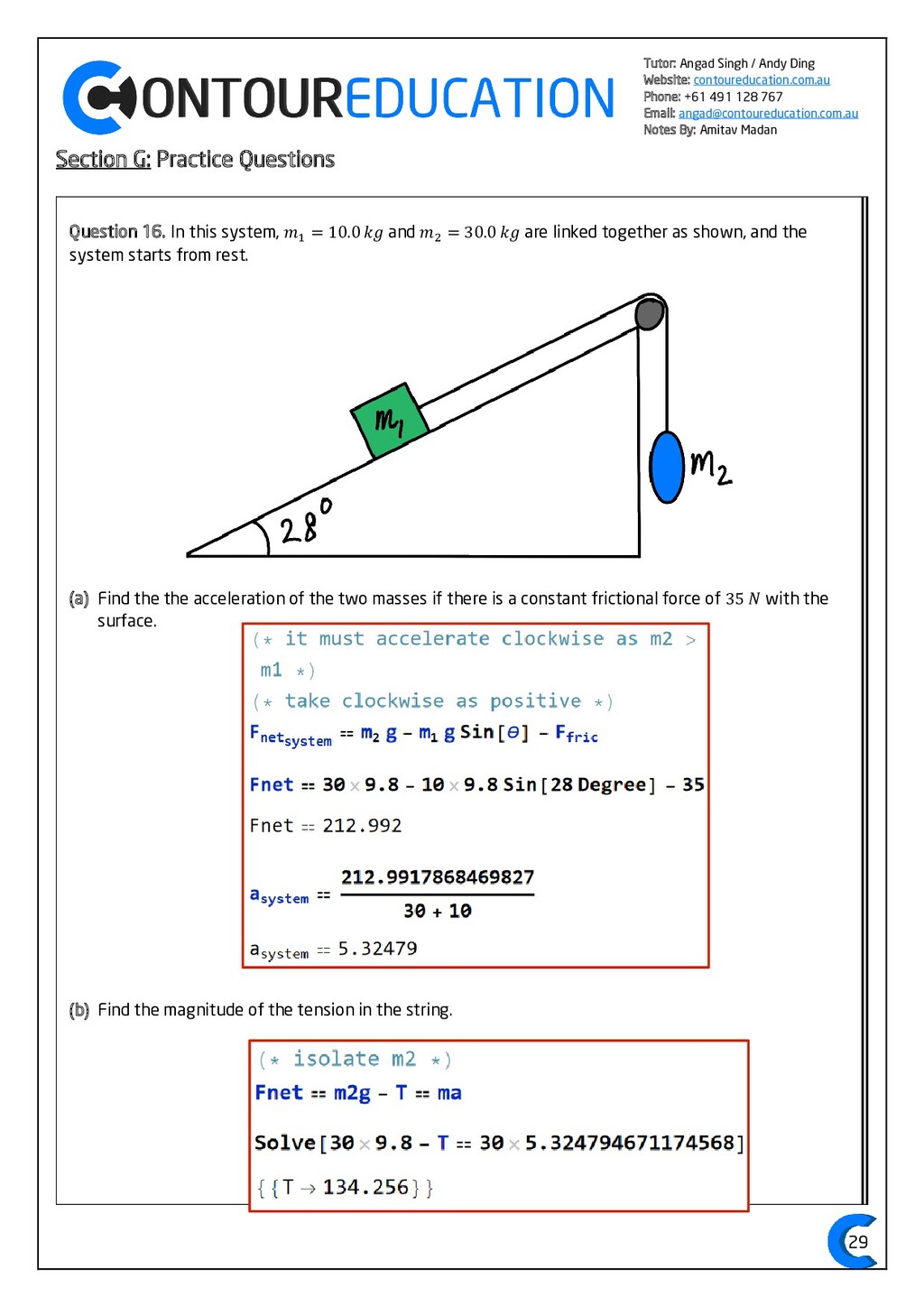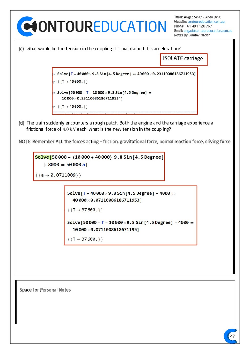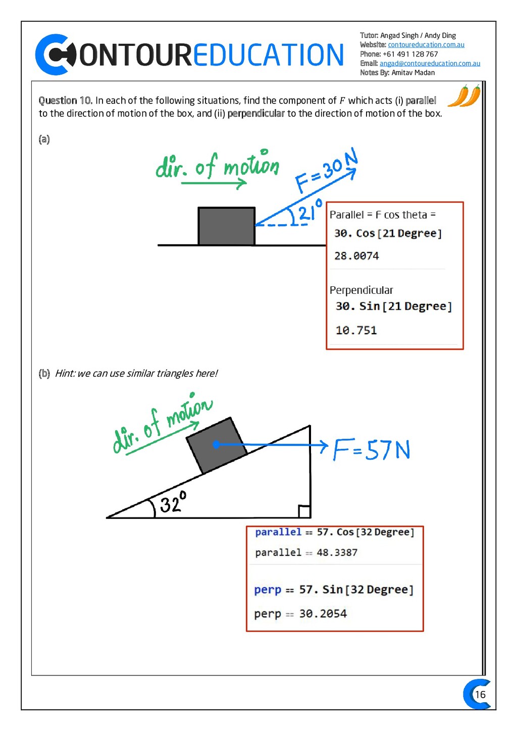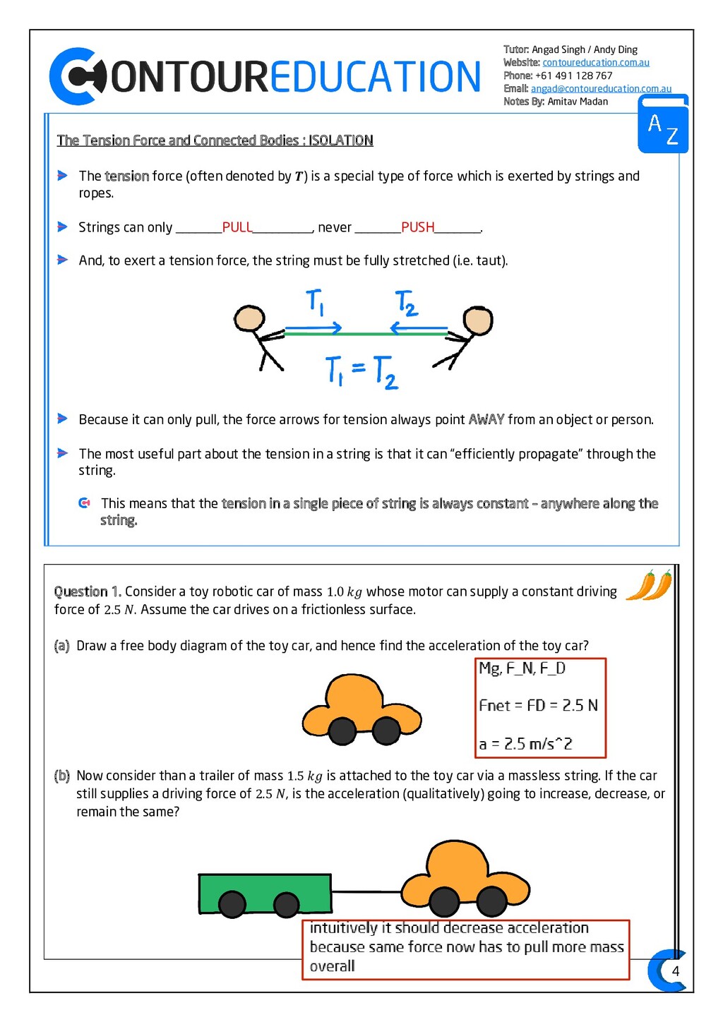 [email protected] Notes By: Amitav Madan 2 Study Design Key Knowledge: How can motion be described and explained? In this area of study students observe motion and explore the effects of balanced and unbalanced forces on motion. They analyse motion using concepts of energy, including energy transfers and transformations, and apply mathematical models during experimental investigations of motion. Students model how the mass of finite objects can be considered to be at a point called the centre of mass. They describe and analyse graphically, numerically and algebraically the motion of an object, using specific physics terminology and conventions. On completion of this unit the student should be able to investigate, analyse and mathematically model the motion of particles and bodies. Forces and motion model the force due to gravity, 𝐹 𝑔, as the force of gravity acting at the centre of mass of a body, 𝐹 𝑔 = 𝑚𝑔, where 𝑔 is the gravitational field strength (9.8 𝑁 𝑘𝑔−1 𝑛𝑒𝑎𝑟 𝑡ℎ𝑒 𝑠𝑢𝑟𝑓𝑎𝑐𝑒 𝑜𝑓 𝐸𝑎𝑟𝑡ℎ) model forces as vectors acting at the point of application (with magnitude and direction), labelling these forces using the convention ‘force on A by B’ or 𝐹𝑜𝑛 𝐴 𝑏𝑦 𝐵 = −𝐹𝑜𝑛 𝐵 𝑏𝑦 𝐴 apply Newton’s three laws of motion to a body on which forces act: 𝑎 = 𝐹𝑛𝑒𝑡 𝑚 , 𝐹𝑜𝑛 𝐴 𝑏𝑦 𝐵 = −𝐹𝑜𝑛 𝐵 𝑏𝑦 𝐴 apply the vector model of forces, including vector addition and components of forces, to readily observable forces including the force due to gravity, friction and reaction forces https://www.vcaa.vic.edu.au/Documents/vce/physics/2016PhysicsSD.pdf#page=43 Key Formulae: 𝒗 = 𝒙 𝒕 𝒗 = 𝒖 + 𝒂𝒕 𝒔 = 𝒖𝒕 + 𝟏 𝟐 𝒂𝒕𝟐 𝒗𝟐 = 𝒖𝟐 + 𝟐𝒂𝒔 𝑠 = (𝑢 + 𝑣)𝑡 2 𝑠 = 𝑣𝑡 − 1 2 𝑎𝑡2 𝑭𝒏𝒆𝒕 = 𝒎𝒂 𝑭𝒈 = 𝒎𝒈 𝑭𝑨 𝒐𝒏 𝑩 = −𝑭𝑩 𝒐𝒏 𝑨 𝒔𝒊𝒏 = 𝒐𝒑𝒑 𝒉𝒚𝒑𝒐 𝒄𝒐𝒔 = 𝒂𝒅𝒋 𝒉𝒚𝒑𝒐 𝒕𝒂𝒏 = 𝒔𝒊𝒏 𝒄𝒐𝒔 = 𝒐𝒑𝒑 𝒂𝒅𝒋
