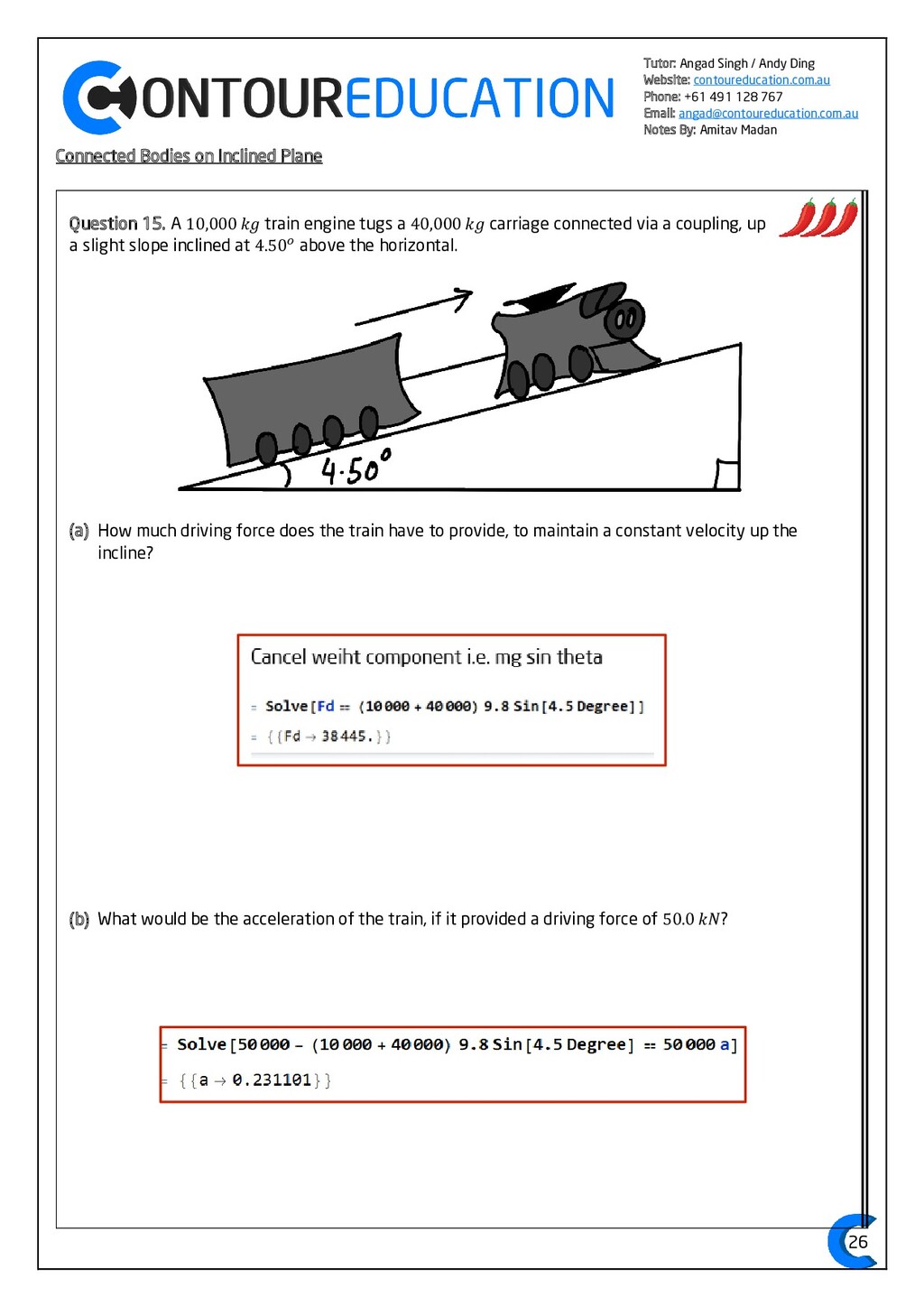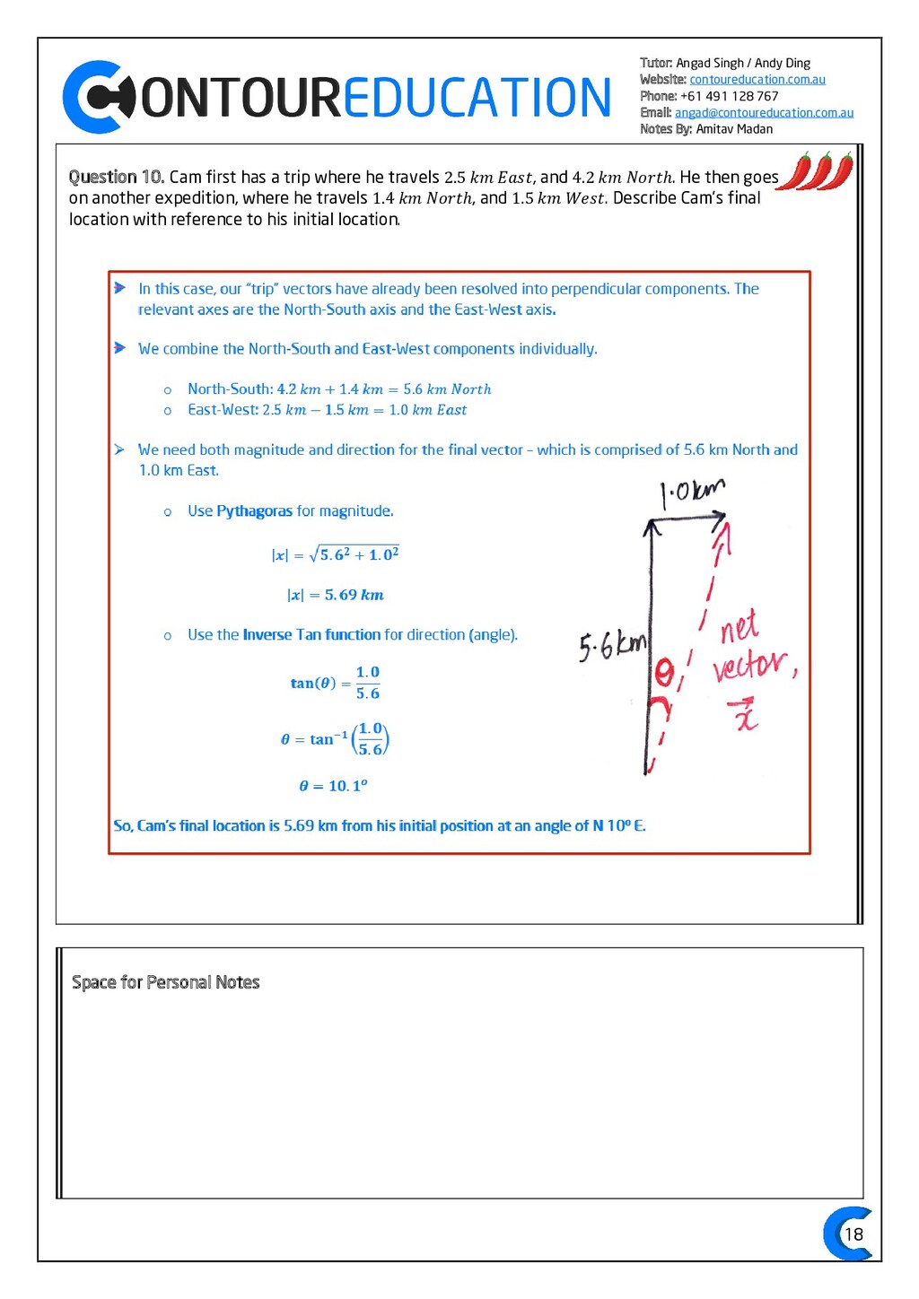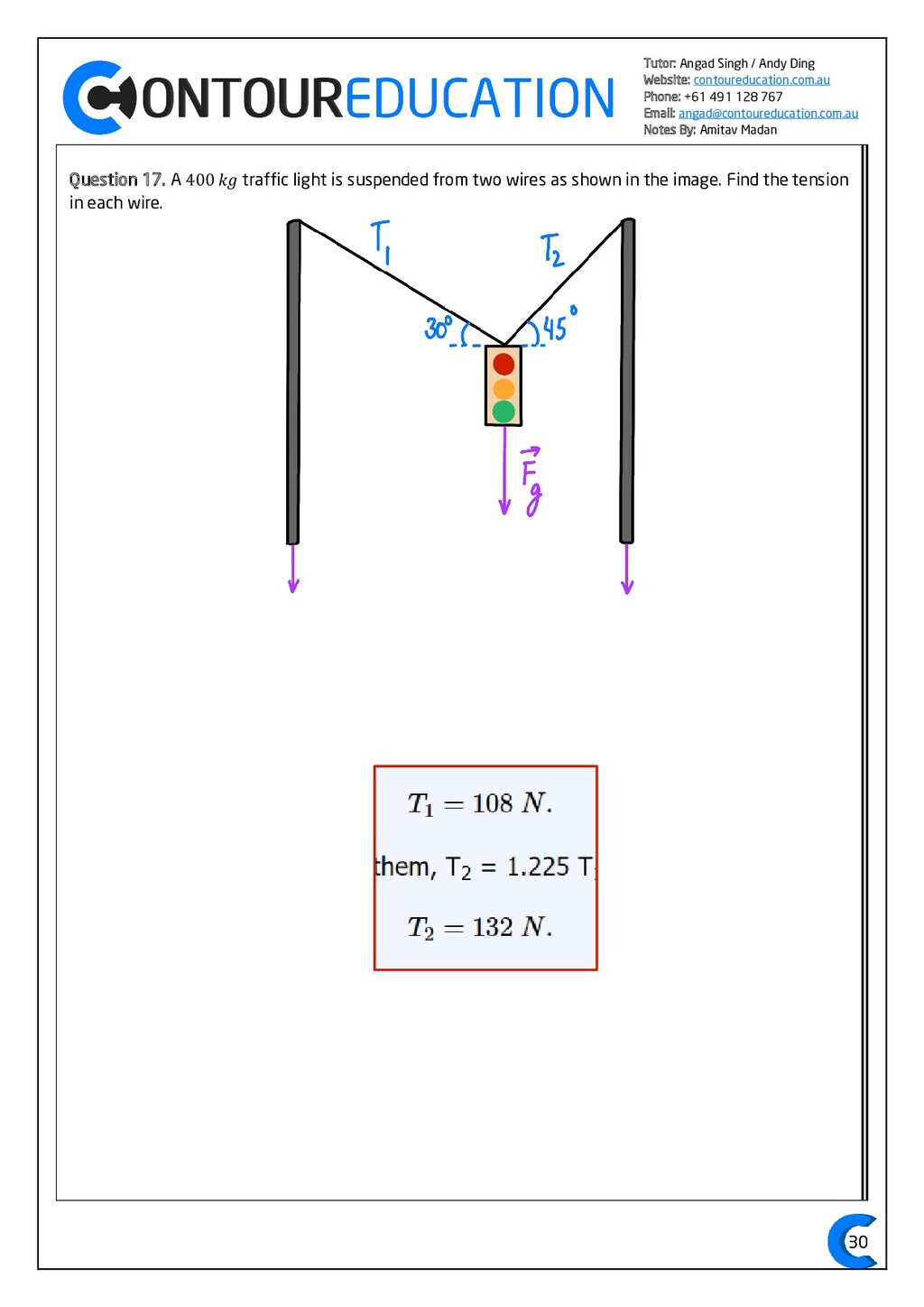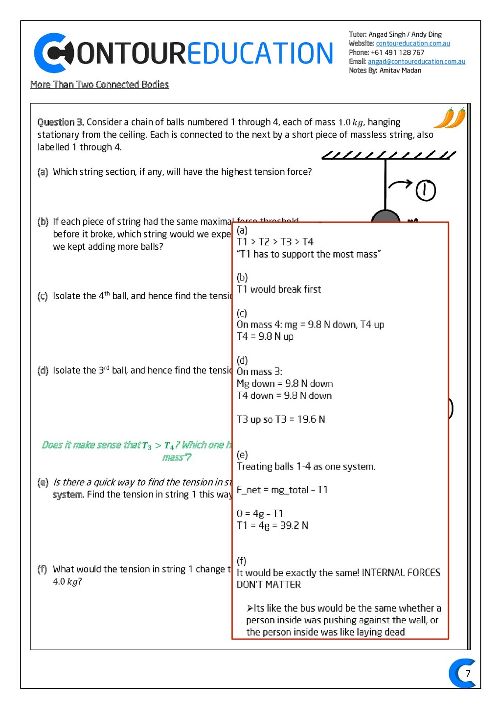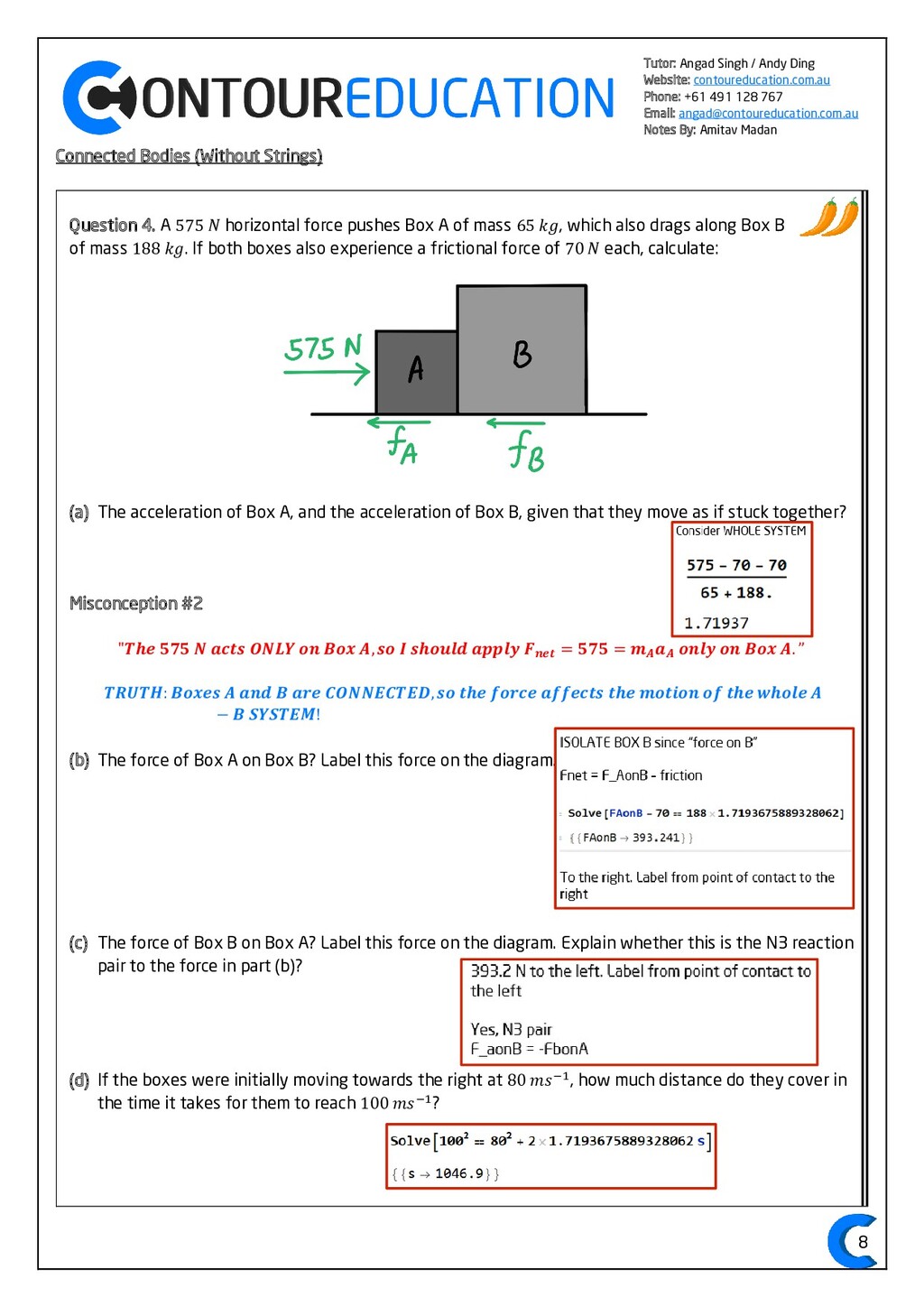 [email protected] Notes By: Amitav Madan 2 Study Design Key Knowledge: How can motion be described and explained? In this area of study students observe motion and explore the effects of balanced and unbalanced forces on motion. They analyse motion using concepts of energy, including energy transfers and transformations, and apply mathematical models during experimental investigations of motion. Students model how the mass of finite objects can be considered to be at a point called the centre of mass. They describe and analyse graphically, numerically and algebraically the motion of an object, using specific physics terminology and conventions. On completion of this unit the student should be able to investigate, analyse and mathematically model the motion of particles and bodies. Forces and motion model the force due to gravity, 𝐹 𝑔, as the force of gravity acting at the centre of mass of a body, 𝐹 𝑔 = 𝑚𝑔, where 𝑔 is the gravitational field strength (9.8 𝑁 𝑘𝑔−1 𝑛𝑒𝑎𝑟 𝑡ℎ𝑒 𝑠𝑢𝑟𝑓𝑎𝑐𝑒 𝑜𝑓 𝐸𝑎𝑟𝑡ℎ) model forces as vectors acting at the point of application (with magnitude and direction), labelling these forces using the convention ‘force on A by B’ or 𝐹𝑜𝑛 𝐴 𝑏𝑦 𝐵 = −𝐹𝑜𝑛 𝐵 𝑏𝑦 𝐴 apply Newton’s three laws of motion to a body on which forces act: 𝑎 = 𝐹𝑛𝑒𝑡 𝑚 , 𝐹𝑜𝑛 𝐴 𝑏𝑦 𝐵 = −𝐹𝑜𝑛 𝐵 𝑏𝑦 𝐴 apply the vector model of forces, including vector addition and components of forces, to readily observable forces including the force due to gravity, friction and reaction forces https://www.vcaa.vic.edu.au/Documents/vce/physics/2016PhysicsSD.pdf#page=43 Key Formulae: 𝒗 = 𝒙 𝒕 𝒗 = 𝒖 + 𝒂𝒕 𝒔 = 𝒖𝒕 + 𝟏 𝟐 𝒂𝒕𝟐 𝒗𝟐 = 𝒖𝟐 + 𝟐𝒂𝒔 𝑠 = (𝑢 + 𝑣)𝑡 2 𝑠 = 𝑣𝑡 − 1 2 𝑎𝑡2 𝑭𝒏𝒆𝒕 = 𝒎𝒂 𝑭𝒈 = 𝒎𝒈 𝑭𝑨 𝒐𝒏 𝑩 = −𝑭𝑩 𝒐𝒏 𝑨 𝒔𝒊𝒏 = 𝒐𝒑𝒑 𝒉𝒚𝒑𝒐 𝒄𝒐𝒔 = 𝒂𝒅𝒋 𝒉𝒚𝒑𝒐 𝒕𝒂𝒏 = 𝒔𝒊𝒏 𝒄𝒐𝒔 = 𝒐𝒑𝒑 𝒂𝒅𝒋