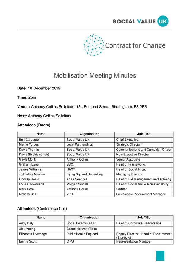 programme at any time and flex their contribution to align to working commitments. The programme will be transparent, and evidence based. The CfC website will be launched in the New Year and we will utilise LinkedIn, Steering Groups networks and SVUK network as communication channels, with additional support from Steering Group member networks i.e. CIPS & IACCM. The hashtag for any social media posts is #ContractForChange. Working collaboratively, we will be co-creating and refining the programme and supporting workstreams on an ongoing basis. Differing views and open conversations are welcomed to aide discussions however the information shared will be managed appropriately to not inadvertently effect any members of the Steering Group or Working Groups. 3 Scope, Purpose and Outcomes Total third-party expenditure across the Public Sector is approximately £280B covering Central Government, Devolved Administrations, Education, Local Government, NHS and Third Sector CfC seeks to maximise the social value created by organisations or sectors by ensuring procurement and commissioning reflect the organisations social value priorities into the functions strategic approach, policies and operations CfC will provide direction in how to position, plan, operate, and provide for the creation of greater social value by organisations The group reviewed the outcomes shared ideas on content/missing outcomes as outlined below. • Potential to include a ‘catalogue’ of Social Value outcomes to support practitioners • Ensure Social Value outcomes translate into contractual documentation, how it is valued and how is it measured by the buying organisation. (Part outcome 1) • Provide the tools, techniques and training to support. (Cuts across all outcomes/workstreams) • Develop and publish a common approach to definitions/language (Part of outcome 1)