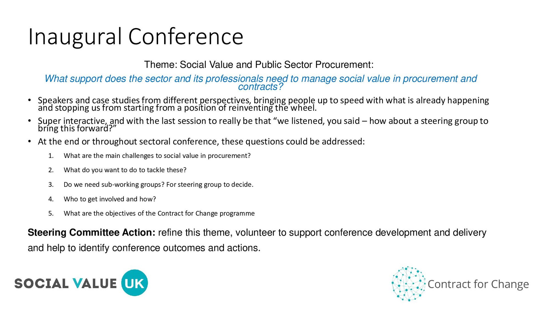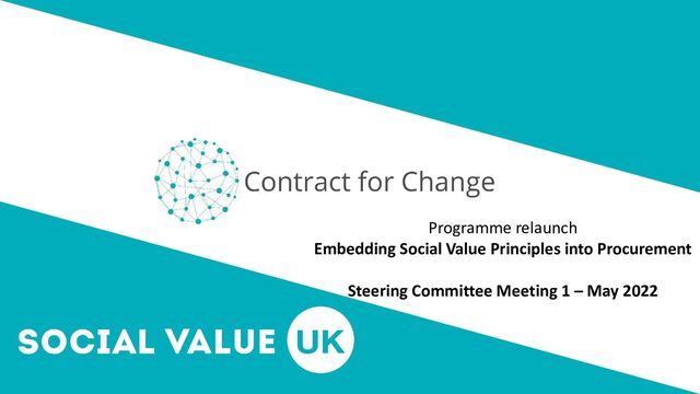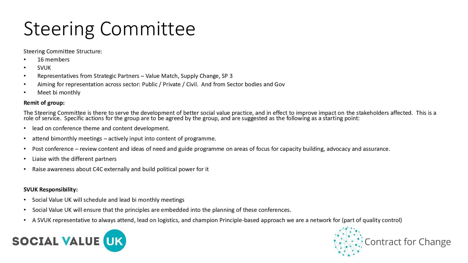 • Representatives from Strategic Partners – Value Match, Supply Change, SP 3 • Aiming for representation across sector: Public / Private / Civil. And from Sector bodies and Gov • Meet bi monthly Remit of group: The Steering Committee is there to serve the development of better social value practice, and in effect to improve impact on the stakeholders affected. This is a role of service. Specific actions for the group are to be agreed by the group, and are suggested as the following as a starting point: • lead on conference theme and content development. • attend bimonthly meetings – actively input into content of programme. • Post conference – review content and ideas of need and guide programme on areas of focus for capacity building, advocacy and assurance. • Liaise with the different partners • Raise awareness about C4C externally and build political power for it SVUK Responsibility: • Social Value UK will schedule and lead bi monthly meetings • Social Value UK will ensure that the principles are embedded into the planning of these conferences. • A SVUK representative to always attend, lead on logistics, and champion Principle-based approach we are a network for (part of quality control)