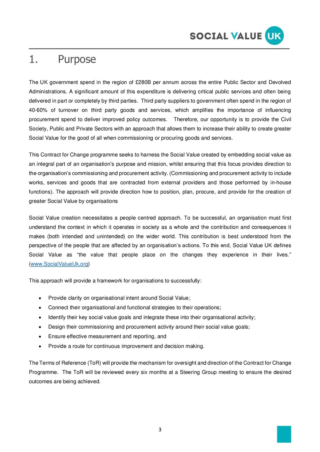 of £280B per annum across the entire Public Sector and Devolved Administrations. A significant amount of this expenditure is delivering critical public services and often being delivered in part or completely by third parties. Third party suppliers to government often spend in the region of 40-60% of turnover on third party goods and services, which amplifies the importance of influencing procurement spend to deliver improved policy outcomes. Therefore, our opportunity is to provide the Civil Society, Public and Private Sectors with an approach that allows them to increase their ability to create greater Social Value for the good of all when commissioning or procuring goods and services. This Contract for Change programme seeks to harness the Social Value created by embedding social value as an integral part of an organisation’s purpose and mission, whilst ensuring that this focus provides direction to the organisation’s commissioning and procurement activity. (Commissioning and procurement activity to include works, services and goods that are contracted from external providers and those performed by in-house functions). The approach will provide direction how to position, plan, procure, and provide for the creation of greater Social Value by organisations Social Value creation necessitates a people centred approach. To be successful, an organisation must first understand the context in which it operates in society as a whole and the contribution and consequences it makes (both intended and unintended) on the wider world. This contribution is best understood from the perspective of the people that are affected by an organisation’s actions. To this end, Social Value UK defines Social Value as “the value that people place on the changes they experience in their lives.” (www.SocialValueUk.org) This approach will provide a framework for organisations to successfully: • Provide clarity on organisational intent around Social Value; • Connect their organisational and functional strategies to their operations; • Identify their key social value goals and integrate these into their organisational activity; • Design their commissioning and procurement activity around their social value goals; • Ensure effective measurement and reporting, and • Provide a route for continuous improvement and decision making. The Terms of Reference (ToR) will provide the mechanism for oversight and direction of the Contract for Change Programme. The ToR will be reviewed every six months at a Steering Group meeting to ensure the desired outcomes are being achieved.