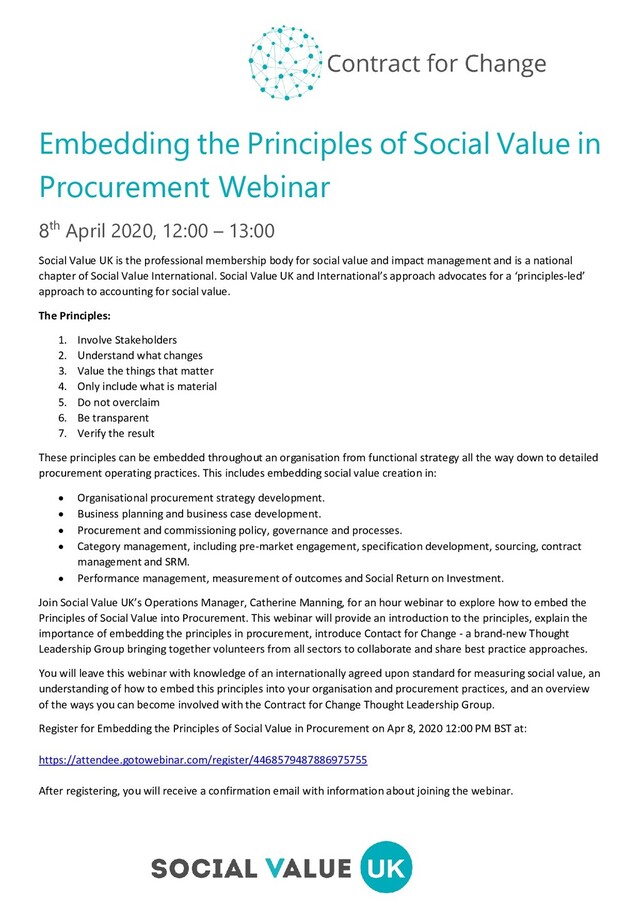 April 2020, 12:00 – 13:00 Social Value UK is the professional membership body for social value and impact management and is a national chapter of Social Value International. Social Value UK and International’s approach advocates for a ‘principles-led’ approach to accounting for social value. The Principles: 1. Involve Stakeholders 2. Understand what changes 3. Value the things that matter 4. Only include what is material 5. Do not overclaim 6. Be transparent 7. Verify the result These principles can be embedded throughout an organisation from functional strategy all the way down to detailed procurement operating practices. This includes embedding social value creation in: • Organisational procurement strategy development. • Business planning and business case development. • Procurement and commissioning policy, governance and processes. • Category management, including pre-market engagement, specification development, sourcing, contract management and SRM. • Performance management, measurement of outcomes and Social Return on Investment. Join Social Value UK’s Operations Manager, Catherine Manning, for an hour webinar to explore how to embed the Principles of Social Value into Procurement. This webinar will provide an introduction to the principles, explain the importance of embedding the principles in procurement, introduce Contact for Change - a brand-new Thought Leadership Group bringing together volunteers from all sectors to collaborate and share best practice approaches. You will leave this webinar with knowledge of an internationally agreed upon standard for measuring social value, an understanding of how to embed this principles into your organisation and procurement practices, and an overview of the ways you can become involved with the Contract for Change Thought Leadership Group. Register for Embedding the Principles of Social Value in Procurement on Apr 8, 2020 12:00 PM BST at: https://attendee.gotowebinar.com/register/4468579487886975755 After registering, you will receive a confirmation email with information about joining the webinar.