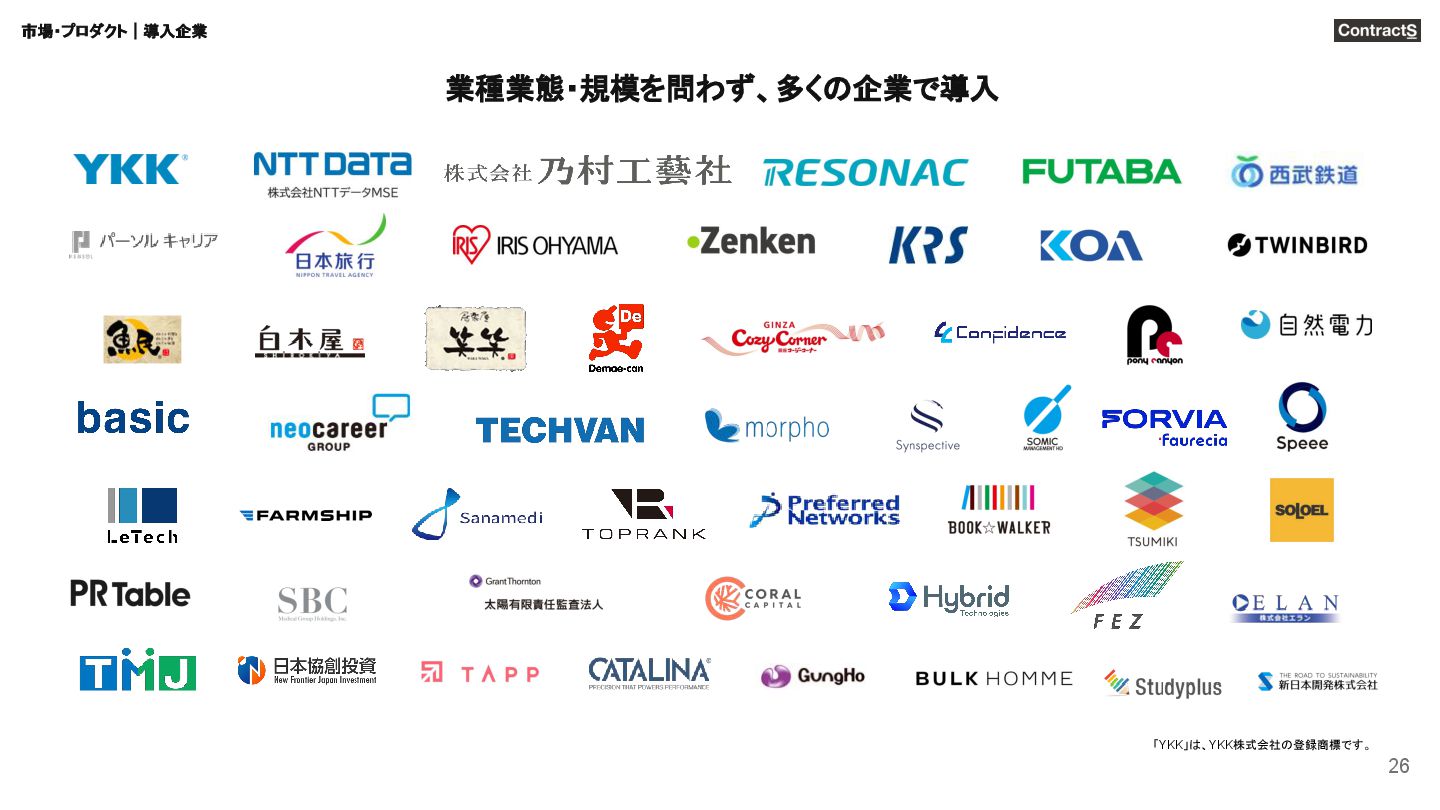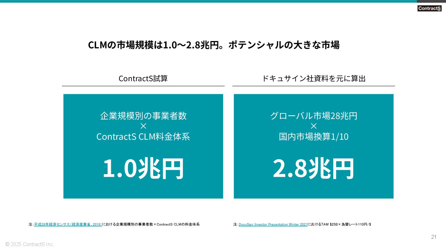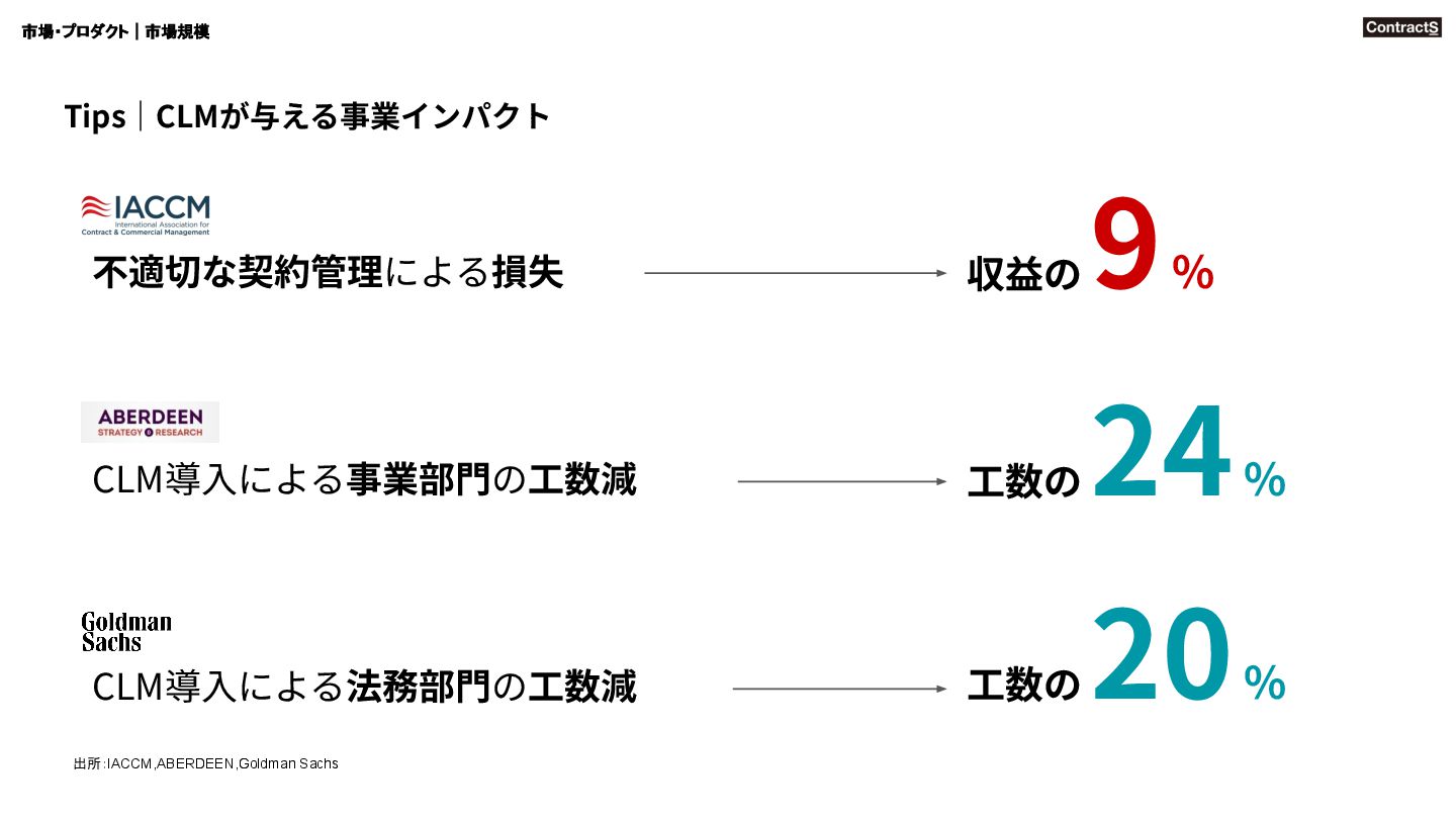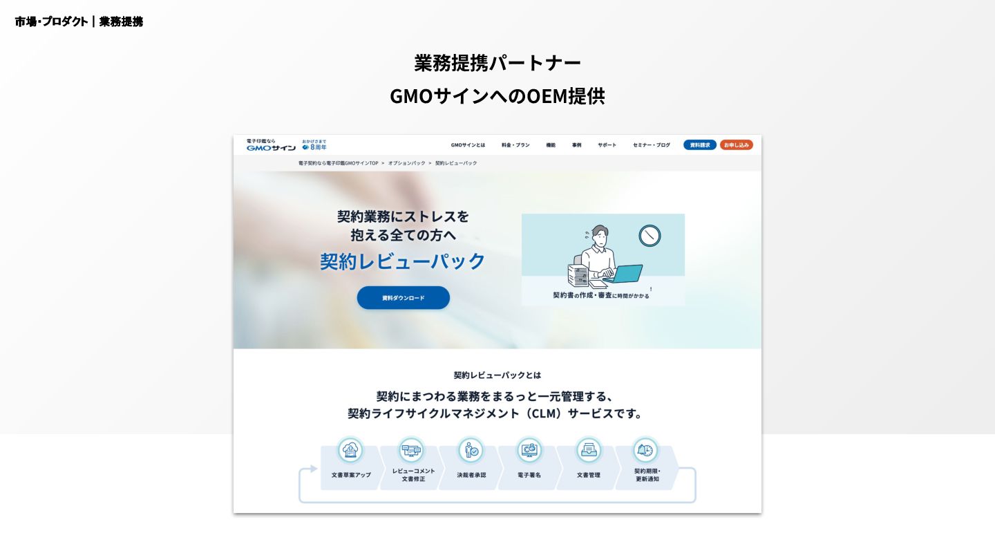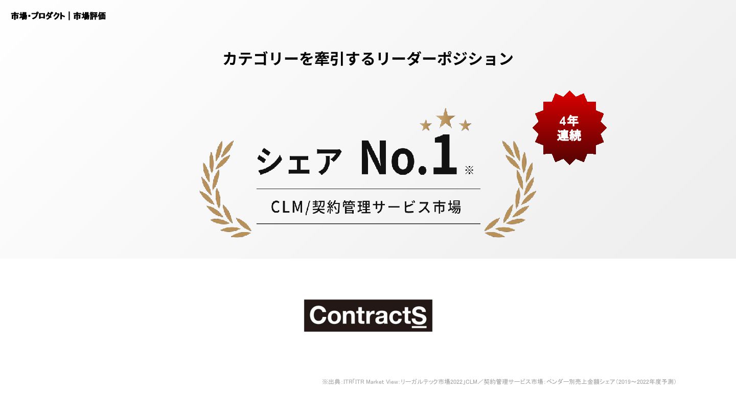 2,000億円超 年平均成⻑率 12% Icertis社 Ironclad社 ユニコーン企業に ※1 CLM=Contract Lifecycle Management =契約書に関連して社内外で発⽣する⼀連のライフサイクルを対象としたソリューション ※2 Contract Lifecycle Management Software Market: Global Industry Trends, Share, Size, Growth, Opportunity and Forecast 2021-2026 (2021) https://www.researchandmarkets.com/reports/5264072/contract-lifecycle-management-software-market 市場・プロダクト|市場規模