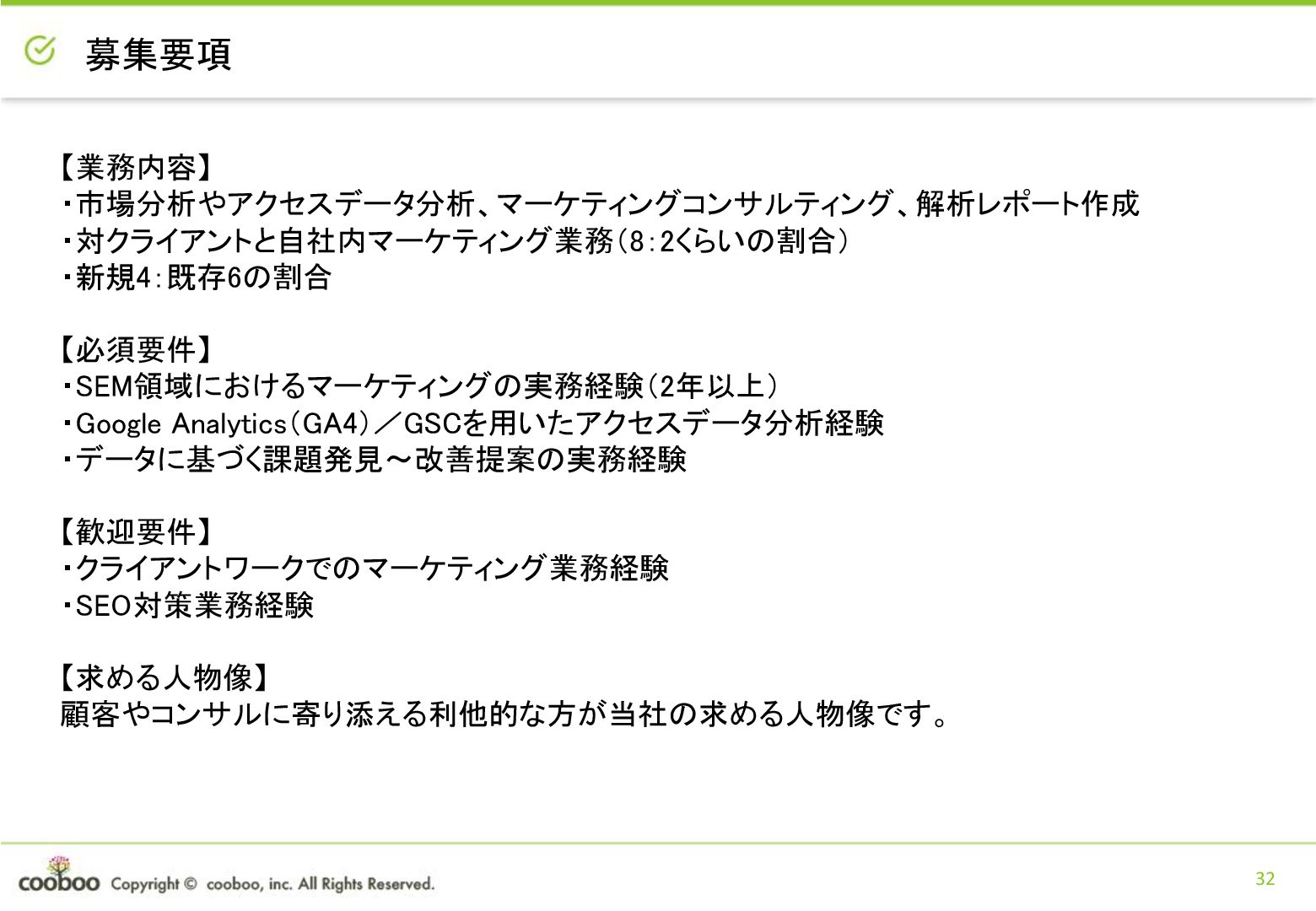 32 【業務内容】 ・市場分析やアクセスデータ分析、マーケティングコンサルティング、解析レポート作成