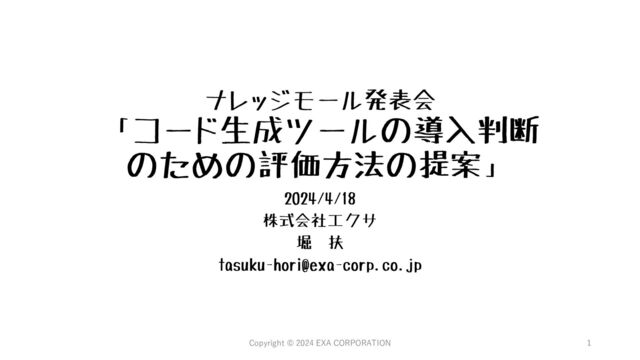 GPTを使ったコード生成API、IDEのプラグイン経由で コード生成支援に使われる - - 2023年3月、Codexモデルは非推奨に(2023/4/24 時点のDocumentationトッ プ) Microsoft Codex GPT-3シリーズの後継Code-Cushmanモデルを使ったコード生 成API、IDEのプラグイン経由で使用する事ができる。 Azure無償枠内 での使用 0.024ドル/1000 トークン 価格は2023/4/24時点、米国西部2リージョン(日本リージョンは選択でき なかった) GitHub Copilot OpenAI Codexをもとにしたコード生成API、IDEのプラグイン 経由でコード生成支援に使われる 30日間 Indivisuals:10ド ル/月 Business:19ド ル/月 Business版を使うと提案要求時に自コードが送信されるが、提案返信時に破 棄される。Indivisual版の場合コードスニペット(ソース、関連ファイル、同 時に開いている別のファイル、リポジトリURL、ファイルパスなど)が収 集・保持される可能性がある。 Google Bard 2023/3/24にアナウンスされたGoogle社のChatGPTに相当する APIおよび活用したサービス、日本でも利用可能とのこと(日 本語性能は高くないという二次情報あり) 要順番待ちリス ト登録 N/A ※2023/4/24時点では、順番待ちリストに参加可能 Amazon CodeWhisperer AWS提供のコード生成サービス、IDEから利用する Individual Professional 19 ドル/月 Pro版は組織単位のポリシー管理(ex. OSSコードに類似する生成を許可する か)が可能 BigCode santacoder HuggingFaceに登録された学習済みモデル(GPT-2ベース)、 ローカルPCで動作可能 OSS - CodeML Open RAIL-M v0.1ライセンス準拠 ※2023/4/27時点 テーマ選定の背景 Copyright © 2024 EXA CORPORATION 5