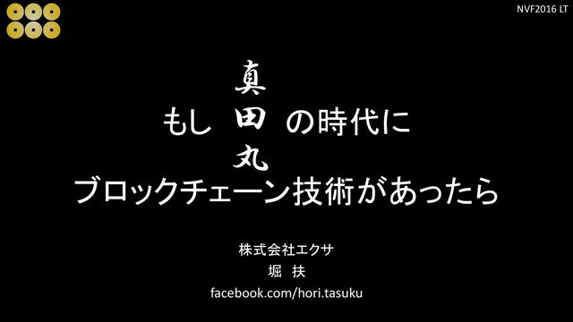 [Link] Getting started with IBM Blockchain / Bluemix内資料 • [Link] IBM-Blockchain/ibm-blockchain-js • Bluemix上のBlockchainのAPIを操作可能なJavaScriptライブラリ • ただしWebSocketでfirewallデフォルトでは通れないポートを使う • [論文] Bitcoin: A Peer-to-Peer Electronic Cash System / 中本哲史 • 日本語訳有り。前提知識をそれなりに入れないと理解できない • なぜブロックチェーンが溢れないかはマークルツリーを使っているから • [Kindle] ビットコインとは何か / 大石哲之 • ビットコインに関する基礎中の基礎、ワンコインで理解できる • [Kindle] ビットコインとはどのようにして動いているのか / 大石哲之 • なぜ1対1の通信で相手が嘘言っているかわかるか、をきちんと理解したい人向け • [Link] 登場人物 人物相関図 / NHK 真田丸 公式サイト • 写真、お借りました、スミマセン.. • [Link] パペットマンについて、思いを馳せる • 写真、お借りしました、スミマセン… 株式会社エクサと 一個人 堀 扶は、 NHK大河ドラマ 真田丸 を応援しています!