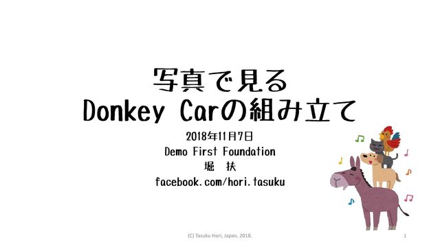 7.2V1100mAH (-) (+) DC-DC 5V/2A 電圧コンバータ U S B Raspberry Pi 3B + Donkey イメージv2.5.0 T y p e B サーボ モータ (操舵) PCA9685搭載16ch サーボドライバ ch0 ch1 (白) (白) (GND) (GND) (SCL) (SDA) (VCC) (3.3V) (抵抗付きGPIO2) (抵抗付きGPIO1) (白) (給電) ワイドアングル Raspberry Pi カメラ (帯状ケーブル) (via SSH/WiFi) (ジャンパ:NiMh) (C) Tasuku Hori, Japan, 2018. 26